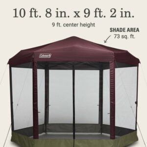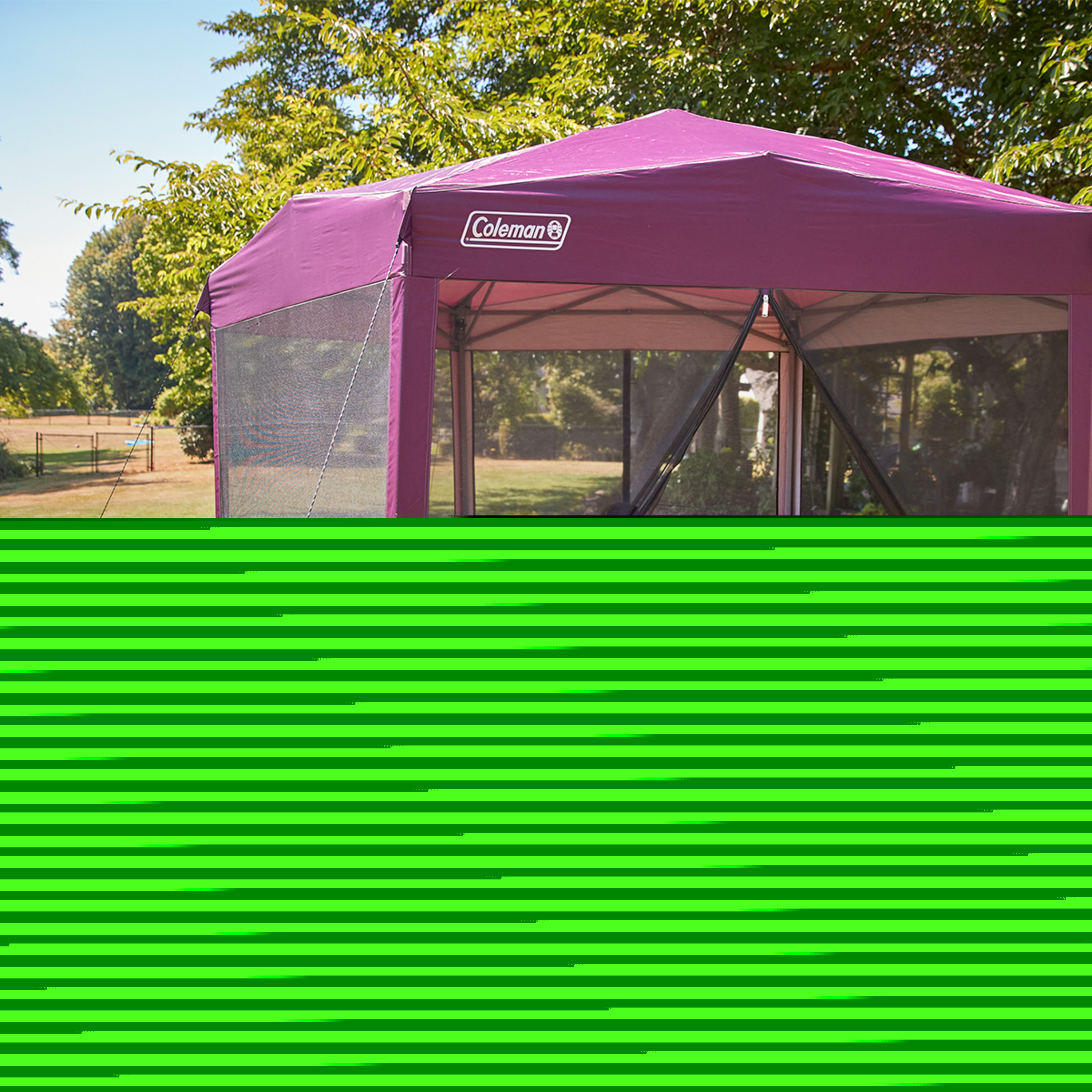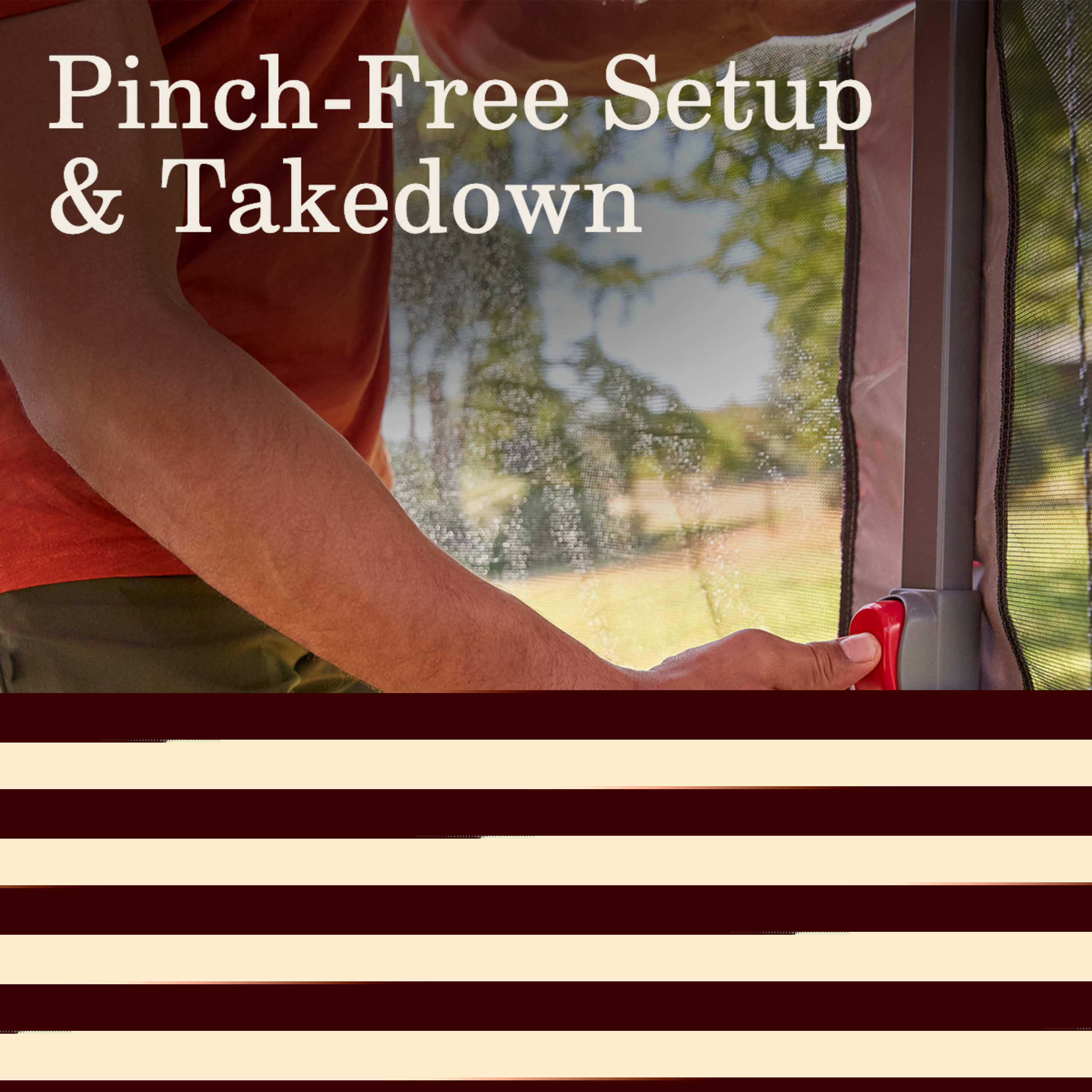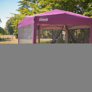 Bring on the bug-free outdoor adventures with the Coleman Back Home screen canopy tents. Lounging with the family in the backyard or hanging with friends in the park The Coleman Back Home 10.5 x 9 Screen Tent sets up easy using a one-push center hub with OnePeak technology. We made sure the screen tent fits over a picnic table so you can eat inside the enclosed mesh walls without the pests. Plus, the 2 entryways let you move all your gear in and out easily. The robust steel frame withstands winds up to 35 mph when the canopy is fully staked and the Comfort Grip pinch-free buttons make it easy to set up and take down. UPF 50+ sun protection helps block sun s harmful UV rays and overhanging eaves provide even more shade. When it s time to go, the wheeled carry bag makes it easy to pack up and go.