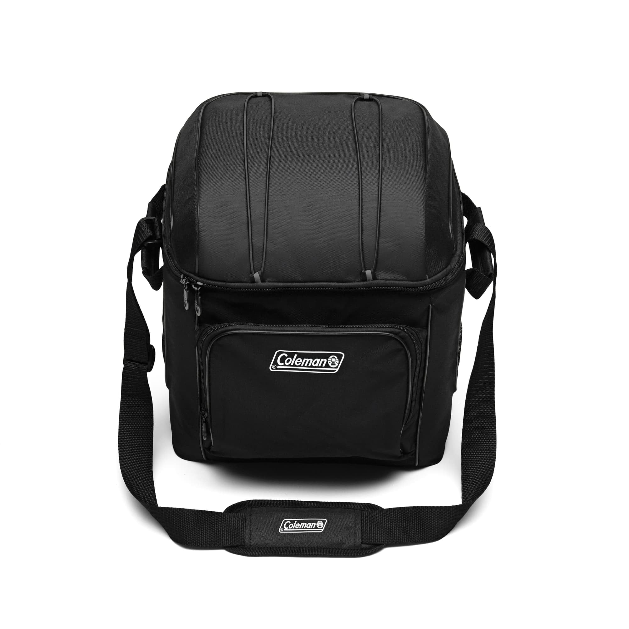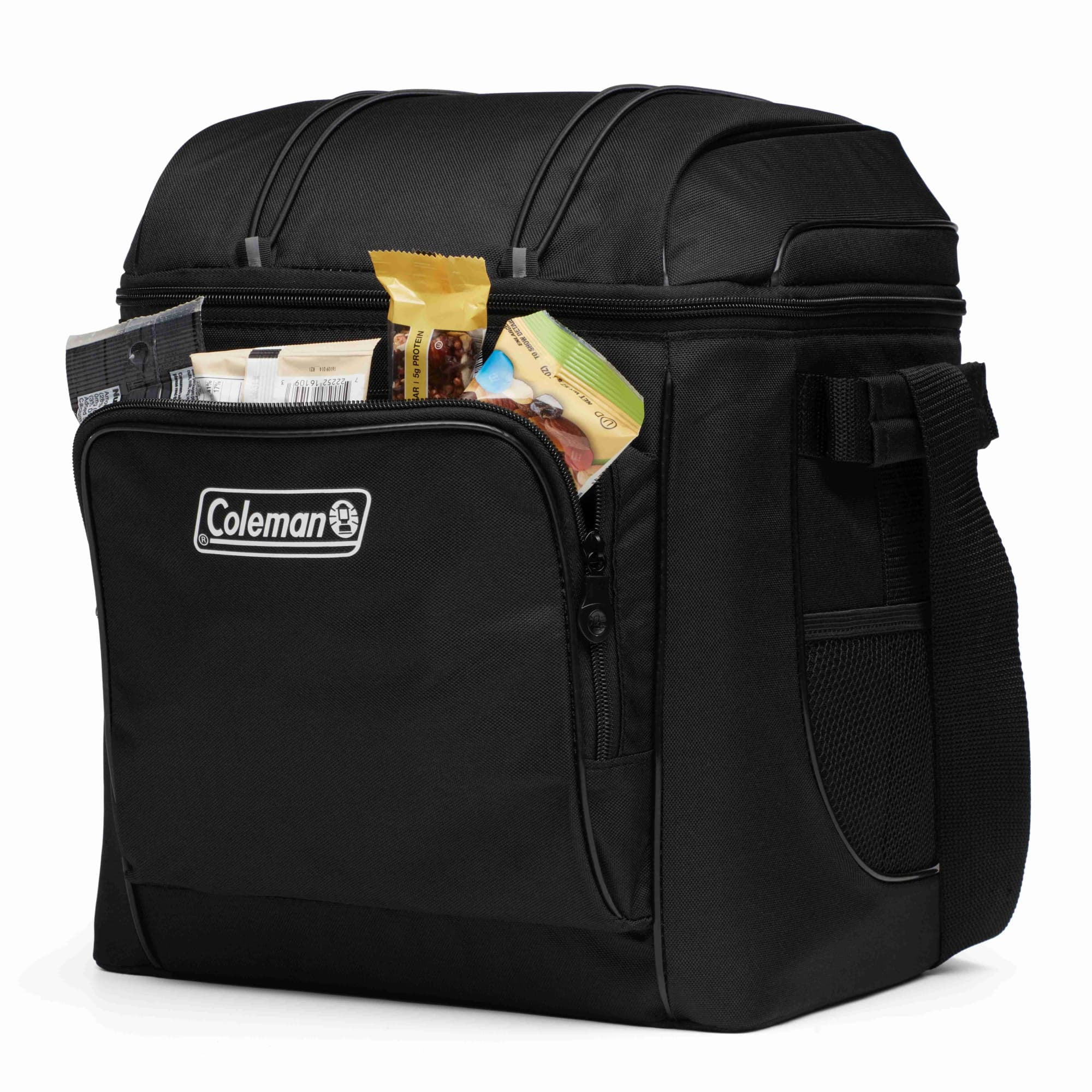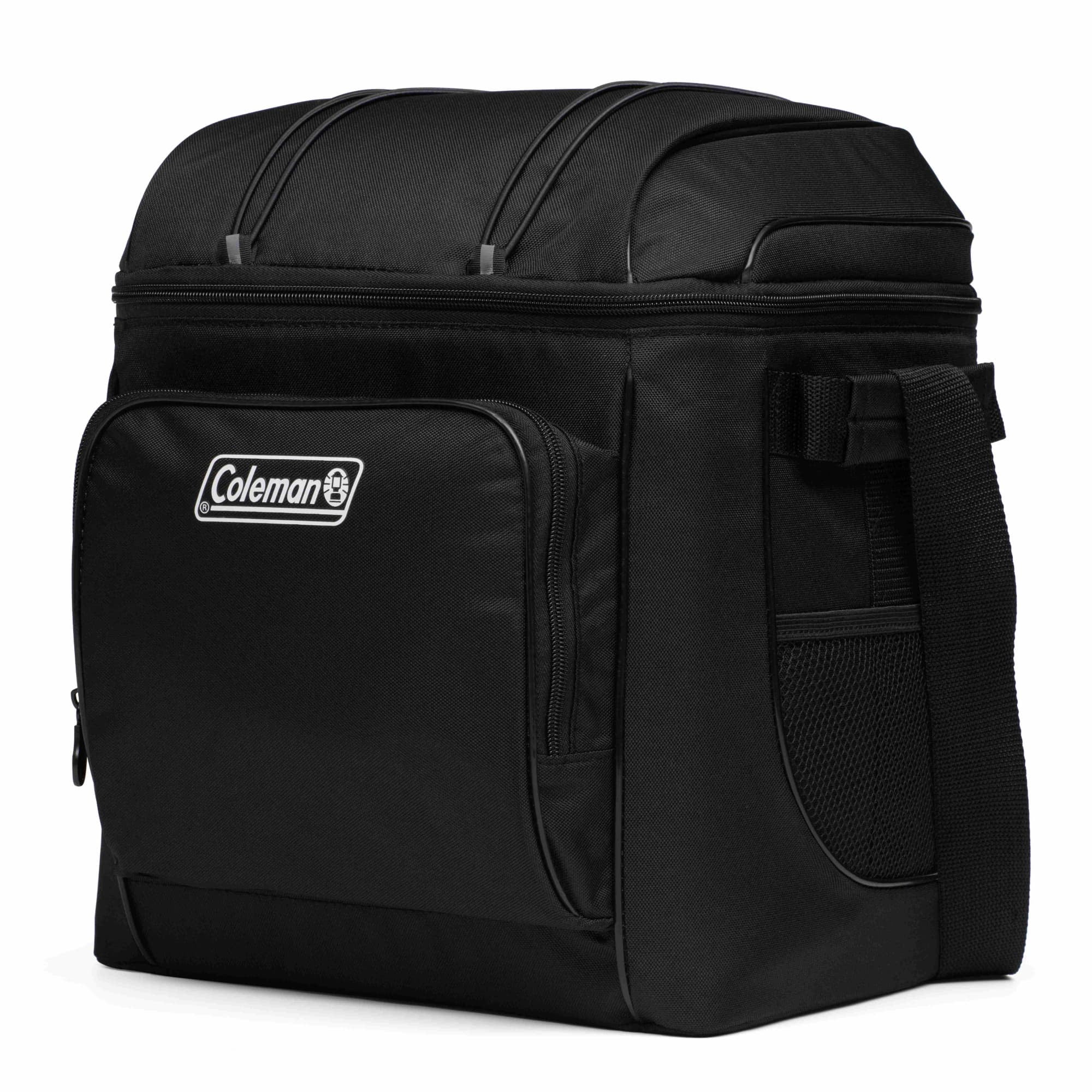 Coleman CHILLER 30-Can Insulated Soft Cooler Bag, Black: Adjustable padded sling strap and padded side handles for easy transport zippered front and inside mesh pockets for storing ice packs and other extras Exterior fabric is made from recycled polyester fibers TempLock™ Insulation keeps food and drinks cold for 12 hours or more Antimicrobial* and stain-resistant hard plastic liner helps prevent odor, mildew, and mold and is removable for quick cleanup Welded seams prevent leaks Holds up to 30 cans
