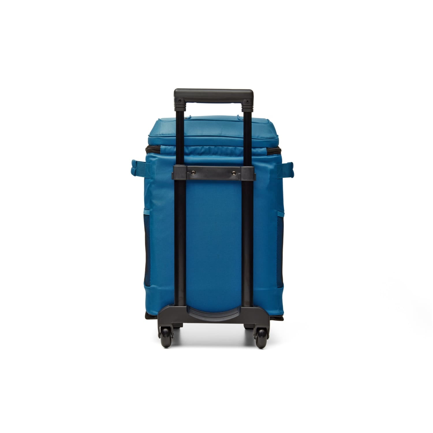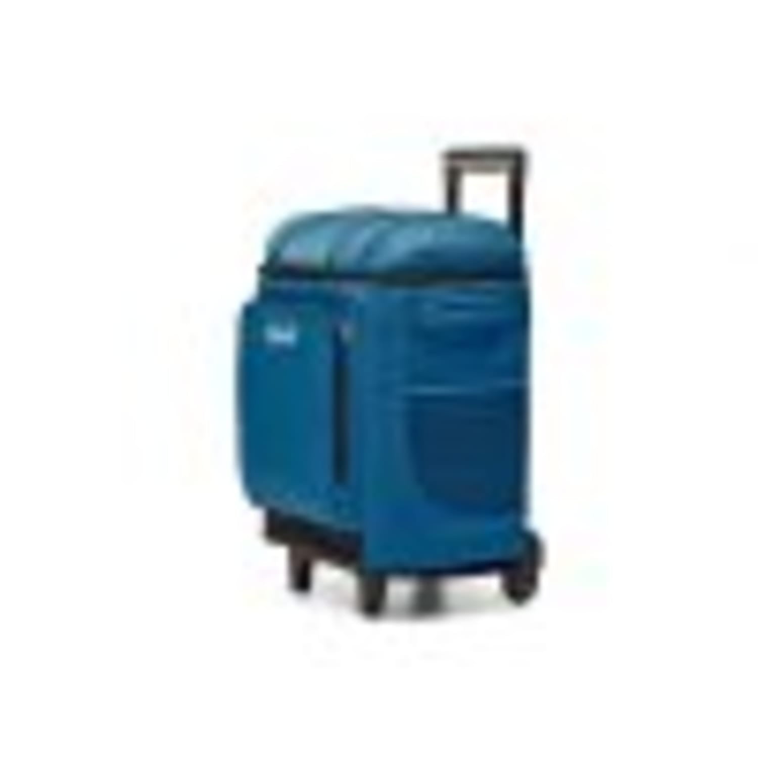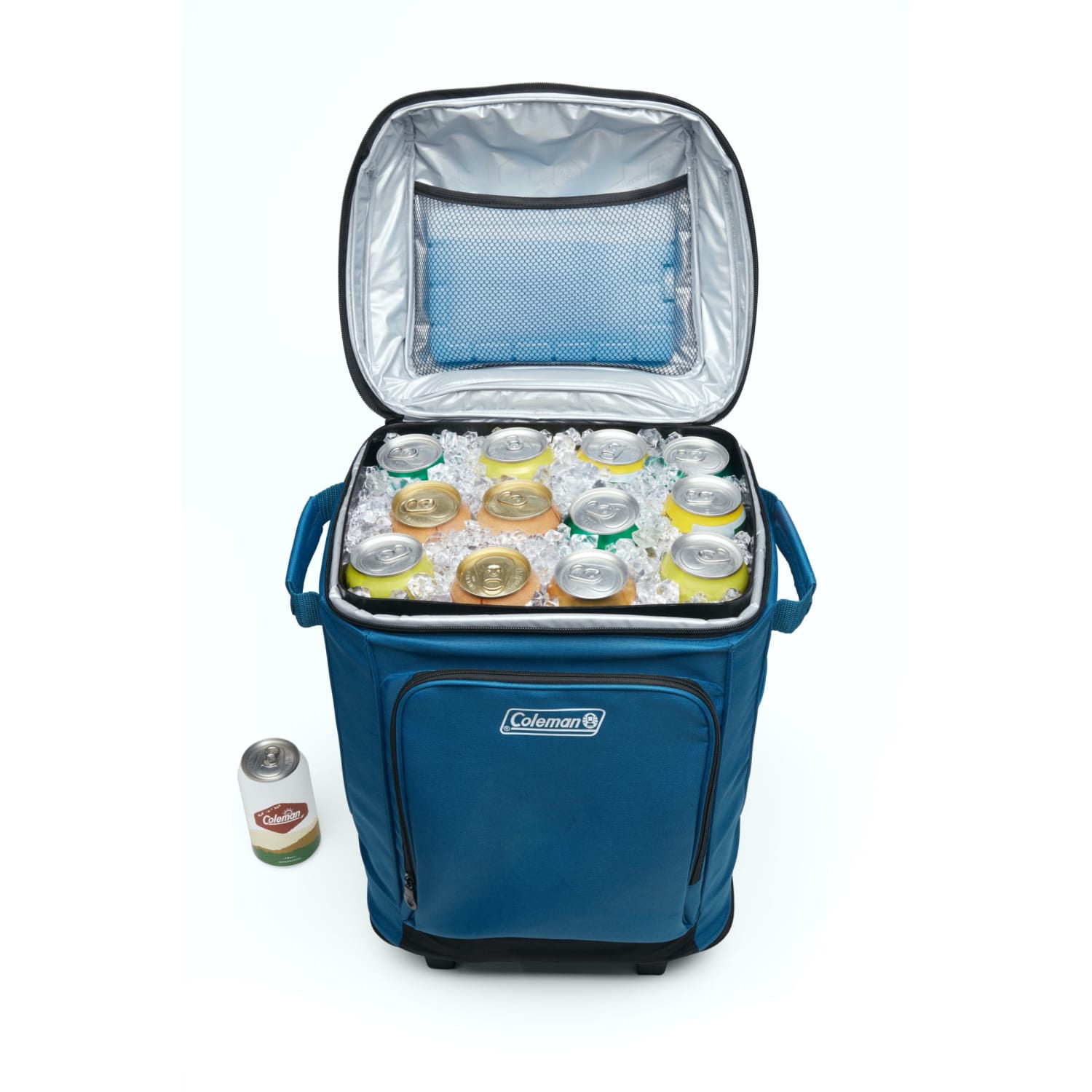 Coleman CHILLER 42-Can Insulated Soft Cooler Bag with Wheels, Ocean: Telescoping handle and durable wheels for easy transport; zippered front and inside mesh pockets for storing ice packs and other extras Exterior fabric is made from recycled polyester fibers TempLock™ Insulation keeps food and drinks cold for 12 hours or more Antimicrobial* and stain-resistant hard plastic liner helps prevent odor, mildew, and mold and is removable for quick cleanup Welded seams prevent leaks Holds up to 42 cans