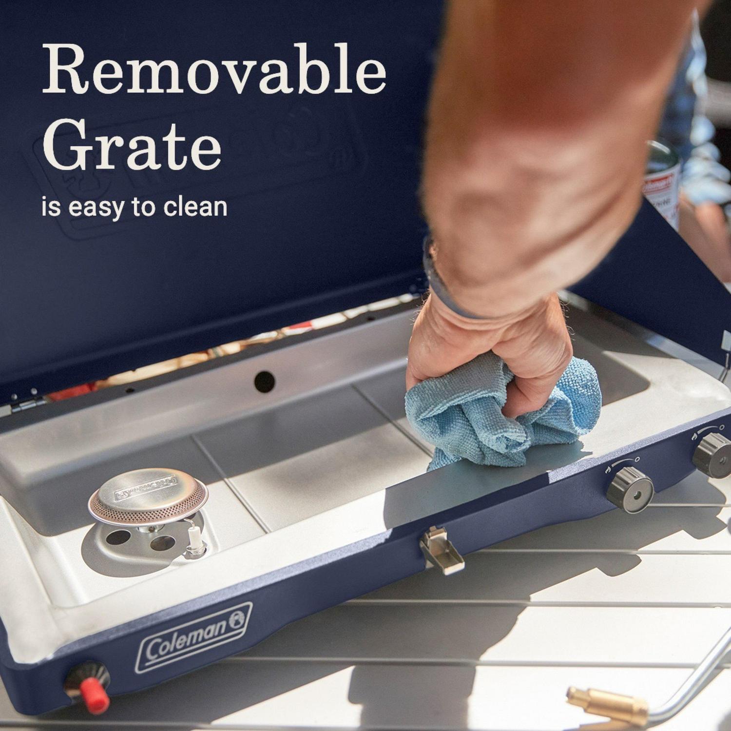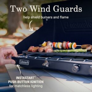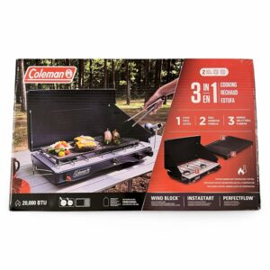 Hit the road with a Coleman Classic 3-in-1 Camping Stove which makes it easy to cook great meals outdoors. Its cast-iron grill and griddle accessory stores under the lid so the stove is easy to move, and its removable chrome-plated grate makes cleanup quick. Because we know cooking out in the elements can be rough, this stove has two guards to shield the burners and flame from wind, as well a push-button Instastart ignition for automatic, matchless lighting. The best parts This stove has 20,000 BTUs of cooking power and comes with a removable cast-iron grill and griddle accessory so you can whip up a variety of good food that’ll seriously hit the spot.