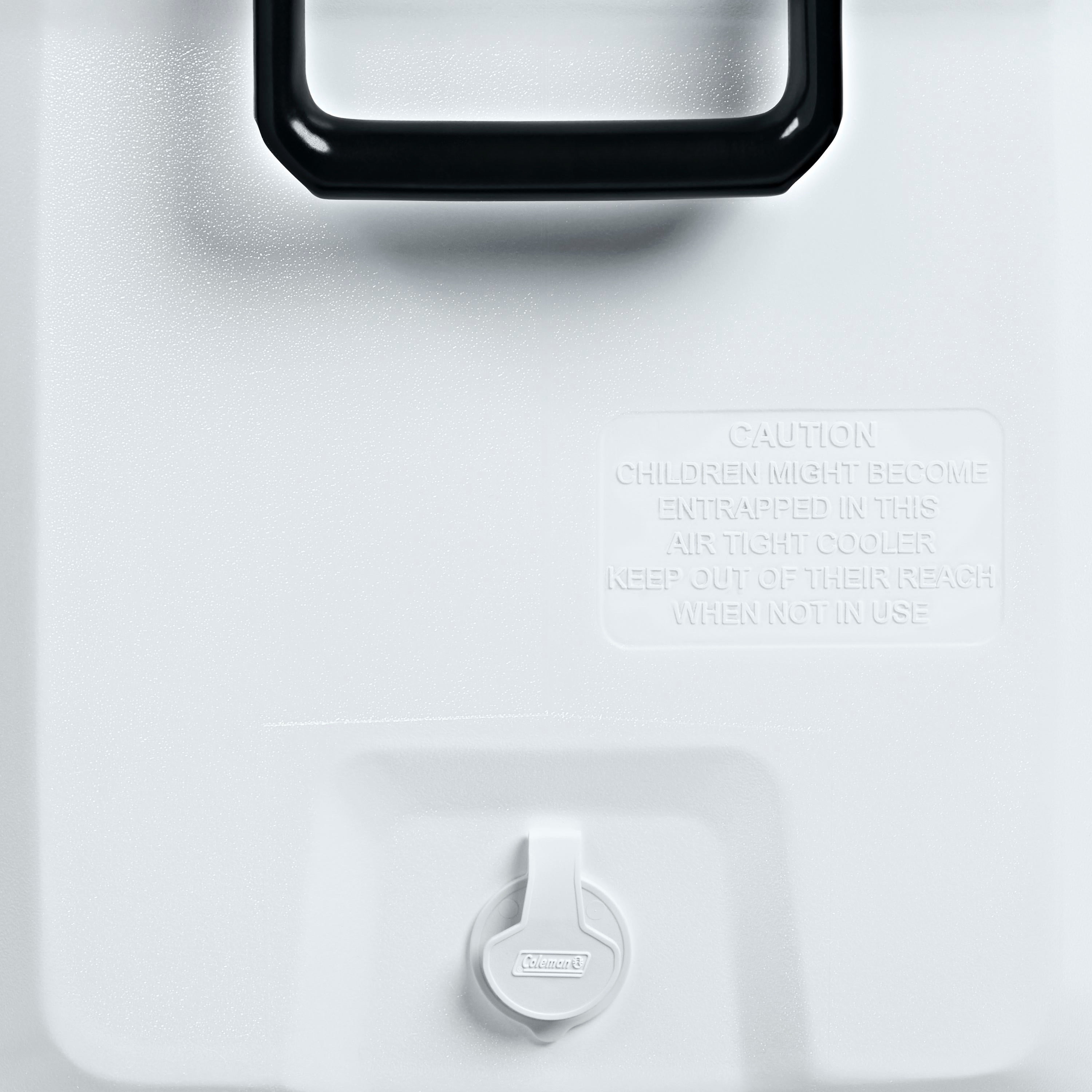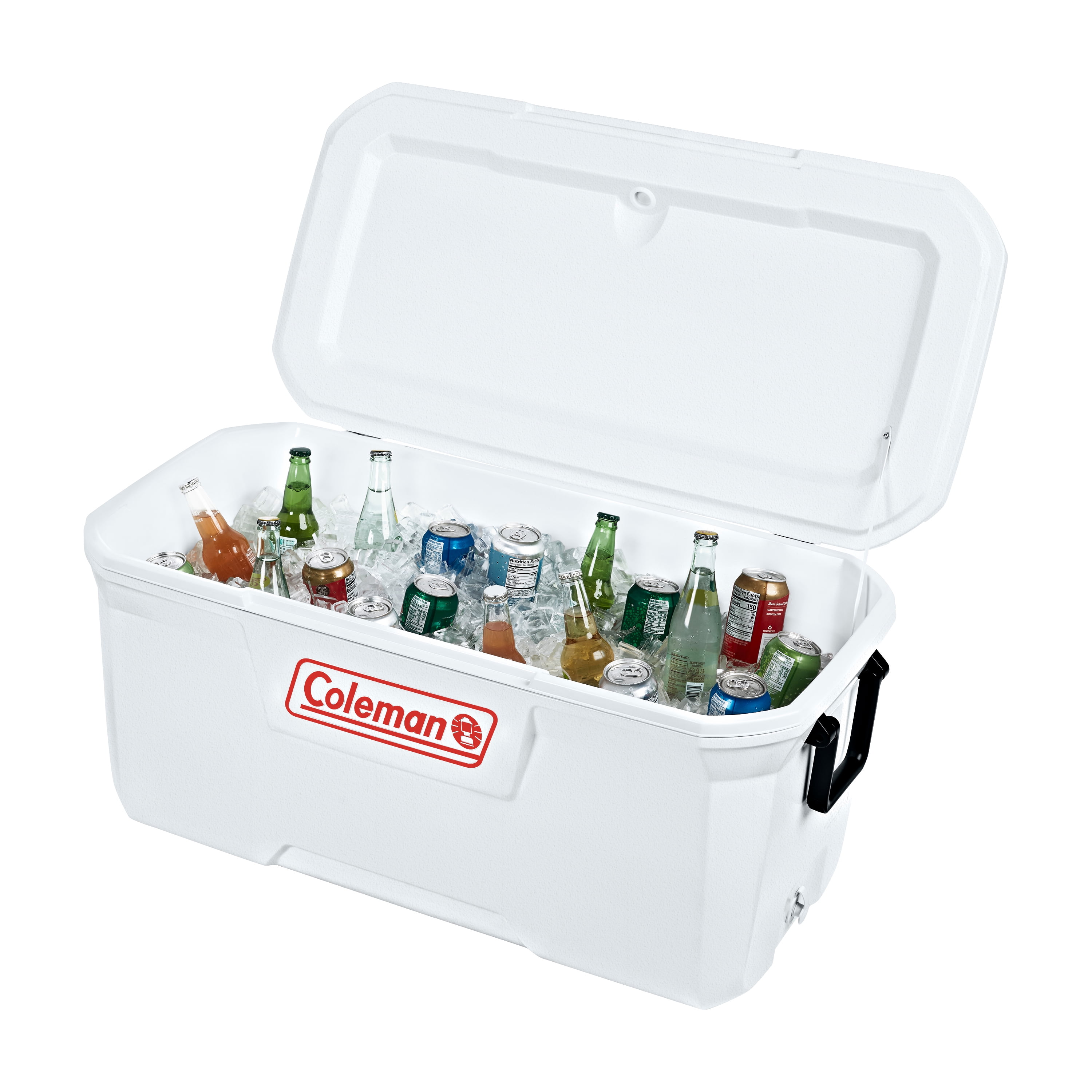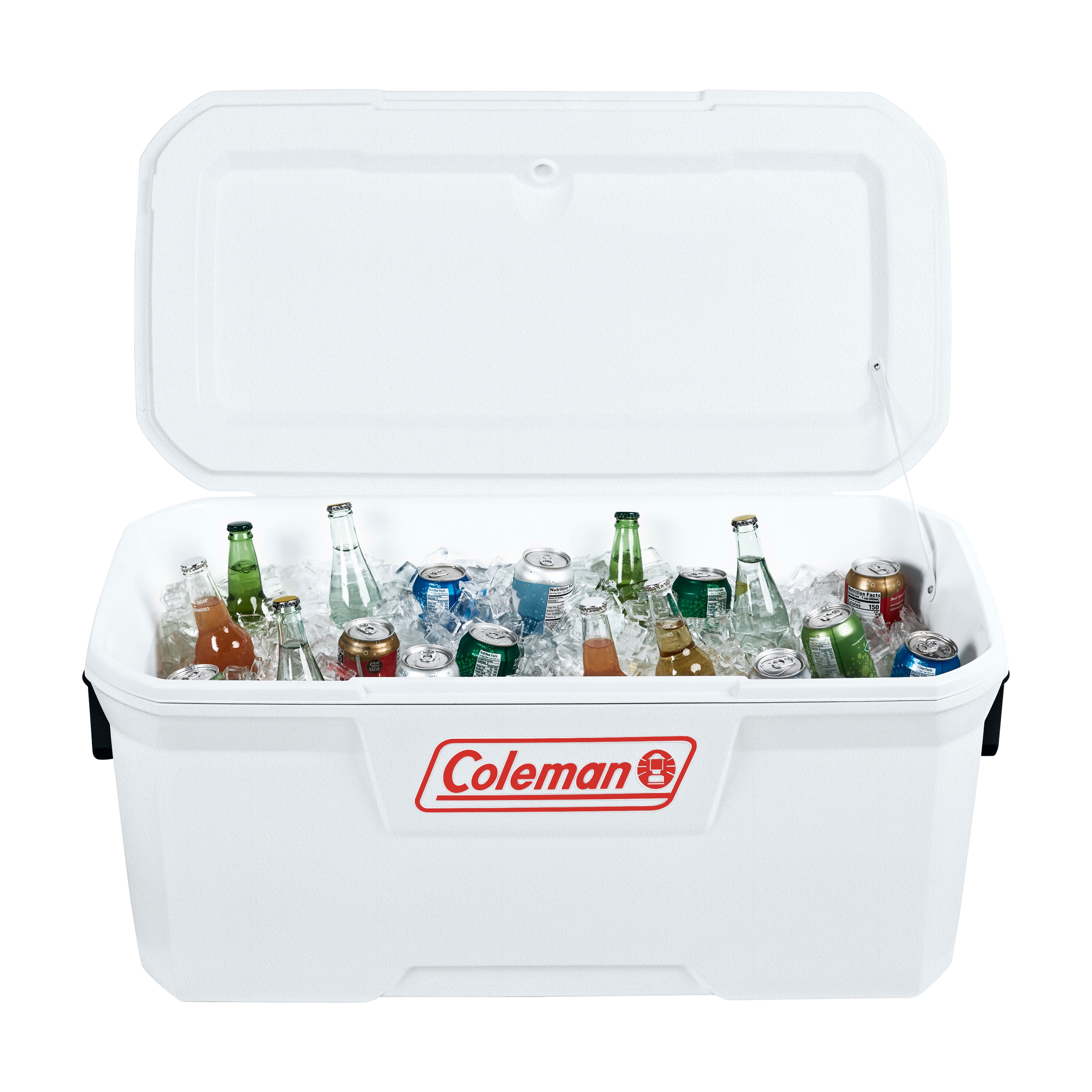 The Coleman Classic Series 120 QT Hard Chest Cooler in color white is Fully insulated lid and body Keeps the Ice™ up to 6 days in temperatures as high as 90°F Chamfered corners for optimal insulation to keep food and drinks colder longer Swing-up handles for easy carrying and lifting Holds up to 204 cans Have-A-Seat lid supports up to 250 lb. Molded cup holders keep drinks close and prevent spilling; fit up to 30 oz. tumbler Antimicrobial-treated liner resists the forming of odor, mold, and mildew between uses Rust-resistant stainless steel hardware prevents corrosion and extends life of cooler Recessed lip on lid for easier access to contents Built-in ruler UVGuard coating for protection from the sun