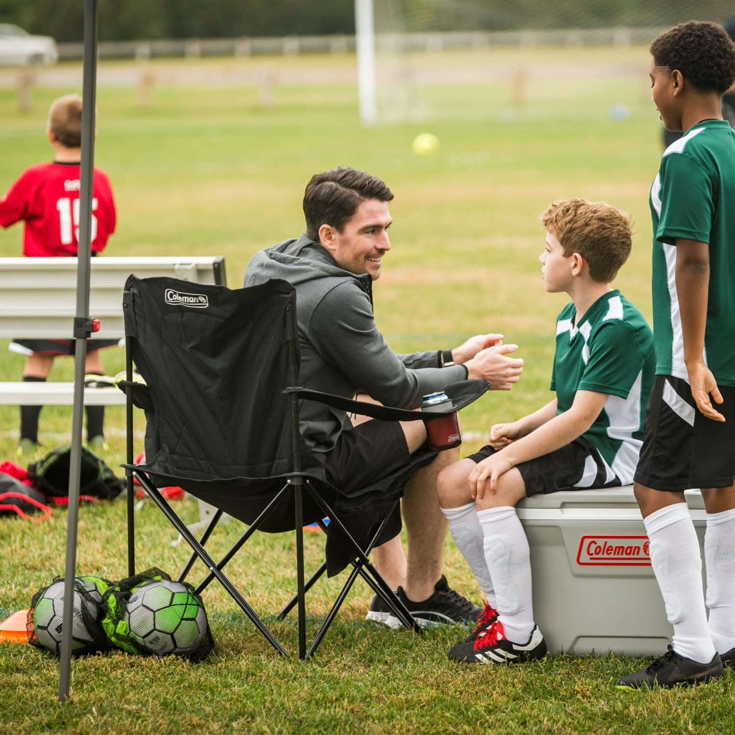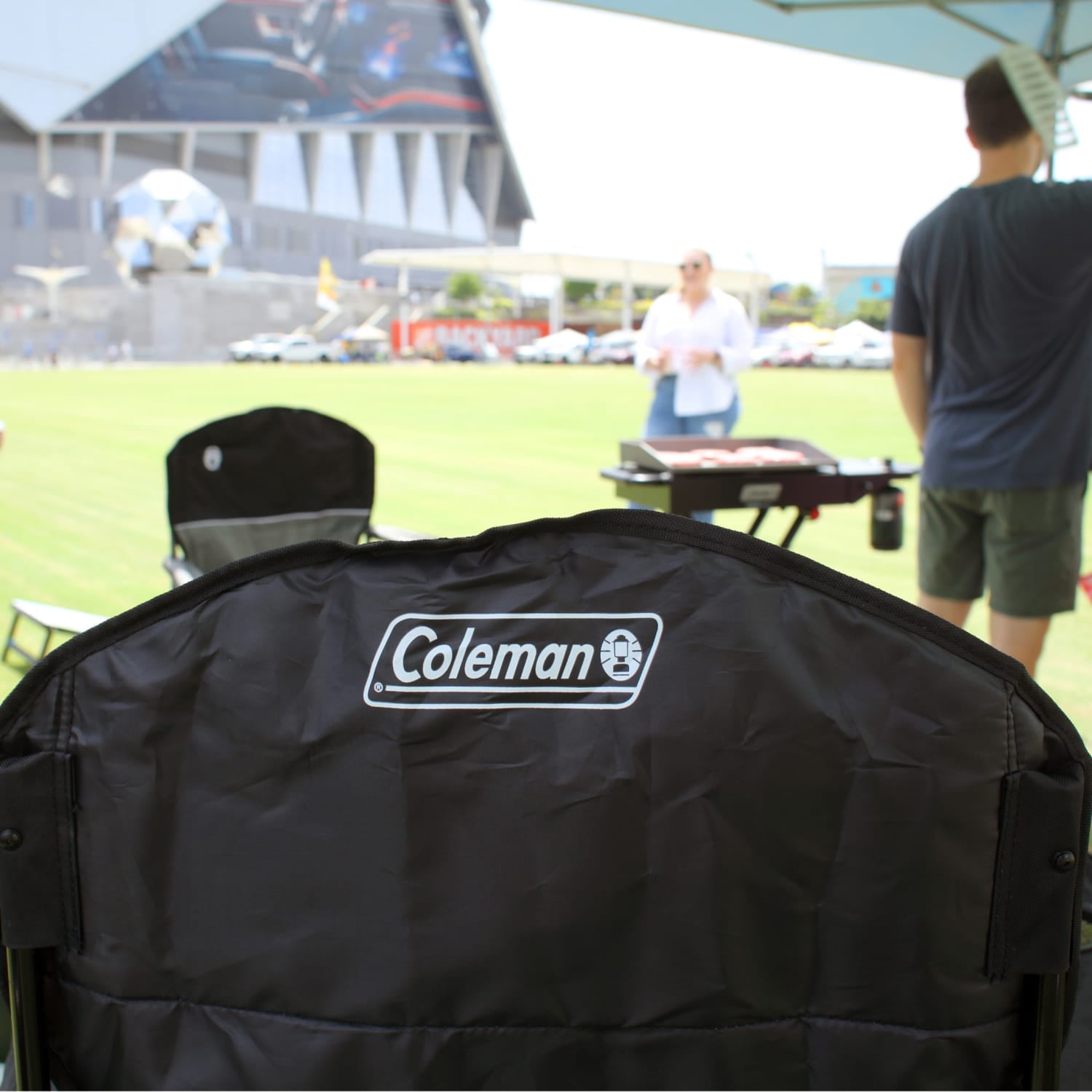 Coleman Cold™ u2013 built-in 4-can cooler lets you grab a cold drink without getting up Mesh cup holder Fully cushioned seat and back Side pockets Strong steel frame Adjustable arm heights