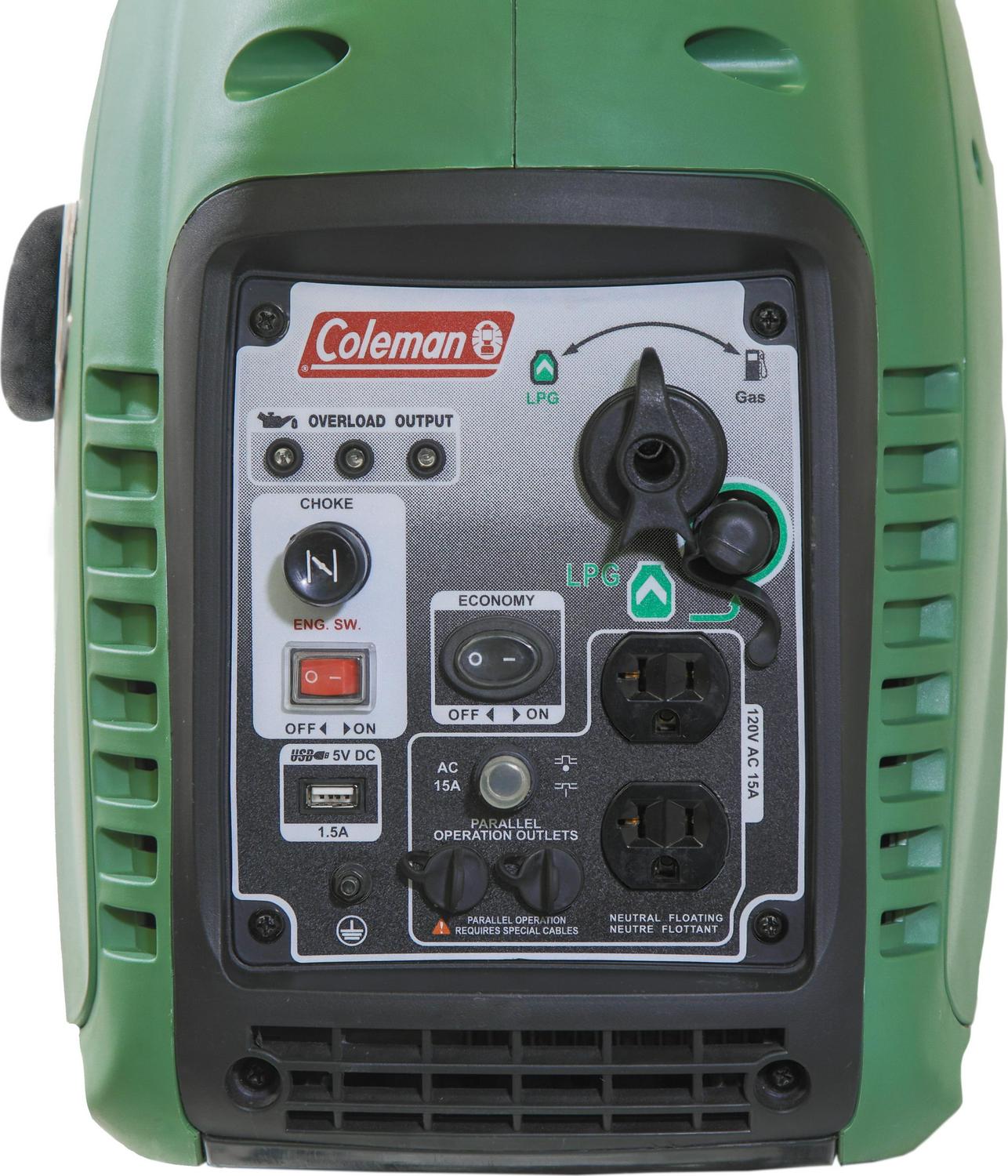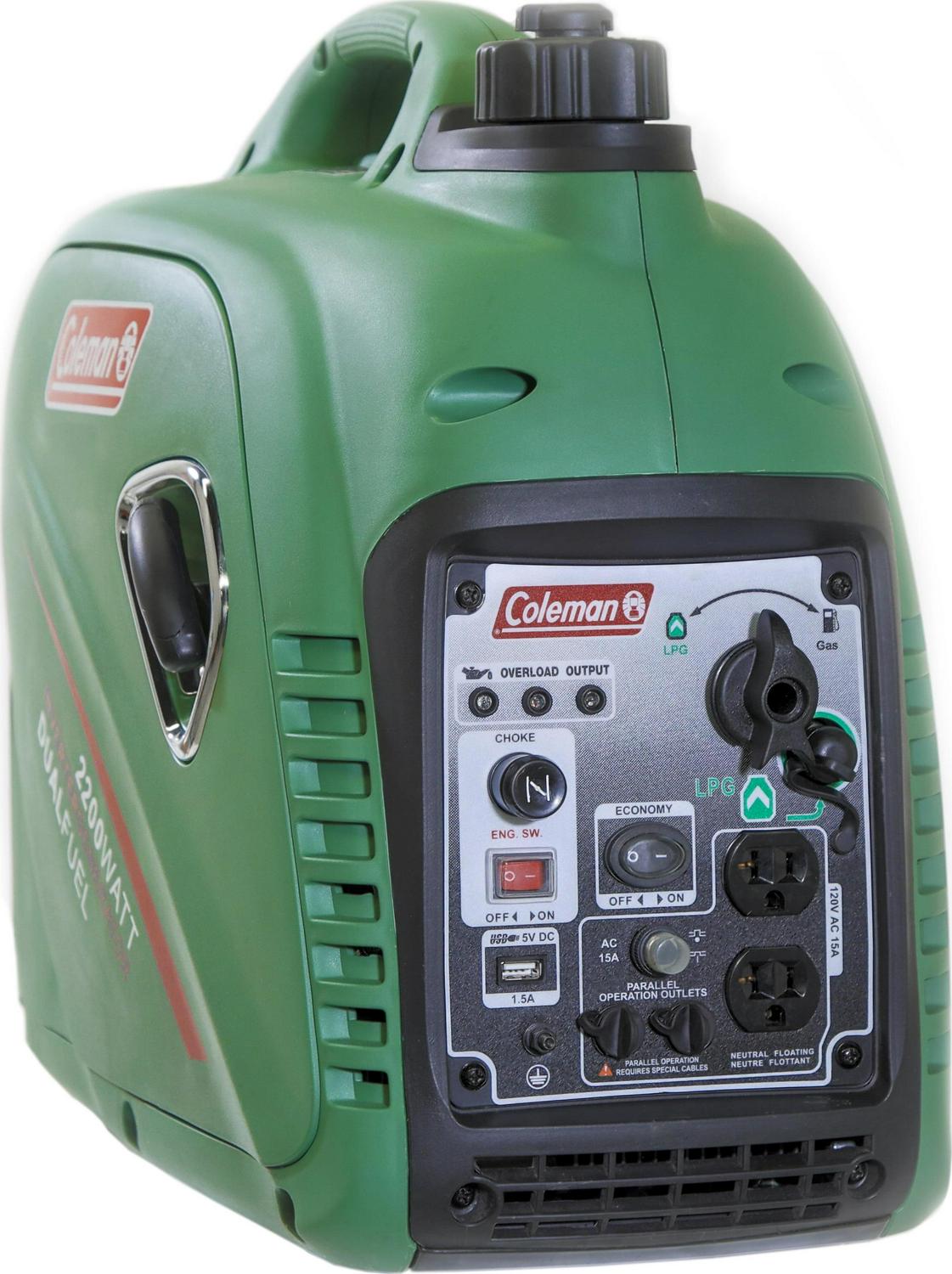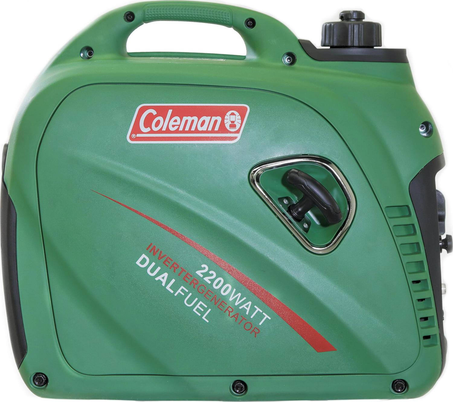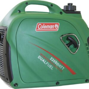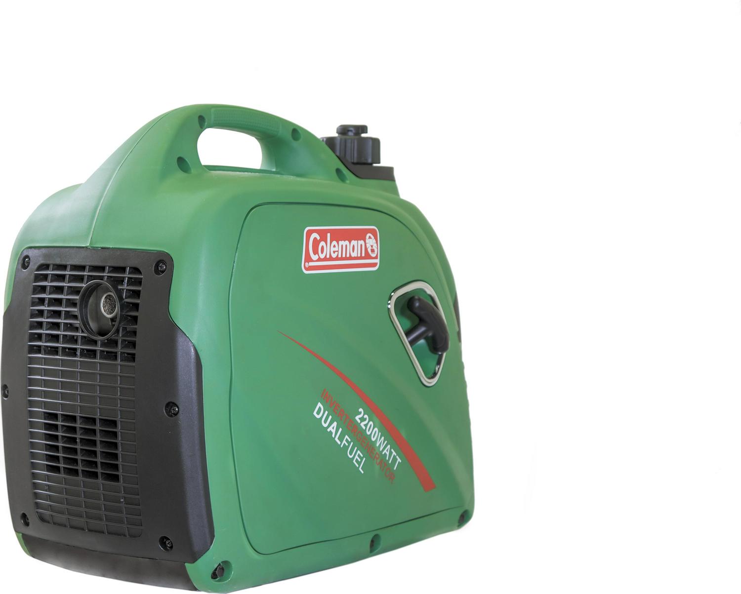 Introducing the New Coleman’s Dual Fuel DF220 2200W Inverter Generator, a portable and efficient generator that will fit many of your power needs. Its single cylinder, 4-stroke, OHV Air-Cooled engine delivers clean power up to 2,200 peak watts/1,800 running watts. With parallel capabilities, it is easy to connect two DF220 generators to increase power output while still having the advantage of carrying around a smaller unit. Having the benefit of dual fuel allows the generator to be powered by either unleaded gasoline or propane, making it perfect for your family s outdoor adventure, as well as in case of emergencies. Whether charging your cell phone, or keeping your refrigerator running, Coleman s DF220 generator will keep you going when the grid can t.