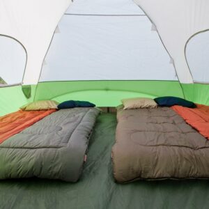 Enjoy everything nature has to offer without worrying about the bugs with the Coleman Evanston 8-Person Dome Tent with Screen Room, 2 Rooms, Green. Great for car camping and extended camping trips, this outdoor tent has a separate floored screen room that offers extra ventilation, protected storage, and can be slept in on warmer nights. This camping tent is designed with the Weather Tec system that features patented welded floors and inverted seams to keep the rain off you and your gear and comes with a rainfly for extra weather protection. Extended awnings let you keep the windows open for enhanced air circulation without letting water in. This backpacking tent offers enough room for two queen size air beds. It sets up in about 15 minutes thanks to snag-free continuous pole sleeves and snag-free Insta-Clip suspension.