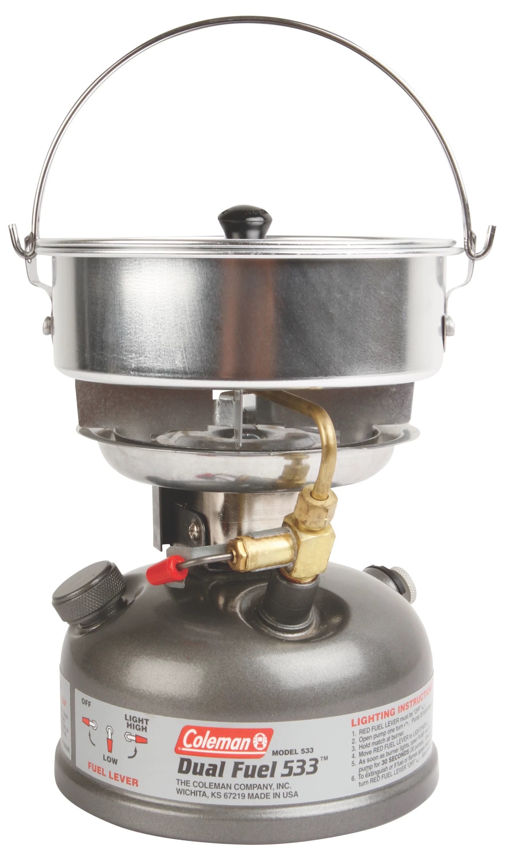 Coleman Guide Series Compact Dual Fuel Stove: Dual Fuel design conveniently burns Coleman Liquid Fuel or unleaded gasoline 1 gallon of Coleman Liquid Fuel lasts as long as 4.5 cylinders of propane Band-a-Blu burner for reliable cooking power All Season Strong technology provides reliable operation in all weather conditions 10,000 total BTUs of cooking power Fits a 6″ pan Wind baffles help protect your burner from wind for maximum heat Lasts up to 2 hours on high on 1.1 pints of Coleman Liquid Fuel or unleaded gasoline (both sold separately) Perfect for backpacking, camping hunting and other outdoor occasions and other outdoor occasions Filtering funnel included 5-year limited warranty