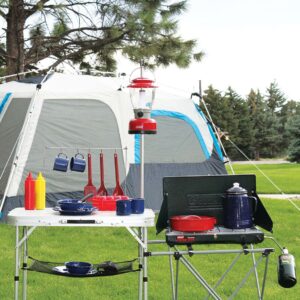 - Handy lantern holder, utensil hooks, and a mesh shelf for additional storage
