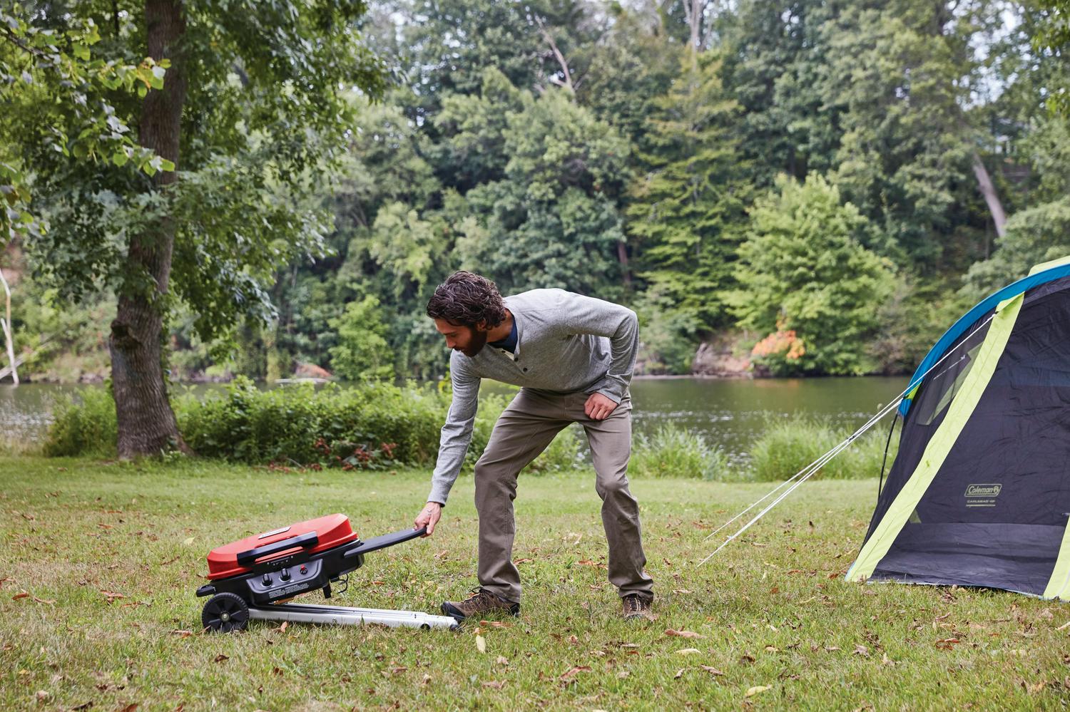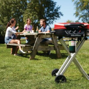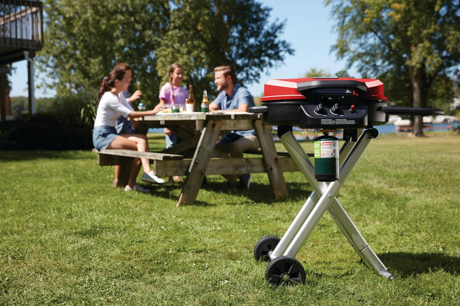 The Coleman RoadTrip 225 Standup Propane Gas Grill, Red features sturdy quick-fold legs and wheels for hassle-free setup and takedown, so that taking your grill on a camping trip or to a tailgate is a breeze. You’ll also enjoy matchless lighting with the Instastart push-button ignition system and better temperature control with 2 adjustable burners.