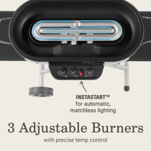 The Coleman RoadTrip 285 Portable Stand-Up Propane Grill features sturdy quick-fold legs and 2 wheels for hassle-free setup, takedown, and transport so that taking your grill on a camping trip or to a tailgate is easy. Push the Instastart ignition button for matchless lighting, then select your heat with the enhanced temperature control of 3 independently adjustable burners (outer left, inner, outer right). With a range of grilling power from 3,250 to 20,000 BTUs and 285 sq. in. of cast iron grill grates coated in porcelain, you ll wow your friends and family with an array of perfectly cooked meats, seafood, or veggies every time. If you’re looking for more meal options, the Swaptop interchangeable cooktops let you switch the grill grates with a griddle or stove grate (both sold separately). With two sliding side tables to keep utensils and sauces handy, cooking with this grill is just as convenient as traveling with it. Bonus: The RoadTrip 285 Portable Stand-Up Grill can be stored upright (to fit in tight spaces) until your next cookout. Uses a 1-pound propane cylinder (sold separately).