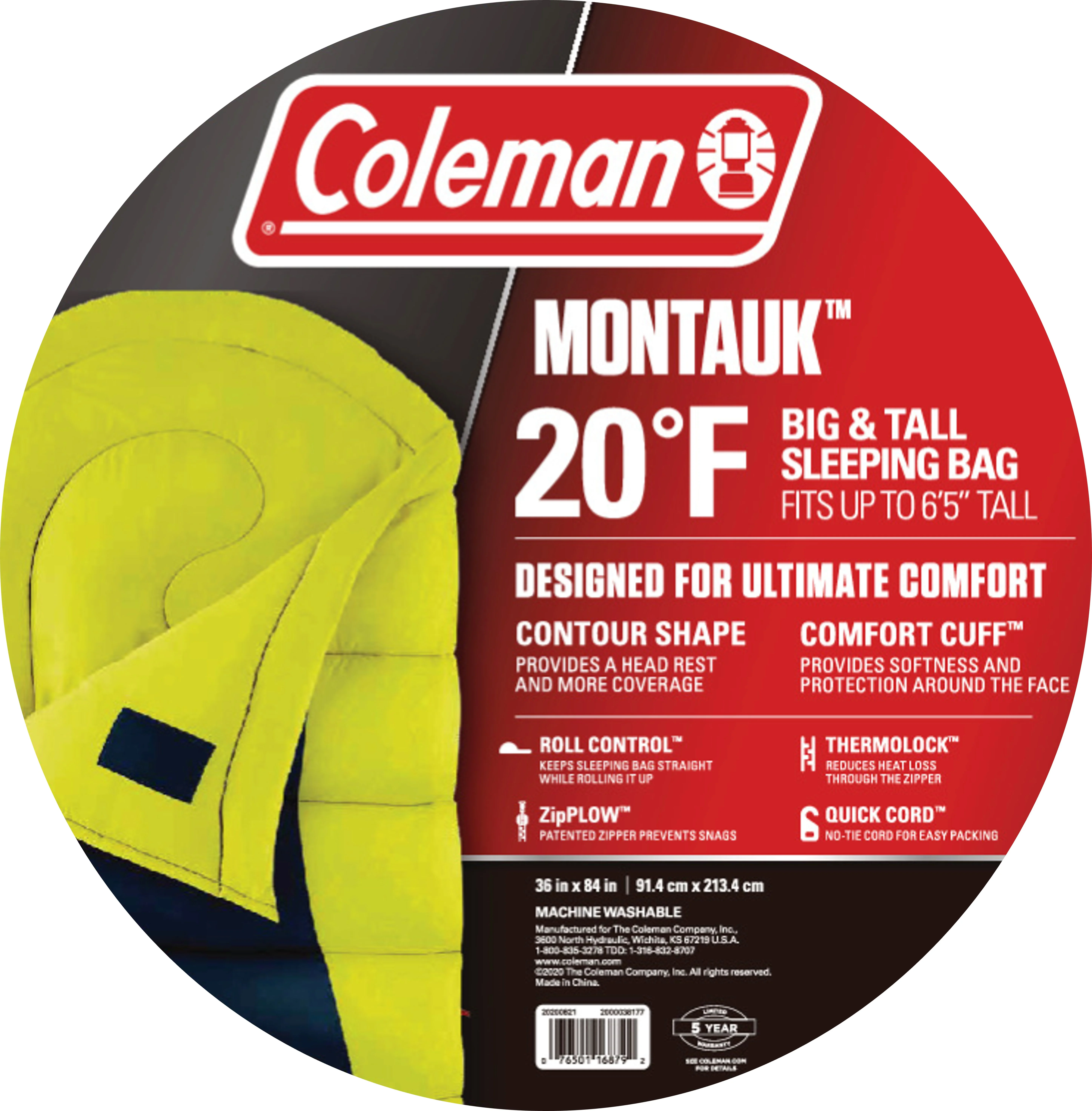 Keep your head and pillow off the cold ground when you lie down to sleep in the Coleman® Montauk™ 20°F Big and Tall Sleeping Bag with a contoured top. Lightweight Coletherm™ hollow polyester insulation and the Thermolock™ draft tube along the zipper helps keep body heat from escaping so you stay warm even when it’s 20°F outside. The Comfort Cuff™ design makes sure you only have soft fabric around your face while you sleep. Thanks to the ZipPlow™ zipper, you’ll get snag-free opening and closing every time. You can stash small items, such as gloves or a flashlight, in the interior tuck pocket. Packing up is easy with the Roll Control™ system to keep your bag straight while rolling and the no-tie Quick Cord™ system to keep things cinched tight for storing inside the included stuff sack.
