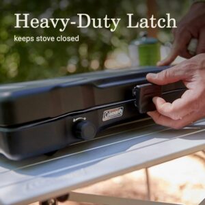 Hit the road with a Coleman Triton Portable Propane Camping 2 Burner Stove, Black which makes it easy to cook great meals outdoors. It has a heavy-duty latch so you can keep the stove closed if you step away for a minute, and its durable, chrome-plated grate is removable for easy cleanup. Because we know cooking out in the elements can be rough, this stove has two guards to shield the burners and flame from the wind, as well as improved knob rotation for precise temperature and simmering control.