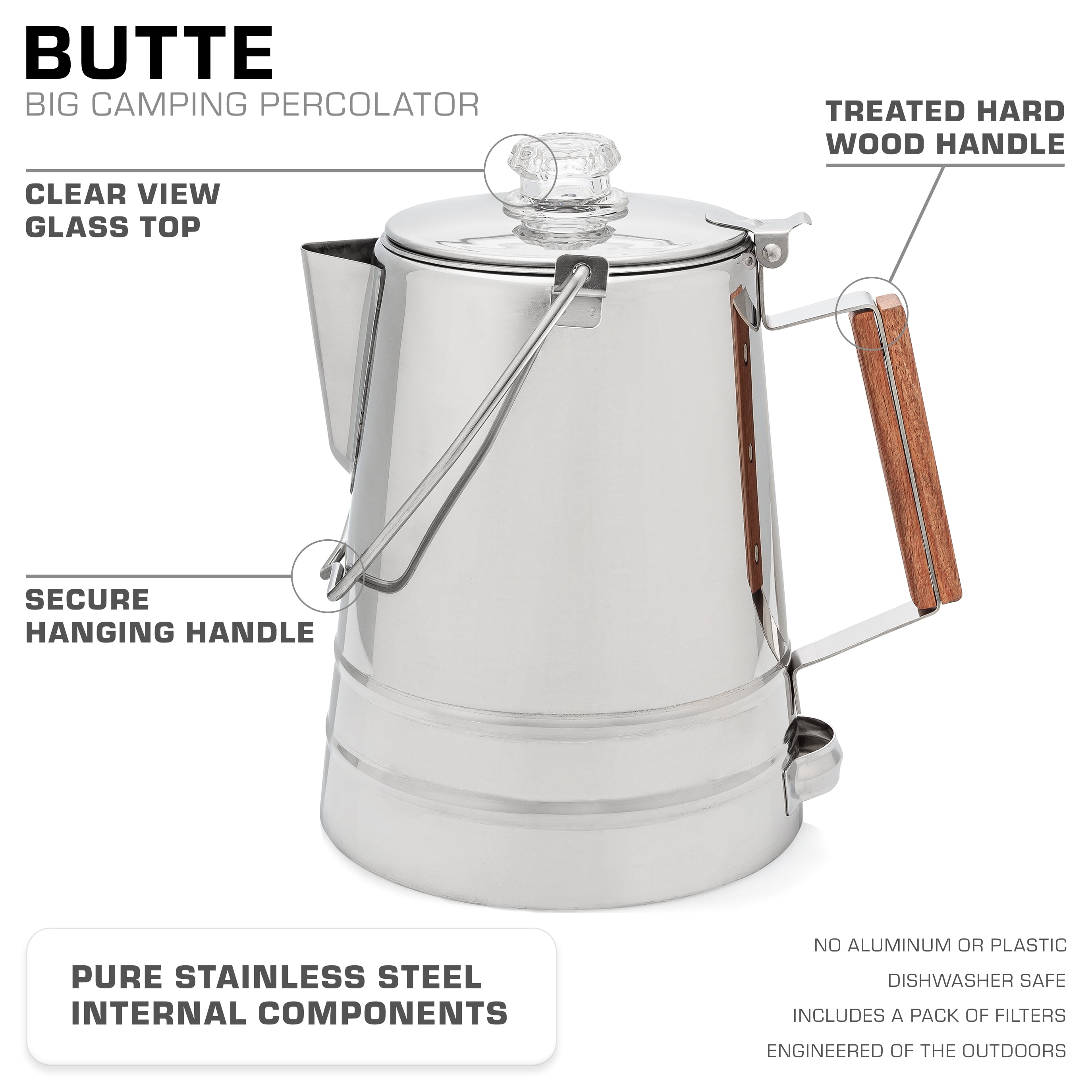 CAMP COFFEE POT: Steel wire handle for hanging over a campfire; great for destination camping, weekends at the cabin or the backyard fire-pit also a grill, or grate, stove top coffee percolator. NO ALUMINUM OR PLASTIC: Named after the rugged city of Butte, this beautiful yet rugged camping coffee maker is made of 18/8 stainless steel, with a glass preview knob and rosewood handle. DURABLE CONSTRUCTION: The materials used have been selected to ensure dependability as a mainstay among your camp kitchen equipment. LARGE: Percolating for the entire camp is easy with this large 14 CUP coffee pot. Pack-in the Butte 14 Cup camping coffee percolator to your next outdoor adventure! BUILT TO LAST: Made of heavy gauge, food-grade 18/8 stainless steel for excellent resistance to corrosion; rugged construction withstands rigors of camping stove, fire, and outdoor uses for percolators. DONATE TO CHARITY: 10% of all profits go to support projects aimed at championing religious freedom and providing access to Christianity worldwide. A standard coffee mug is 10oz. In the coffee industry, 1 cup is 5.07 oz (148 ml). The Coletti 14 Cup Percolator has a Volume Capacity of 71 oz (2.1 liters) (0.55 gal)