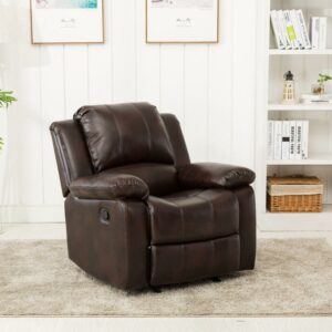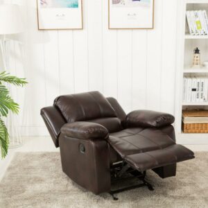 Smooth reclining mechanism Classic pub back with contrasting top stitching Premium cushion support Plush armrest for added comfort Chair holds up to 330 pounds Sturdy wood frame Leather gel technology gives the look and feel of top grain leather and is easy to maintain