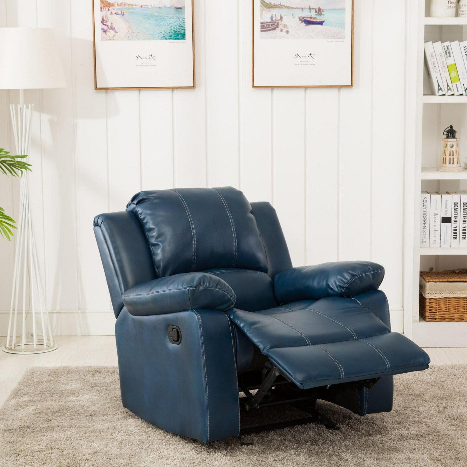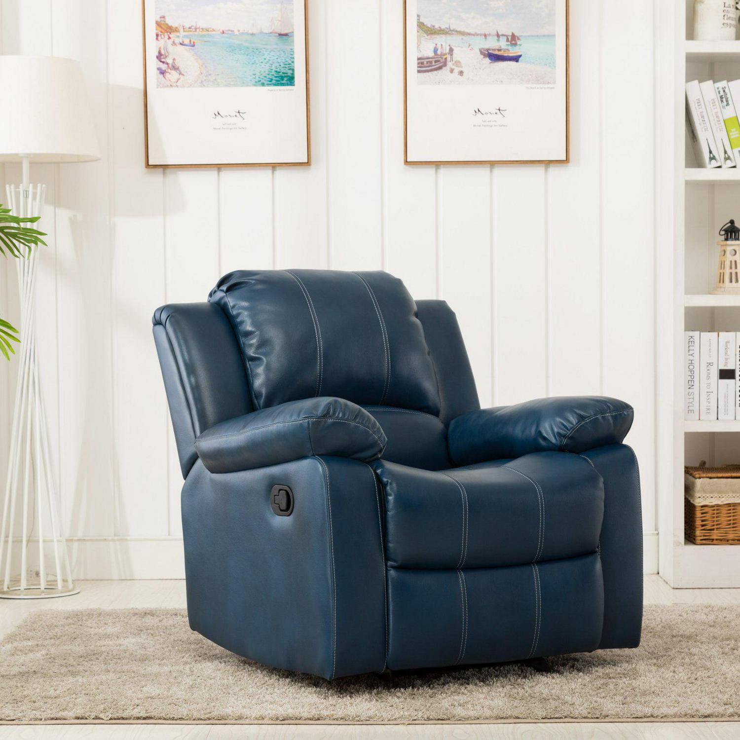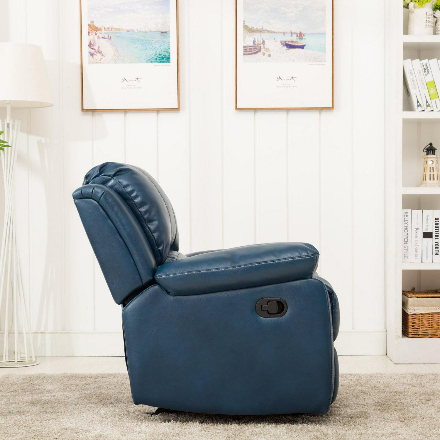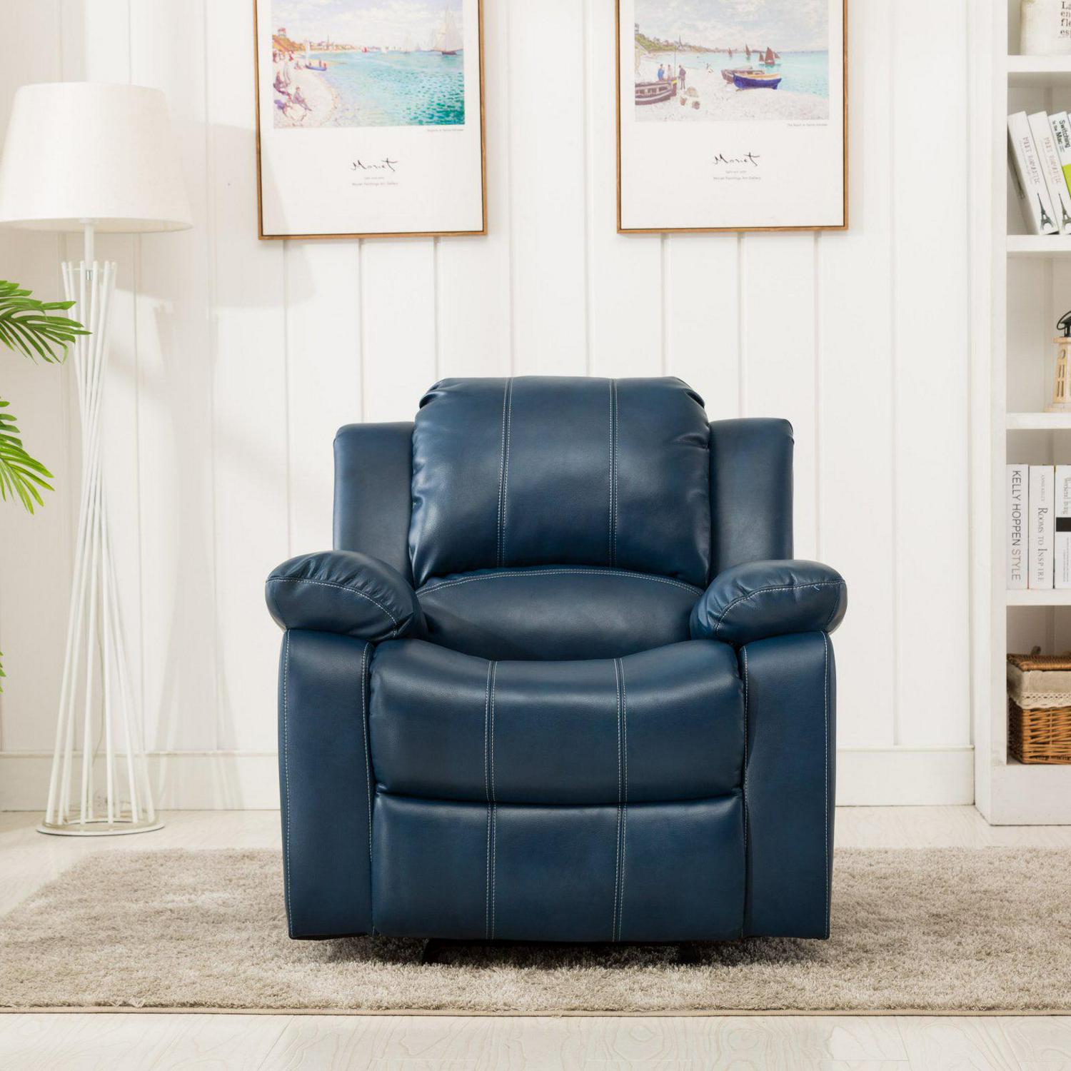 Relax in ultimate comfort and style with the Clifton Glider Recliner. The supple Navy upholstery is an innovative leather gel that provides the soft touch of a top grain leather at a great value and the contrasting top stitching adds an interesting design element. The sturdy wood frame with a heavy duty steel mechanism is designed to support up to 330 lbs. while wrapping you in comfort with premium cushion support and plush armrests. The chaise style seat gives a continuous reclining surface for excellent leg support. Enjoy smooth gliding and reclining functions in classic style with the addition of the Clifton to your home.