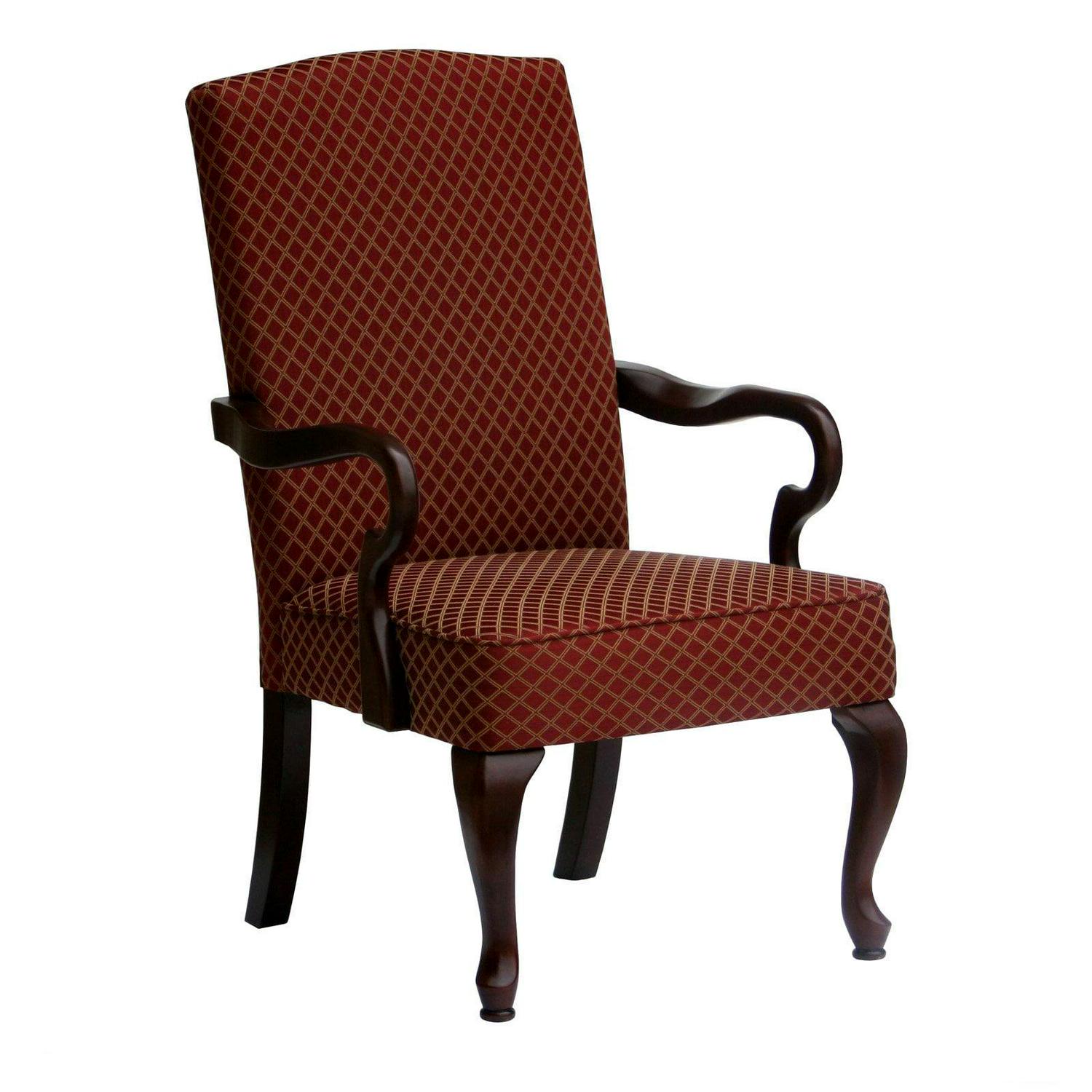 The Derby chair features a simple and comfortable design. This goose neck arm chair with its high back is highlighted by the beautiful jacquard diamond red fabric used on the chair back and seat cushion. Crafted with solid hardwood construction this chair is sure to be a staple in your home for years to come.