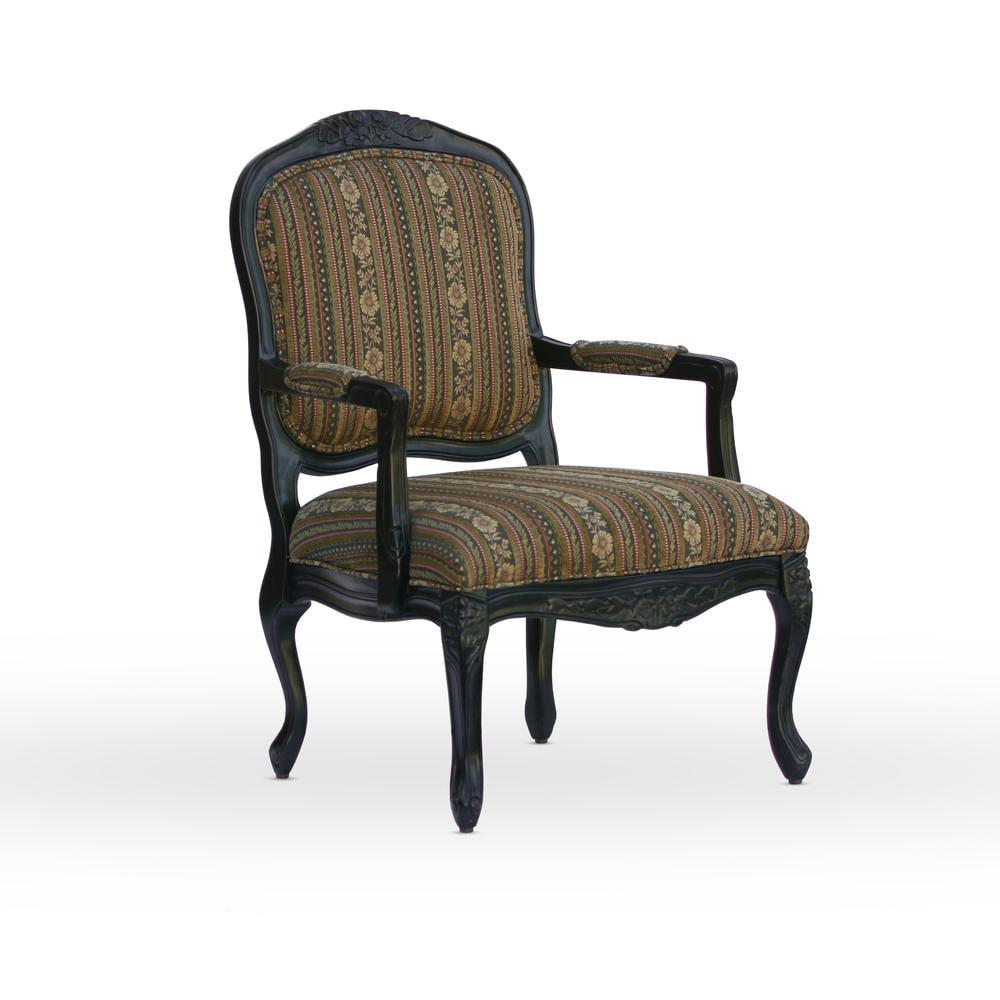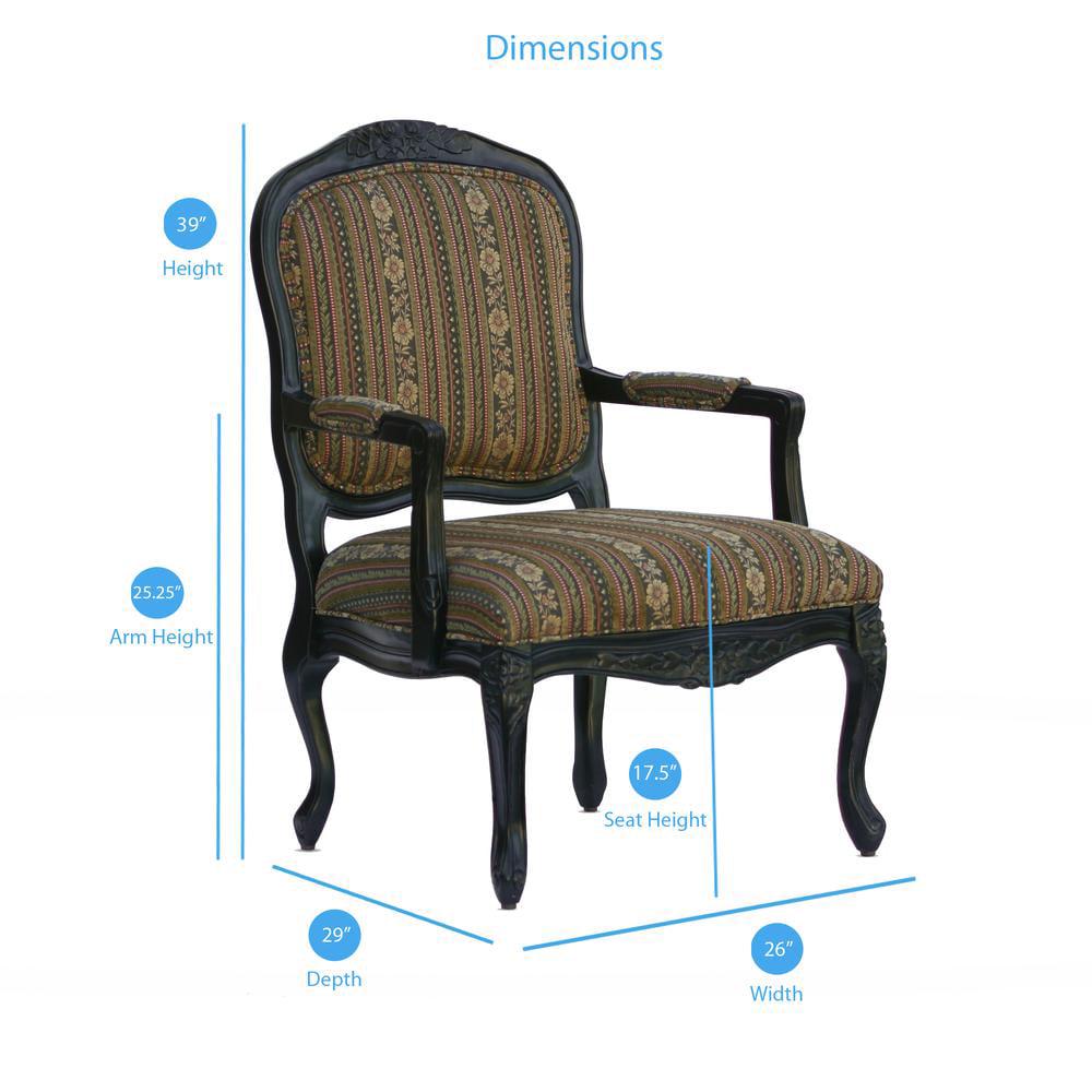This beautifully crafted French provincial style accent chair is the perfect addition to any room. The chair is further highlighted by the hand carved detailing on the top and seat rail which is accentuated by the black hand rubbed finish that gives it an antique feel. The exquisite floral striped chenille cushions make this chair a must have. Made with solid hardwood construction this chair is sure to be a staple in your home for years to come.