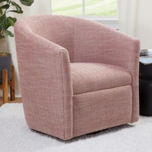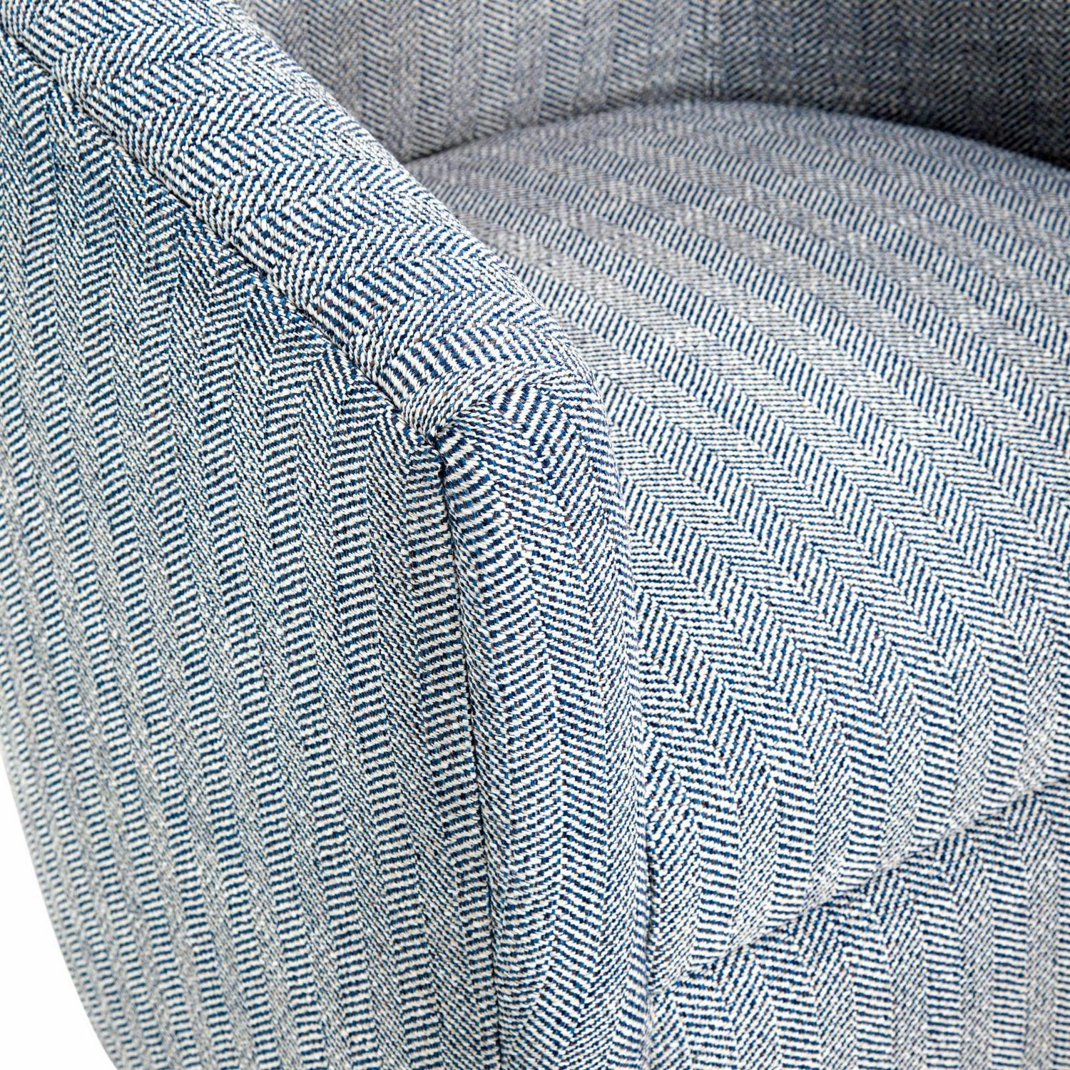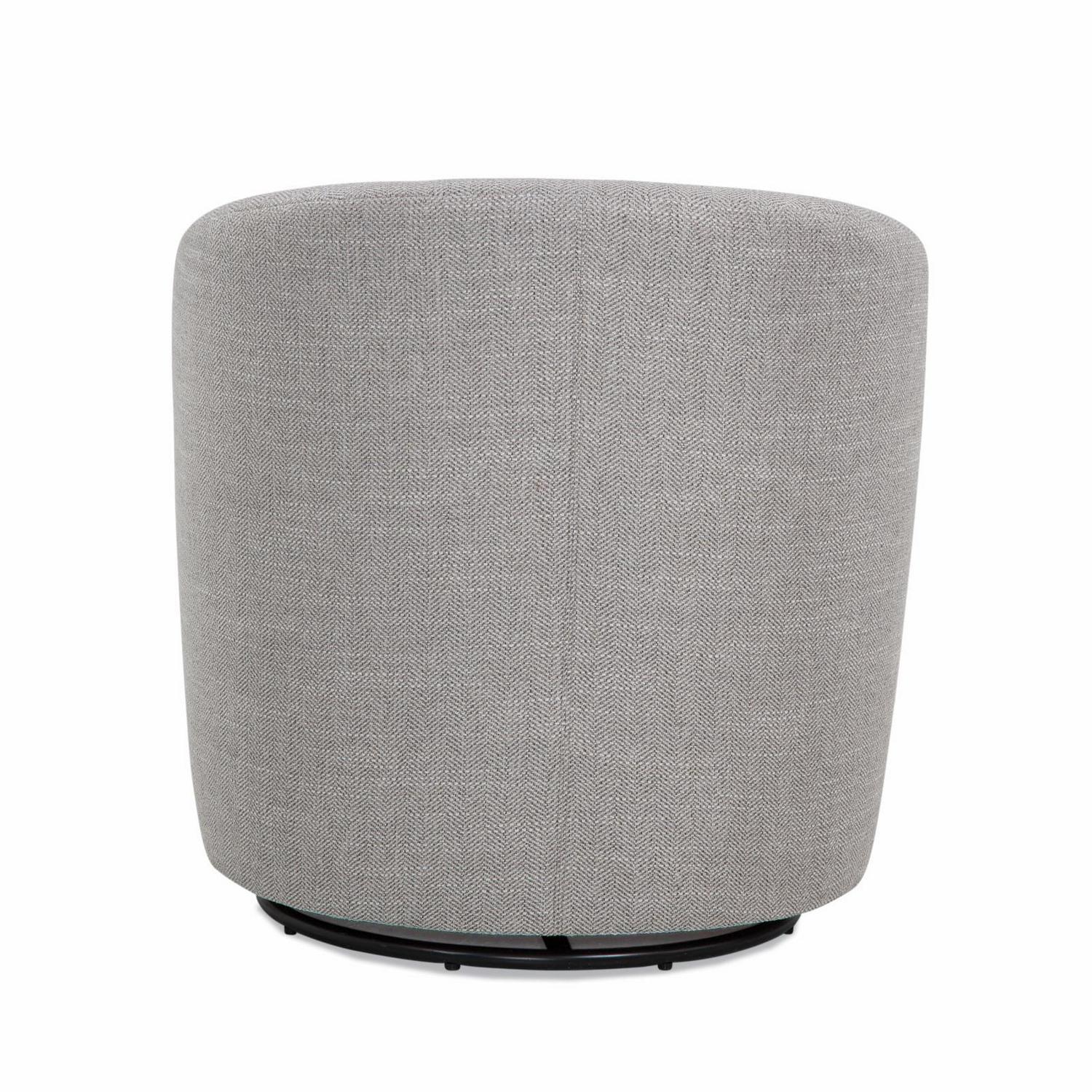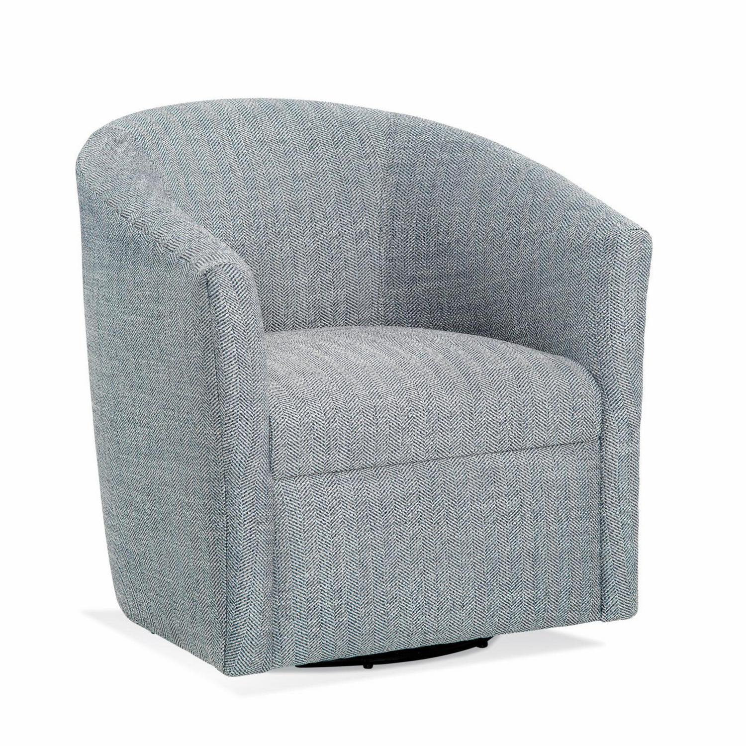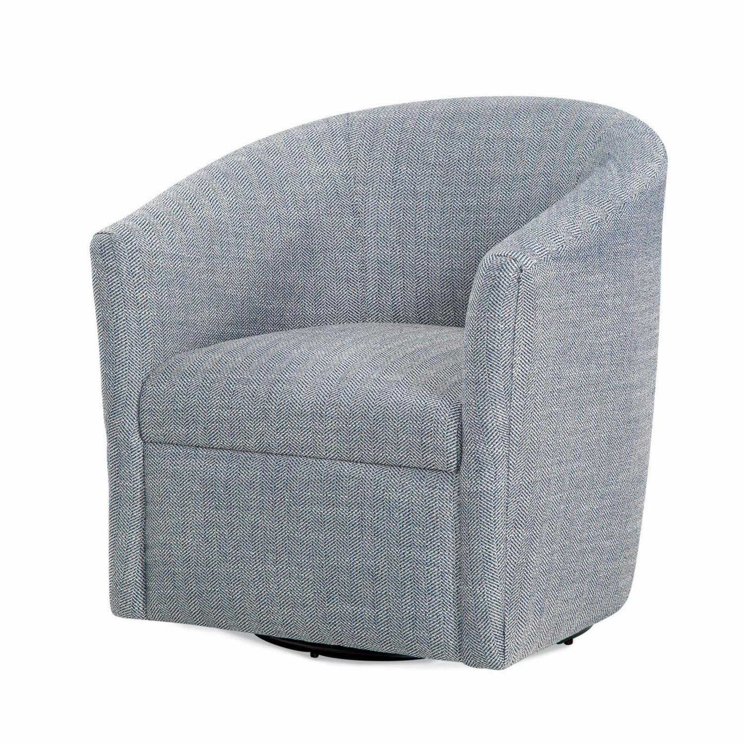 The Lynton Swivel chair combines fun with comfort and style. Perfect to round out your living room seating or for a private corner in your bedroom. The comfortable barrel back design is on a functional 360 degree swivel and is great in pairs or more! The herringbone 100% polyester fabric lends a tailored look to this casual chair and is easy to care for. Available in your choice of Sea Oat, Indigo and Henna.