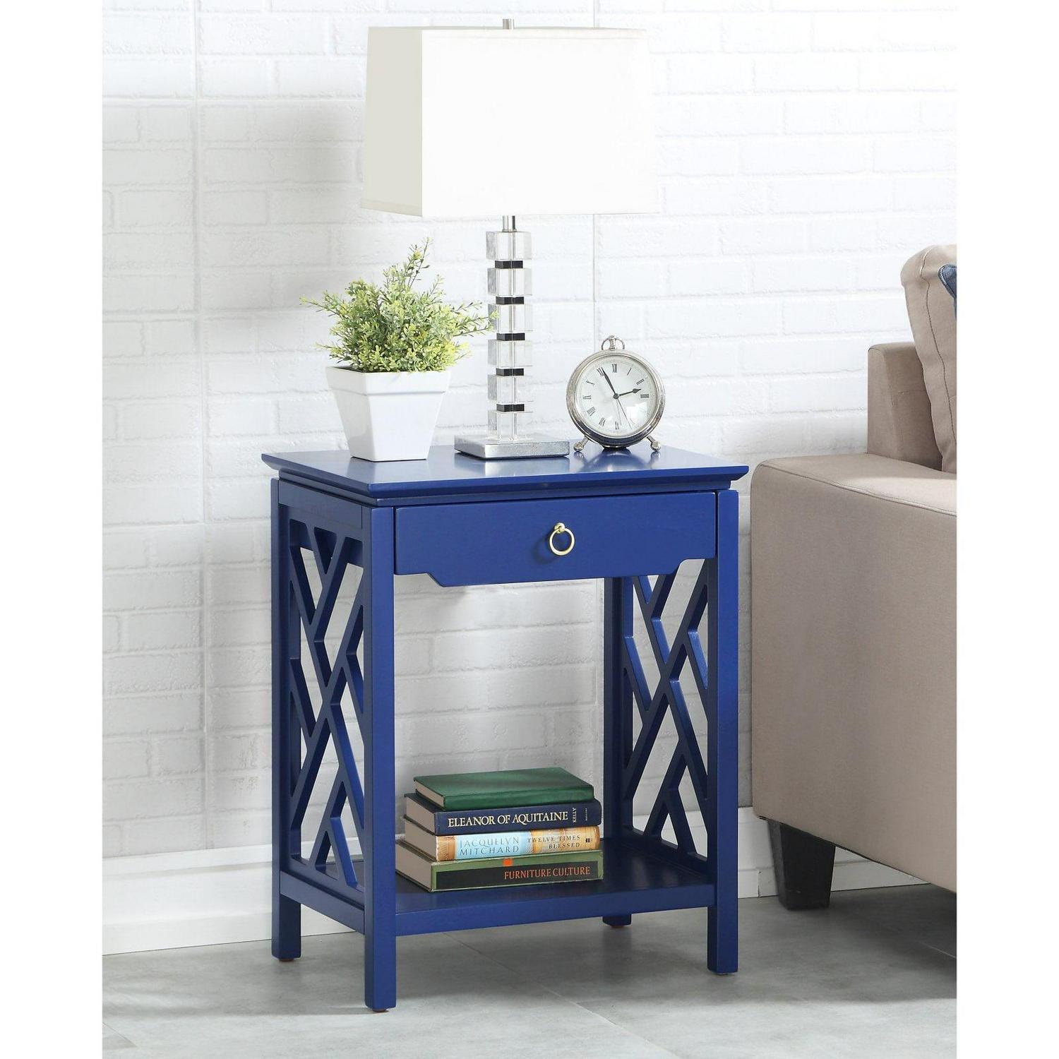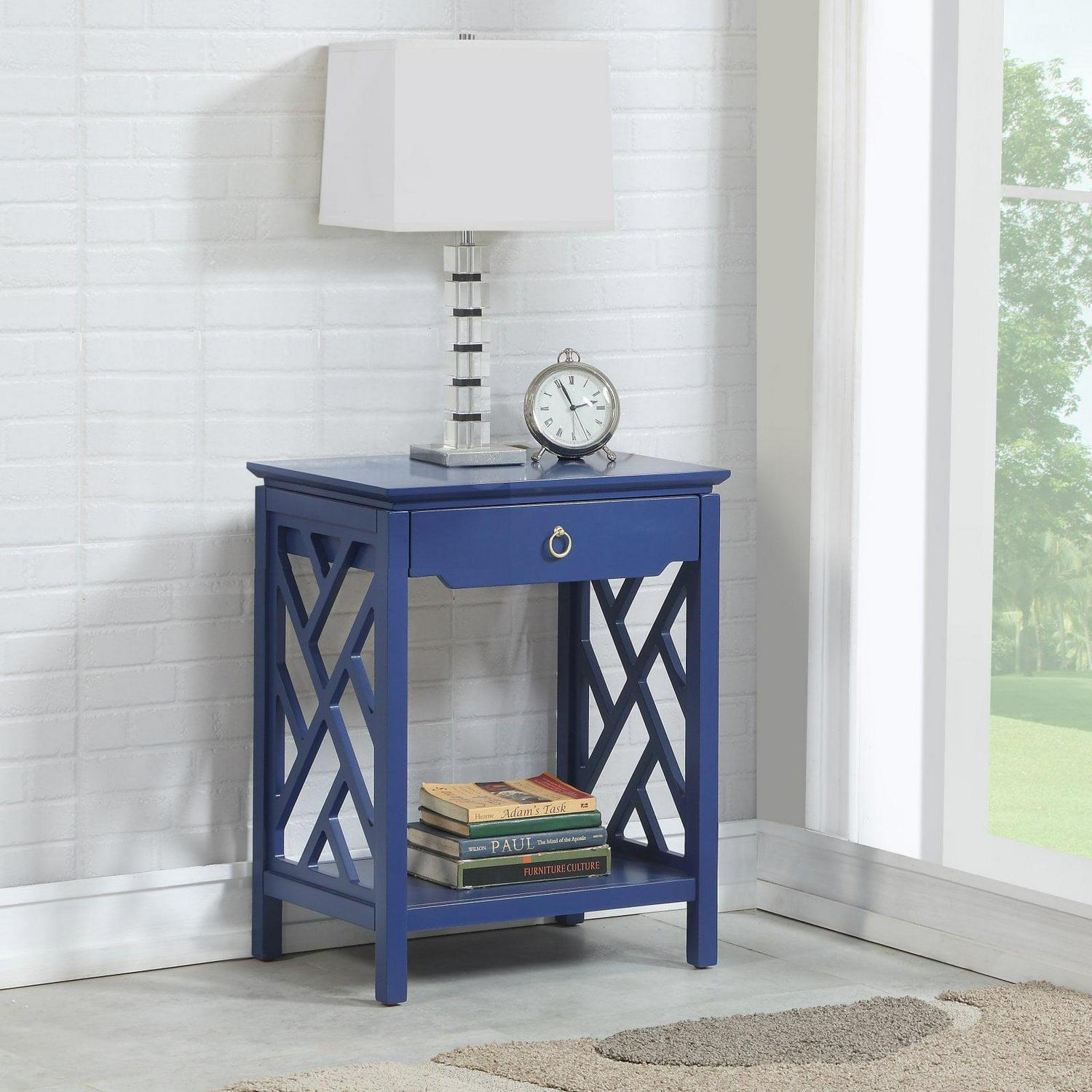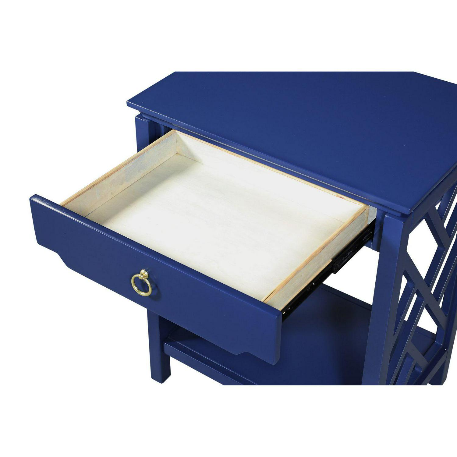 The transitional style of the Comfort Pointe Thomas 1 Drawer Chippendale-style allows it to blend easily with any decor. Crafted from hardwood solids and engineered wood, this nightstand is made to handle the rigors of everyday use. The single drawer is perfect for holding reading lights, reading glasses, and more while the bottom shelf displays your favorite books as well as the one you re currently reading. The drawer features full-extension metal roller bearing side glides so you never have to dig blindly around the back. The Chippendale sides add a fun touch while the brushed gold ring pull completes the look. Select from available finishes to create the perfect look for your home.