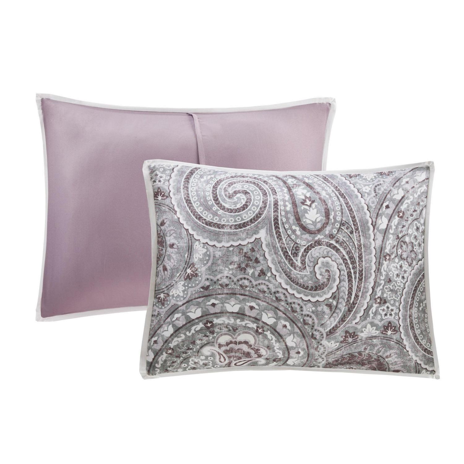 Add an elegant touch to your bedroom with the Comfort Spaces Kashmir 8 Piece Ultra Soft Comforter Set. The beautiful comforter features a large paisley print with a solid reverse, for an exquisite look. Matching shams mirror the pattern of the comforter, while the solid Euro shams coordinate with the bedding set to pull the entire ensemble together. Two decorative pillows, one with embroidery and another with fabric manipulation, add dimension and charm to the top of the bed. Completing the comforter set is a solid grey bed skirt with a 15-inch drop to give your bed a clean finish. Machine washable for easy care, this ultra-soft microfiber comforter set brings style and grace to your space. The comforter is vacuum sealed. Upon opening of the package, please place it in a dryer in low heat to fluff it back to its original shape.