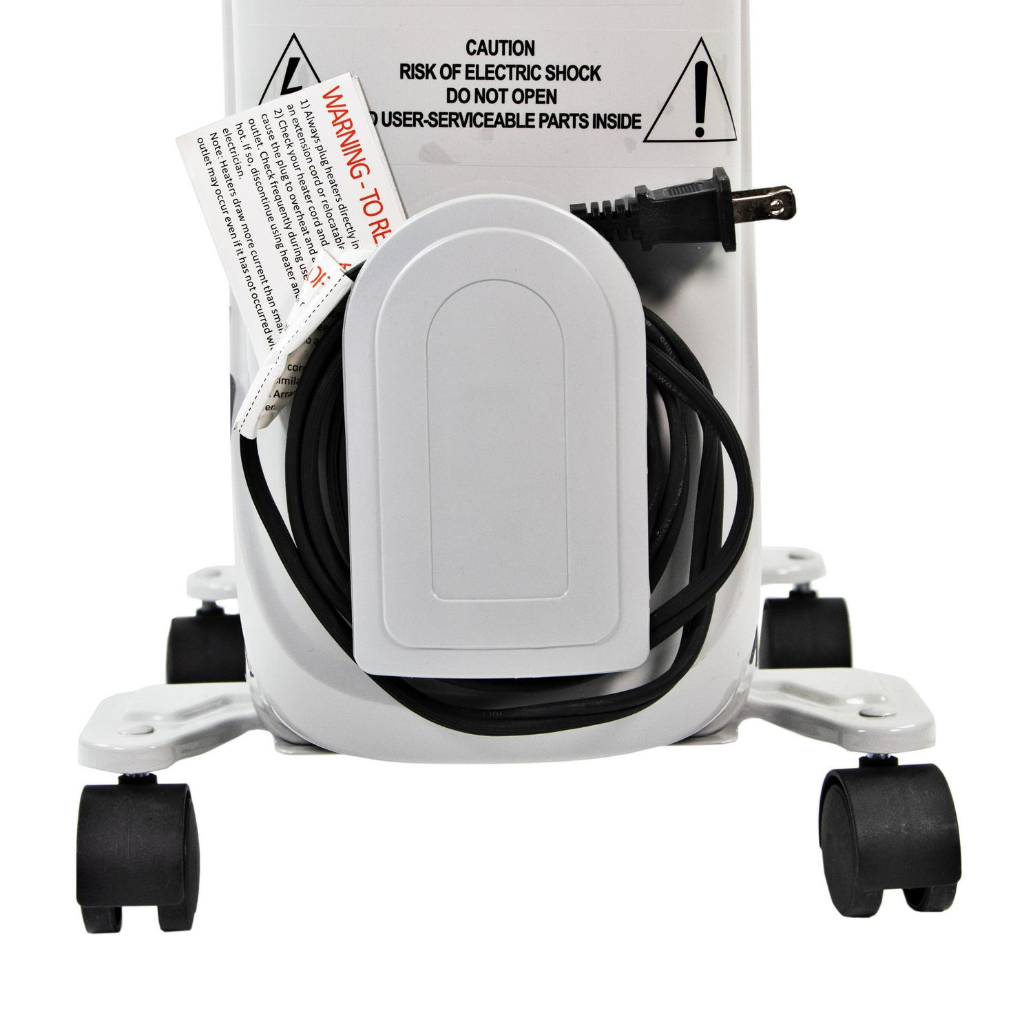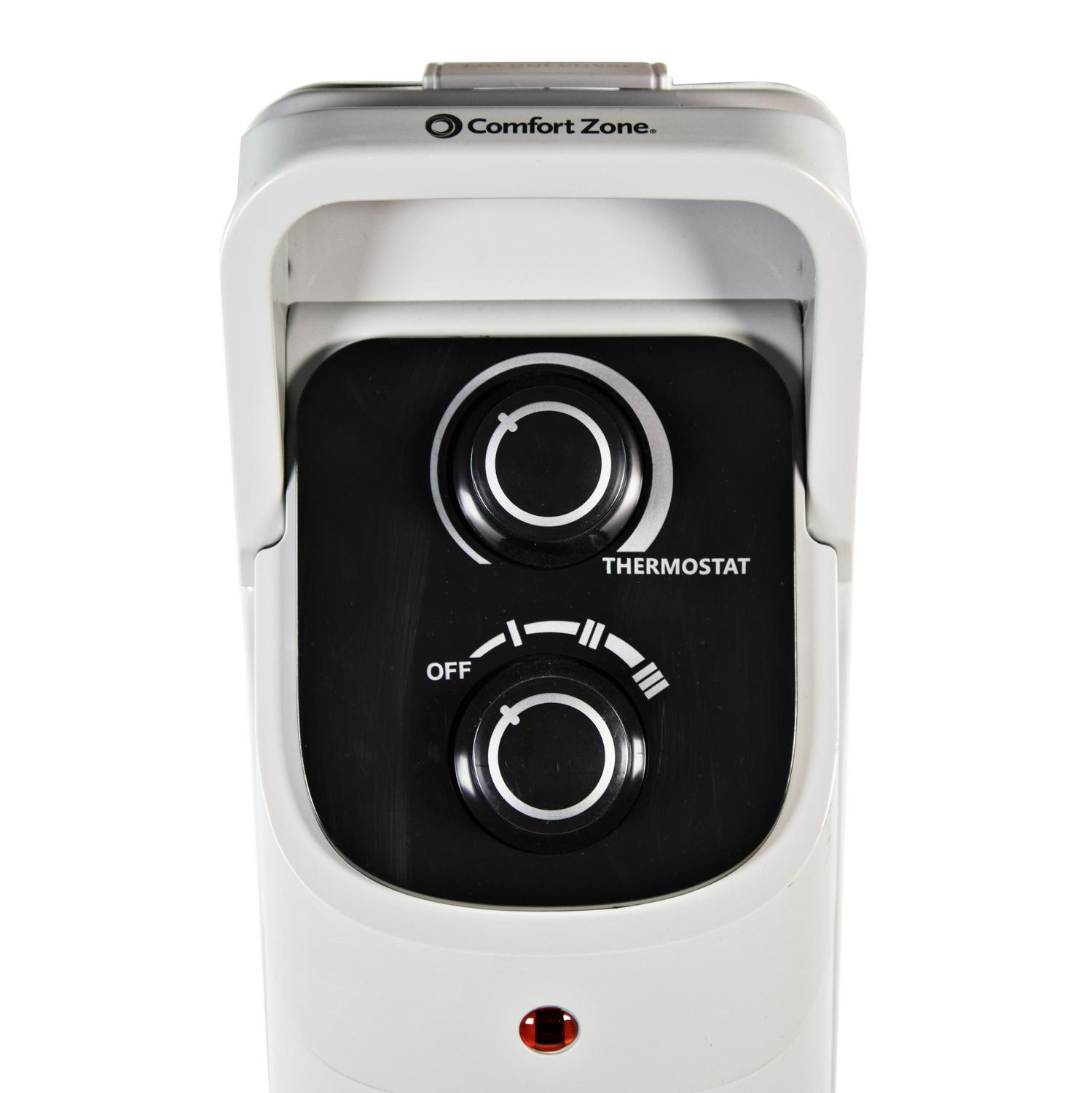 Designed to operate silently, this Comfort Zone Electric Oil-Filled Radiator Heater won t disrupt your sleep, work or study sessions with annoying rattling or the whooshing of rotating fan blades. The radiator heater boasts three convenient heat settings, making it a snap to warm your space to a comfortable temperature. The oil radiator heater rolls easily in any direction using convenient swivel casters, while an oversized stay-cool handle makes it easy to push or pull around after each use without burning your fingers. The tip-over switch and overheat protection sensor help to ensure that the unit operates safely throughout the day. Ideal for medium-sized rooms, the electric radiator heater has a compact design that doesn t take up too much floor space. It comes in a smart white finish that will complement many different spaces and décor styles with ease. Convenient built-in cord storage helps to keep the oil-filled radiator heater s power cord neatly contained when it is not in use.