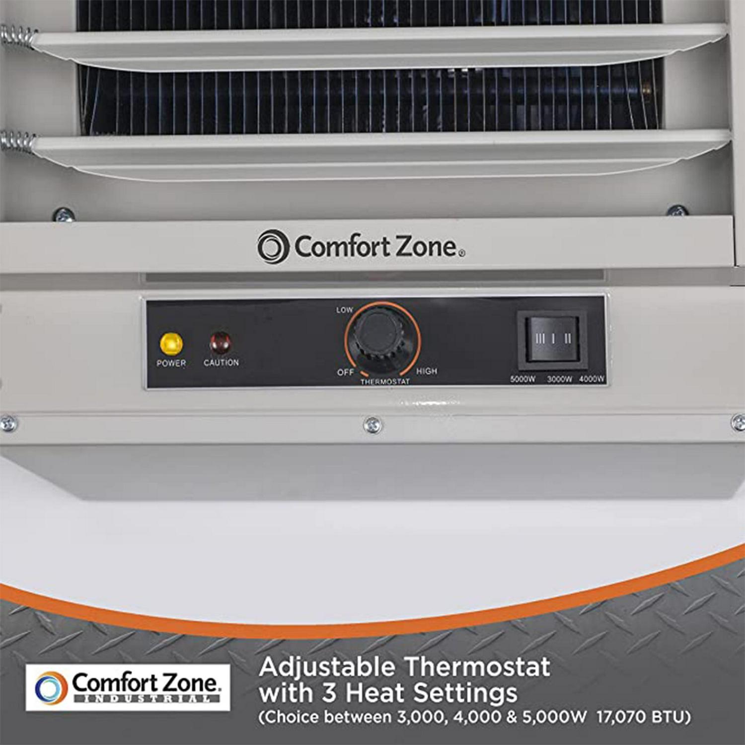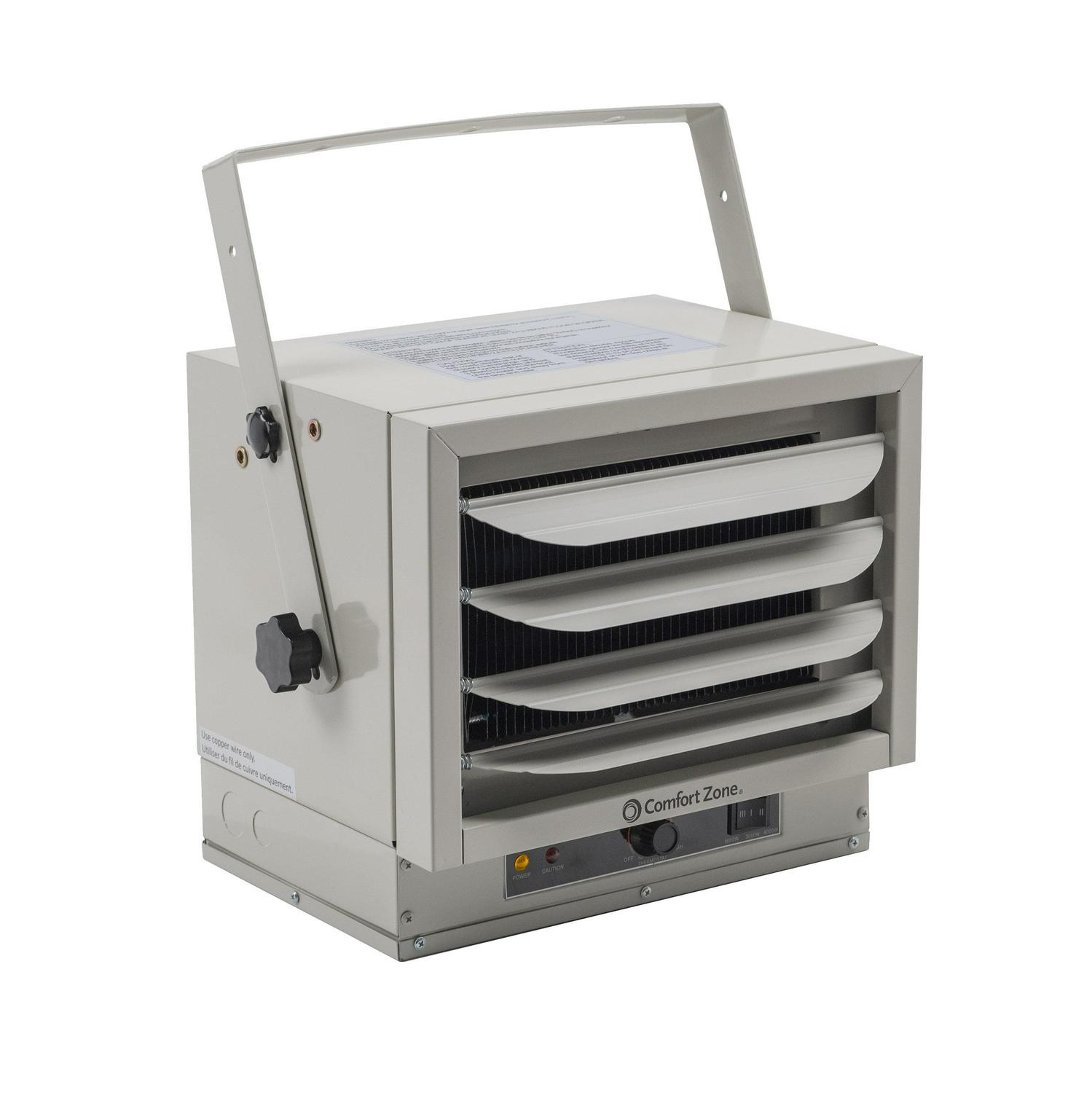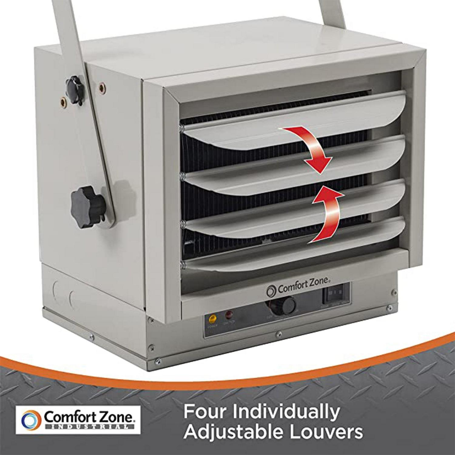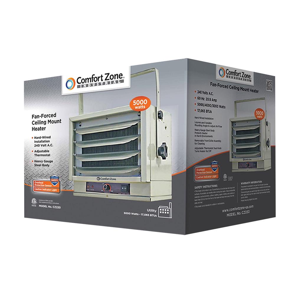 Give your garage or workshop a boost of warmth and comfort with the Comfort Zone Fan-Forced Ceiling Mount Heater. Designed for use in harsh, poorly insulated environments, the commercial heater is built with a rugged heavy gauge steel body that endures sudden temperature changes with ease. The combination of louvers and a variable mounting angle allows you to direct the ceiling mount heater’s output to a specific area of your space, ensuring that the warmth goes where it’s needed most. The fan-forced design helps to disperse heat throughout your space more evenly, while a convenient dual knob at the front allows you to quickly and easily adjust the thermostat to just the right temperature. The Comfort Zone ceiling mount heater’s front grill assembly can be easily removed whenever it needs cleaning. To help prevent accidental damage to the unit from prolonged overheating, a built-in sensor automatically turns the heater off whenever it reaches an unsafe temperature. The fan-forced heater is designed for hard-wired installation, and it requires a 240 Volt AC plug.