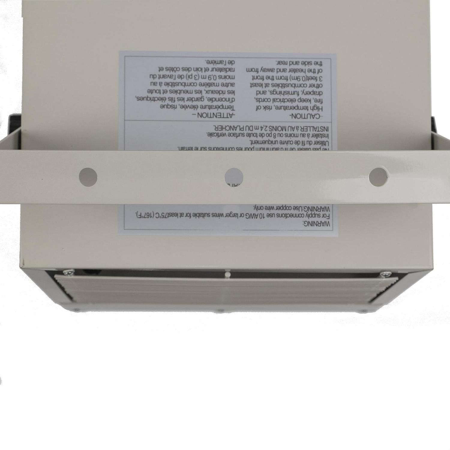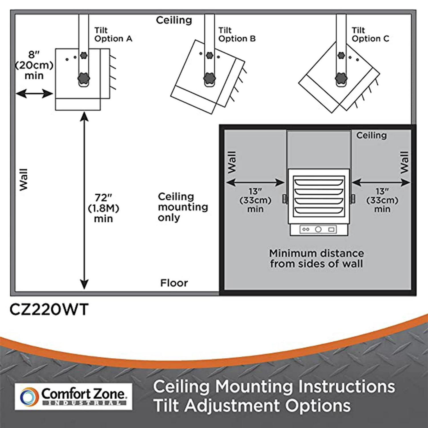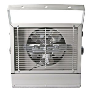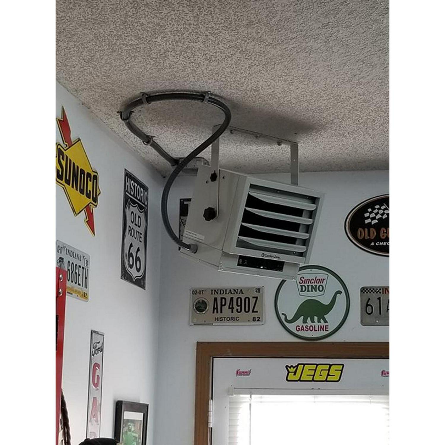 Give your garage or workshop a boost of warmth and comfort with the Comfort Zone Fan-Forced Ceiling Mount Heater. Designed for use in harsh, poorly insulated environments, the commercial heater is built with a rugged heavy gauge steel body that endures sudden temperature changes with ease. The combination of louvers and a variable mounting angle allows you to direct the ceiling mount heater’s output to a specific area of your space, ensuring that the warmth goes where it’s needed most. The fan-forced design helps to disperse heat throughout your space more evenly, while a convenient dual knob at the front allows you to quickly and easily adjust the thermostat to just the right temperature. The Comfort Zone ceiling mount heater’s front grill assembly can be easily removed whenever it needs cleaning. To help prevent accidental damage to the unit from prolonged overheating, a built-in sensor automatically turns the heater off whenever it reaches an unsafe temperature. The fan-forced heater is designed for hard-wired installation, and it requires a 240 Volt AC plug.