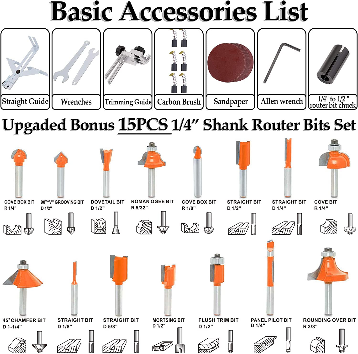 Powerful Motor: 30000 RPM, 6.5 amp motor with the max horsepower of 1.25 provides plenty of power and durability required to cut in various materials. Easy to Operate: Clear plastic fixed base provides a better line of sight while trimming. Smooth rack-and-pinion depth adjustment for easy and precise operation. Ergonomic Design: Rubber-covered handle and small body for increased comfort and control. Efficient cooling system for improved durability. Wide Application: Widely used in wood trimming, wood grooving, wood drilling, handicraft production, wood processing, cabinet processing, surface finishing, chamfering, curve cutting, pattern processing, and DIY. What You Will Get: 1 x compact router 1 x 1/4″ to 1/2″router router collet 1 x Straight Guide 1 x Guide plate 1 x Trimming Guide 2 x Wrenches, 6 x Carbon brush 1 x Bolt , 1 x Screw 15PCS 1/4″ Shank Woodworking Router Bits Set 1 x manual,10 x sandpapers