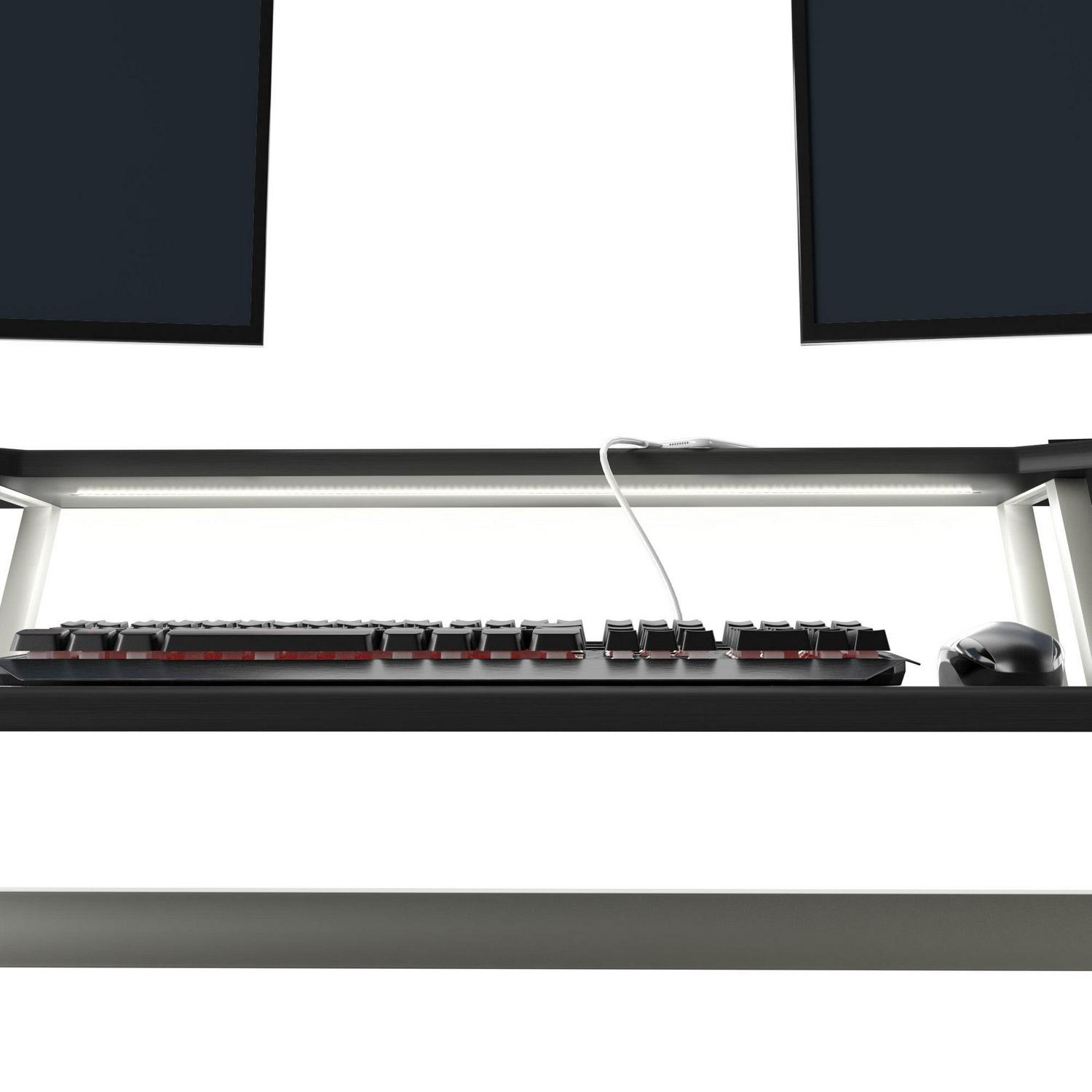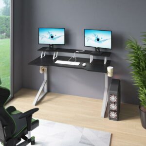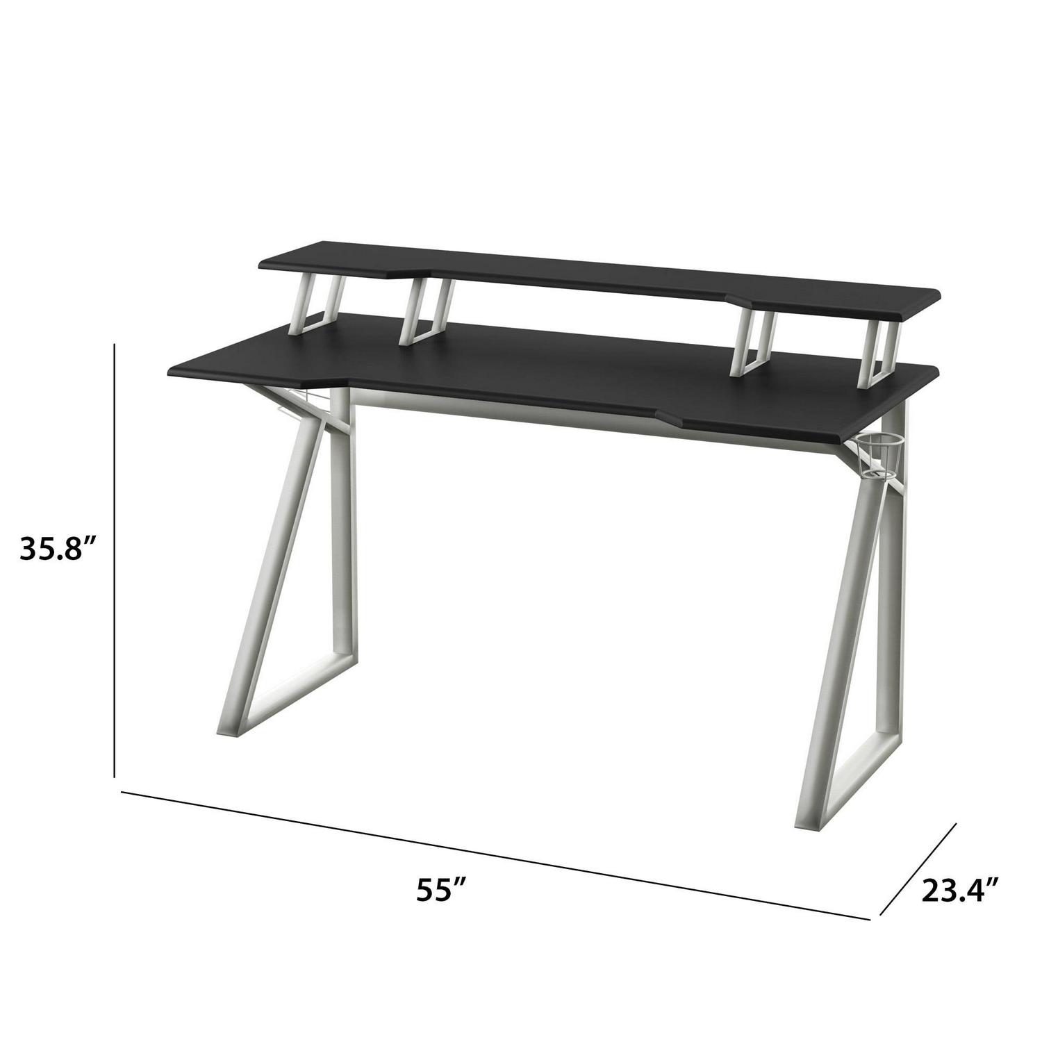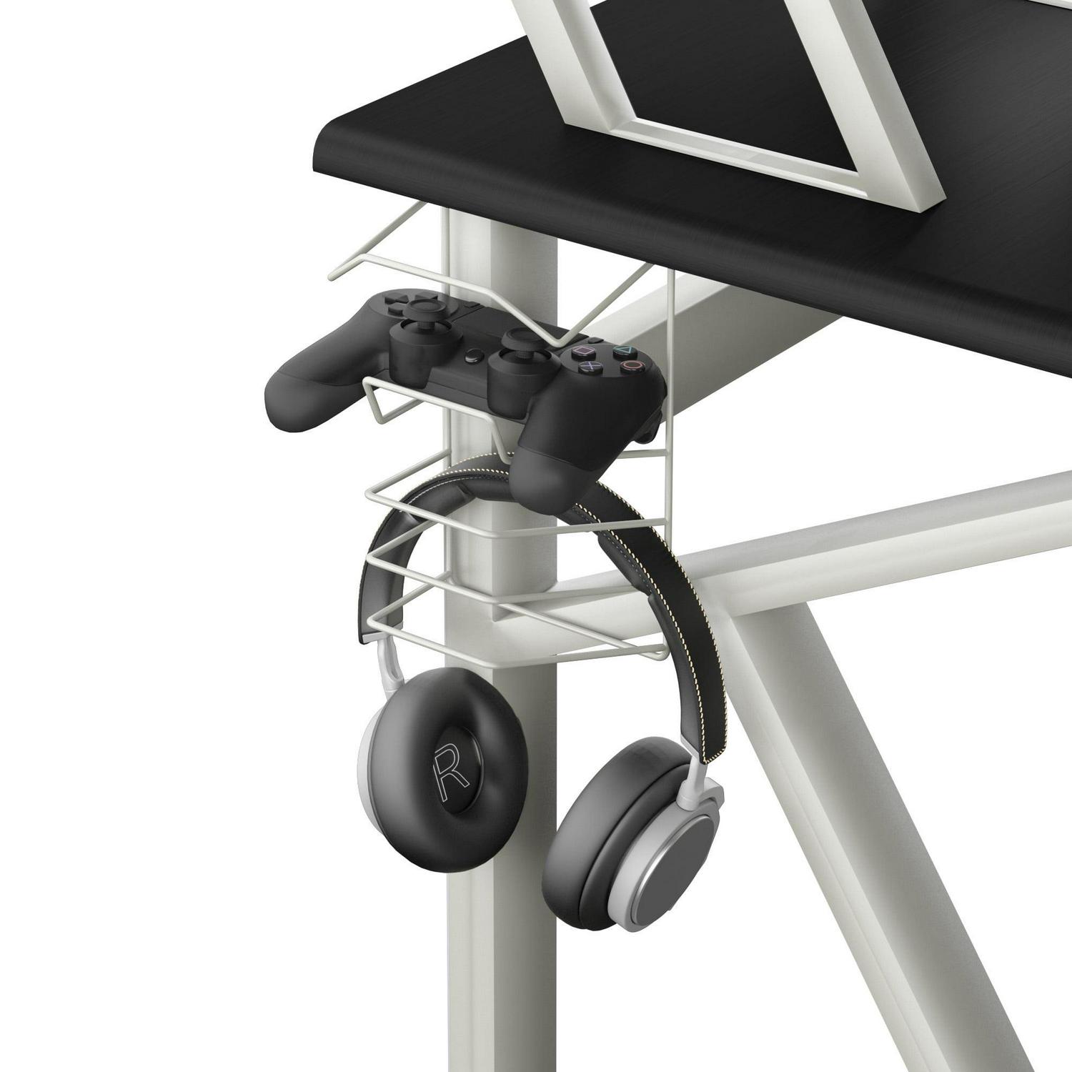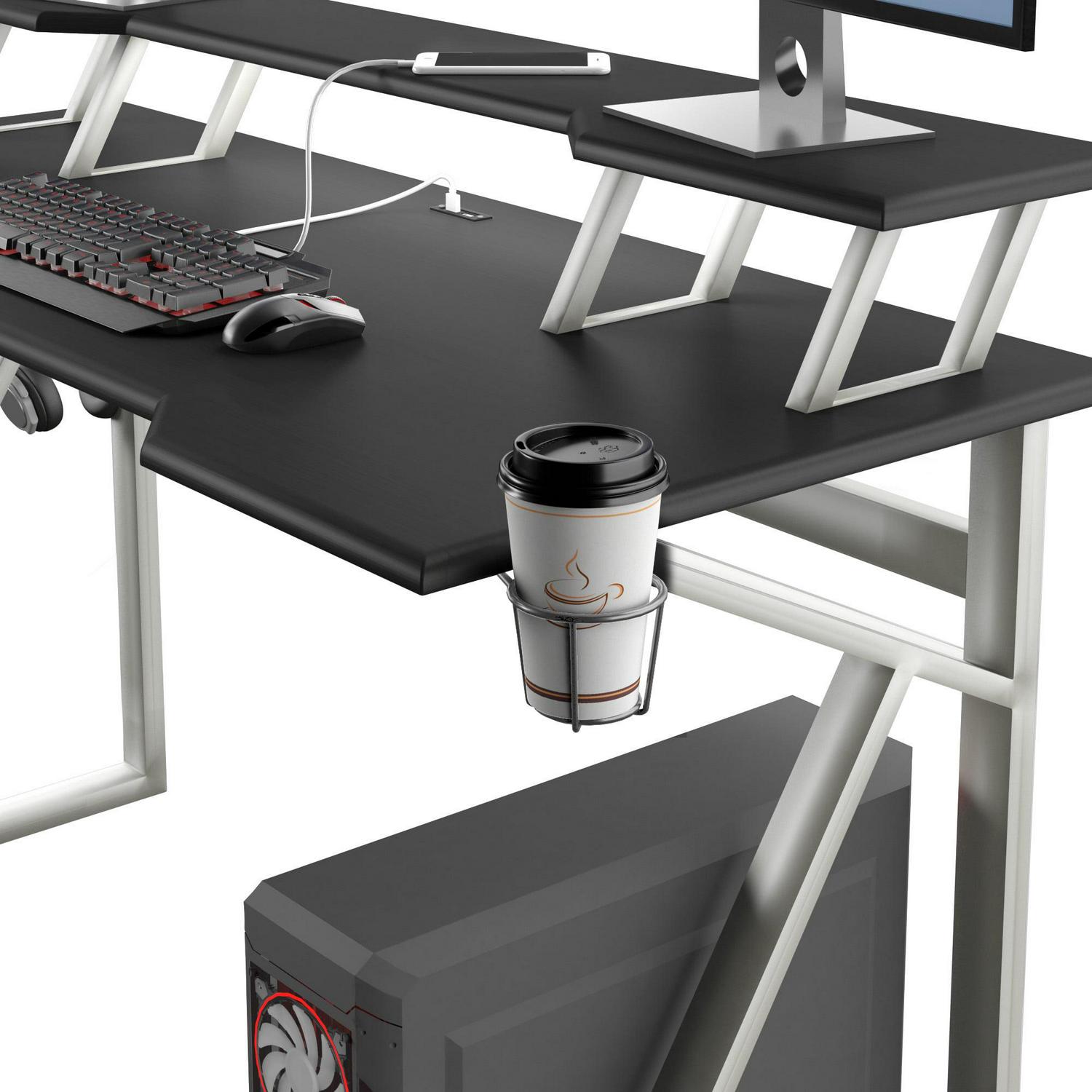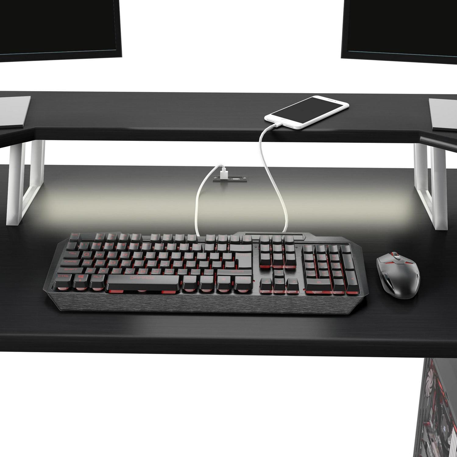 Get a convenient at-home workspace or the ultimate video game setup with this gaming desk that features two built-in USB power ports and a functional design. The integrated charging allows you to keep your mobile devices, controllers, and more power throughout the day. Meanwhile, the game controller and headphone rack attached to the side of the desk keep all your video game marathon necessities close at hand. An attached cup holder on the other side of the desk helps you stay hydrated. The sturdy metal frame also features a desktop with a second elevated surface that is ideal for keeping your monitor at eye level while you work or play. And built-in LED lighting beneath the raised upper level makes it easier to see items on your desktop to optimize your work environment.