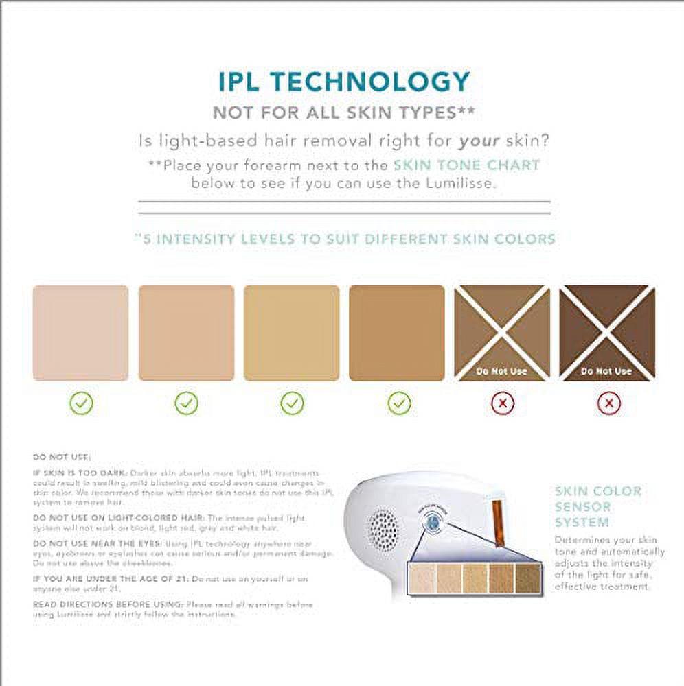 Now you can remove unwanted hair and dramatically reduce its growth with FDA-cleared, clinically proven light technology no shaving blade or foil needed. Lumilisse by Conair uses Intense Pulsed Light Technology (IPL) to work below your skin’s surface to impede the growth cycle of hair and remove unwanted hair from your face, legs, arms, bikini area, stomach, and chest. IPL leaves your skin irresistibly smooth and silky and produces long-term results. This innovative, noninvasive hair removal device reduces hair by over 75% and averages a 78.3% reduction in hair growth based on a clinical study of leg hair. UV free, with a long-lasting xenon tube bulb that delivers 300,000 pulses, Lumilisse provides professional-caliber hair removal in the comfort of home. 2 heads face and body ensure optimal treatment for head-to-toe hair removal. What’s more, the skin color sensor system automatically adjusts to suit your skin tone. While not suitable for beards or every skin tone or complexion, Lumilisse is clinically proven to gently and painlessly eliminate hair at the roots and prevent regrowth for smooth, silky results that last. Be sure to refer to the color chart and instruction booklet included with Lumilisse to determine if this hair removal solution is right for your skin type.