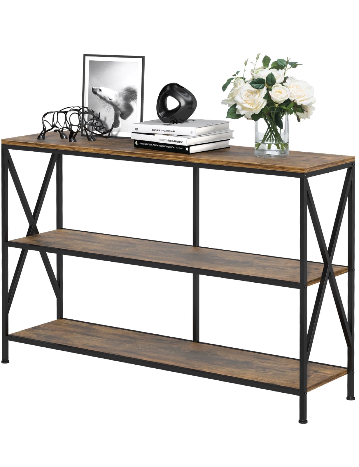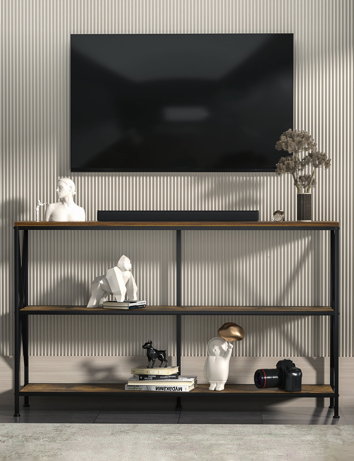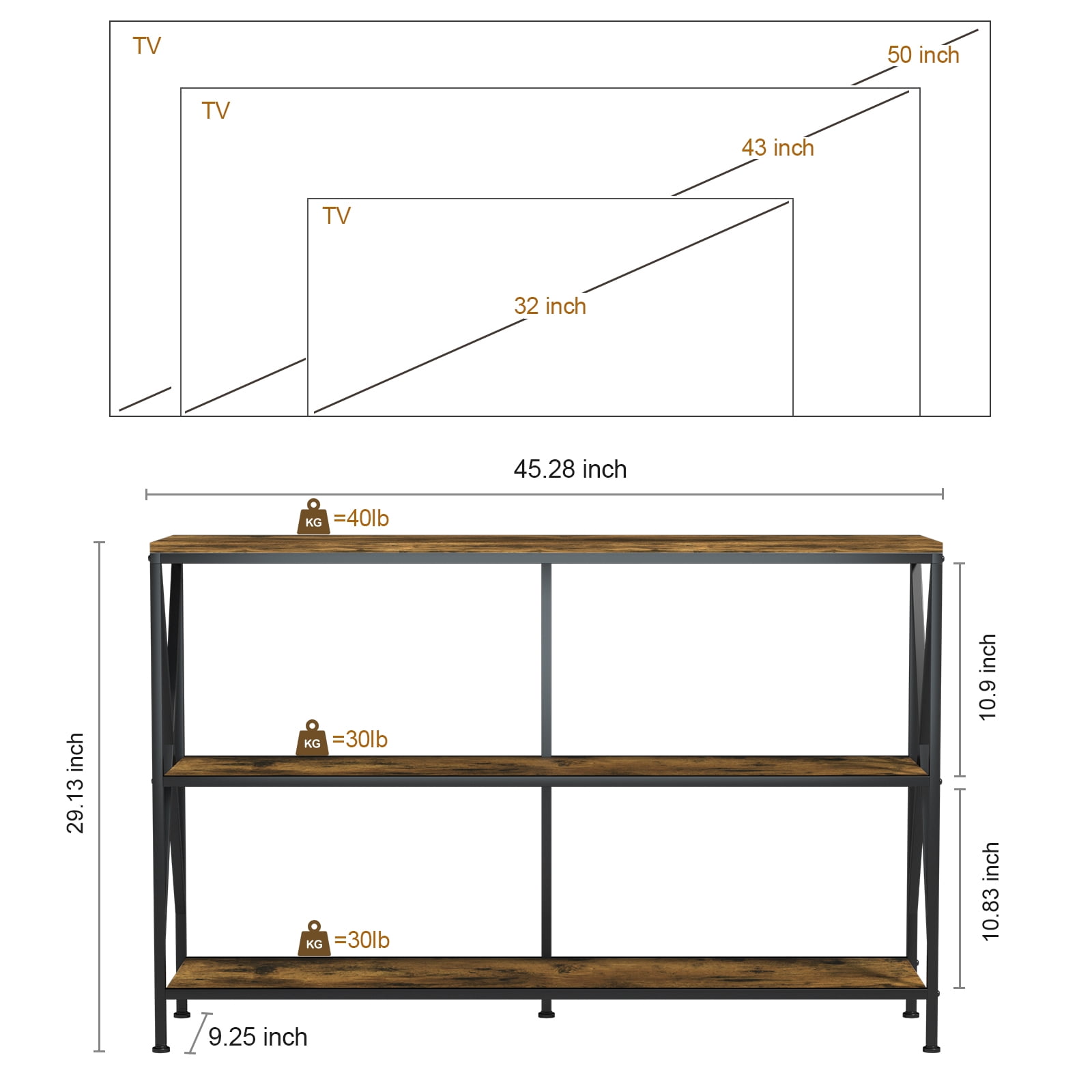 Sturdiness and Durability This Entryway table crafted from high quality MDF and heavy duty powder-coated black metal frame with rust-resistant effect, ensures sturdiness and years of use. Double geometric frame braces in both side strengthen the stability and durability. Multifunctional Console Table Give a vintage and industrial atmosphere to your home space with our stylish console table. The frosted black metal frame with wood grain veneer creates an elegant classical vintage style and shows a minimalist style, making your living room full of art. This console table is perfect for entryway, hall, foyer, entrance, mud room, living room or office as console table, sofa table, corridor table, entryway table, TV stand or even shoe rack. Ample Storage Space This 3-tier shelf entryway table provides a spacious storage space to meet your daily storage needs. The 3-tier open shelves can be made full use of to store plenty of things like books, decorative plants, collectibles, family portraits and other items. Both be used as display shelf to display your artworks and be used as storage shelf, this table is a perfect choose to make your room elegant, concise, and organized. TV stand Adapt to TVs up to 55 inches Overall dimensions of the long TV stand is 45.28”L x 9.25”W x 29.13”H .This TV stand can accommodate flat curved screens up to 55″ (55″, 50″, 43″, 32″, etc. ). There is 10″ of space between each tier, allowing you to place bulky items. Table top holds up to 110 lbs, each mesh shelf can hold up to 40 lbs.Total load capacity of this sofa table: 100 LBS Easy to Assemble This sofa table with detailed instructions and necessary hardware, you can complete this TV stand installation easily and smoothly. If you have any questions please feel free to contact us.