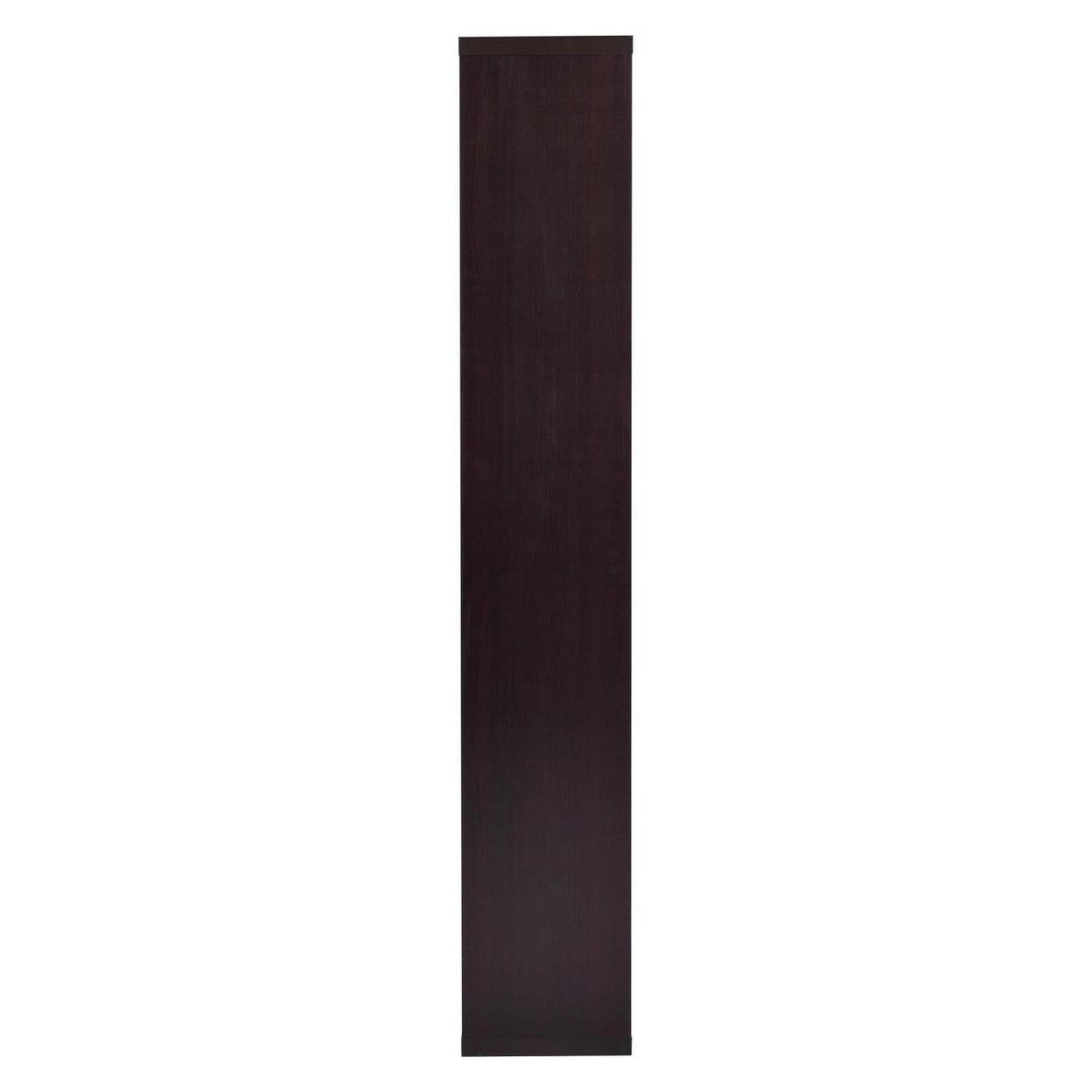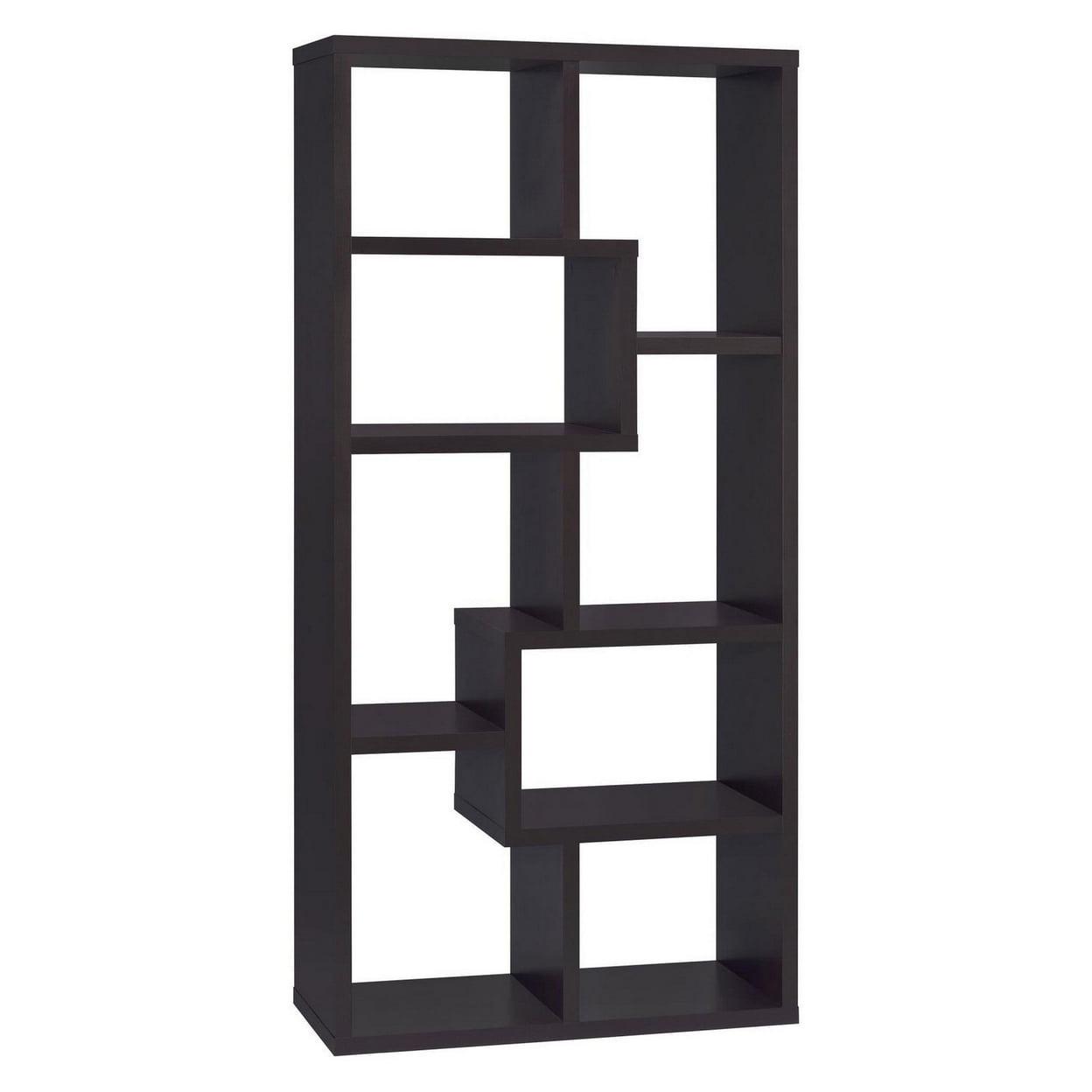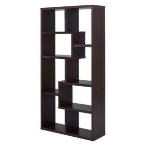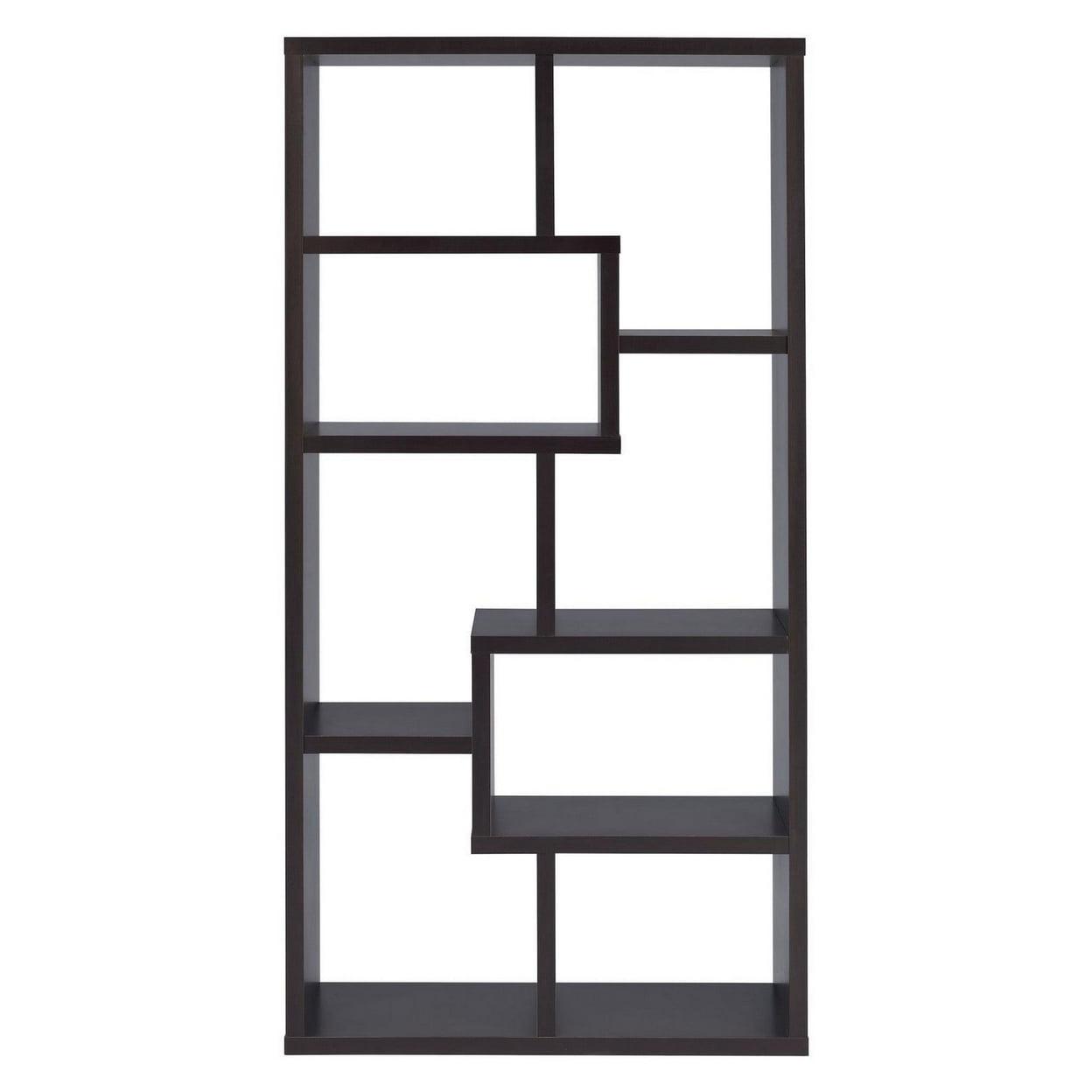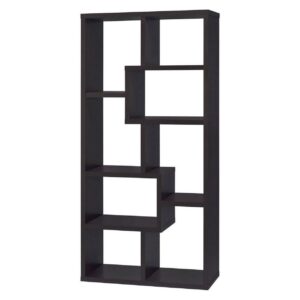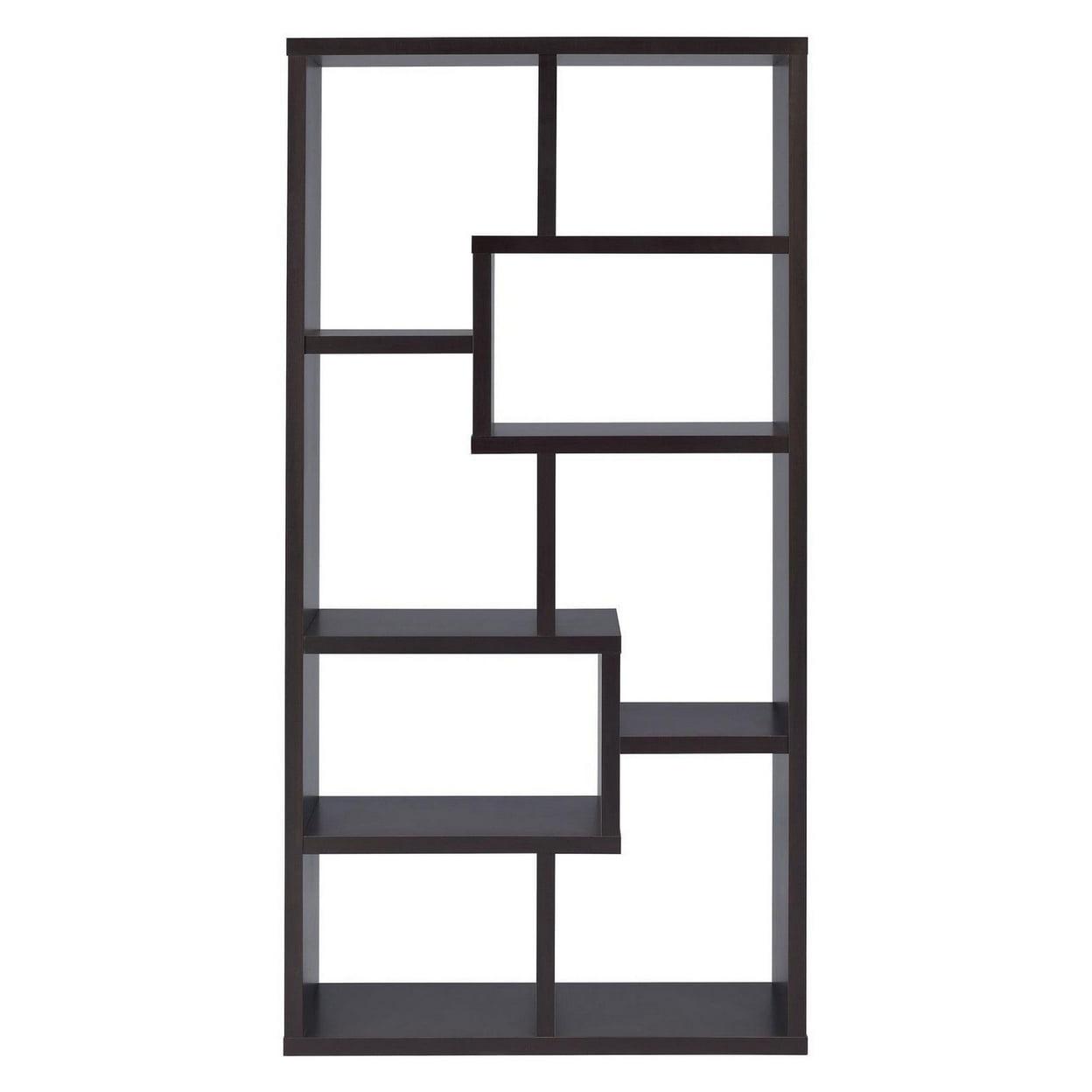 Contemporary Asymmetrical Cube Bookcase, Brown- Saltoro Sherpi This bold contemporary bookcase will add stylish storage to your living room, office, or hallway. Finished in a deep Cappuccino, this sleek backless bookcase features an asymmetrical design with staggered cube shelves. Eight spacious compartments in various sizes offer lots of space for books, framed photos, and your favorite decorative items. Spice up your home with this sophisticated storage unit for an instant style update in any room of your home.