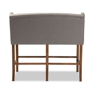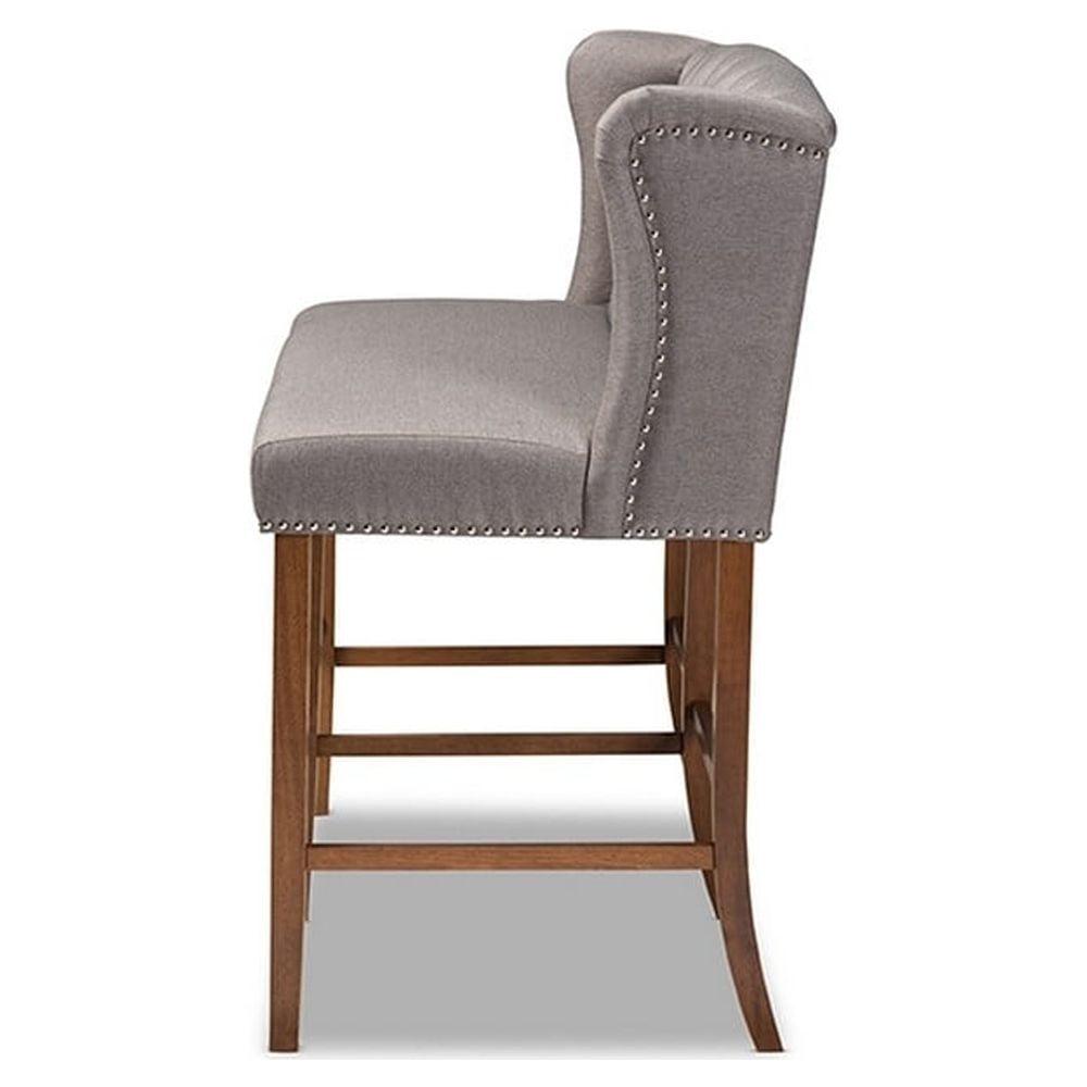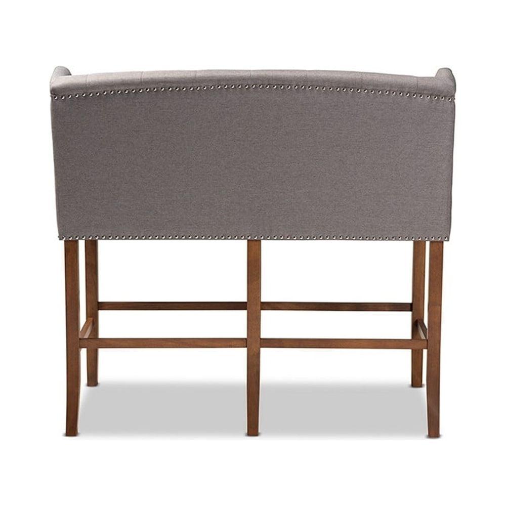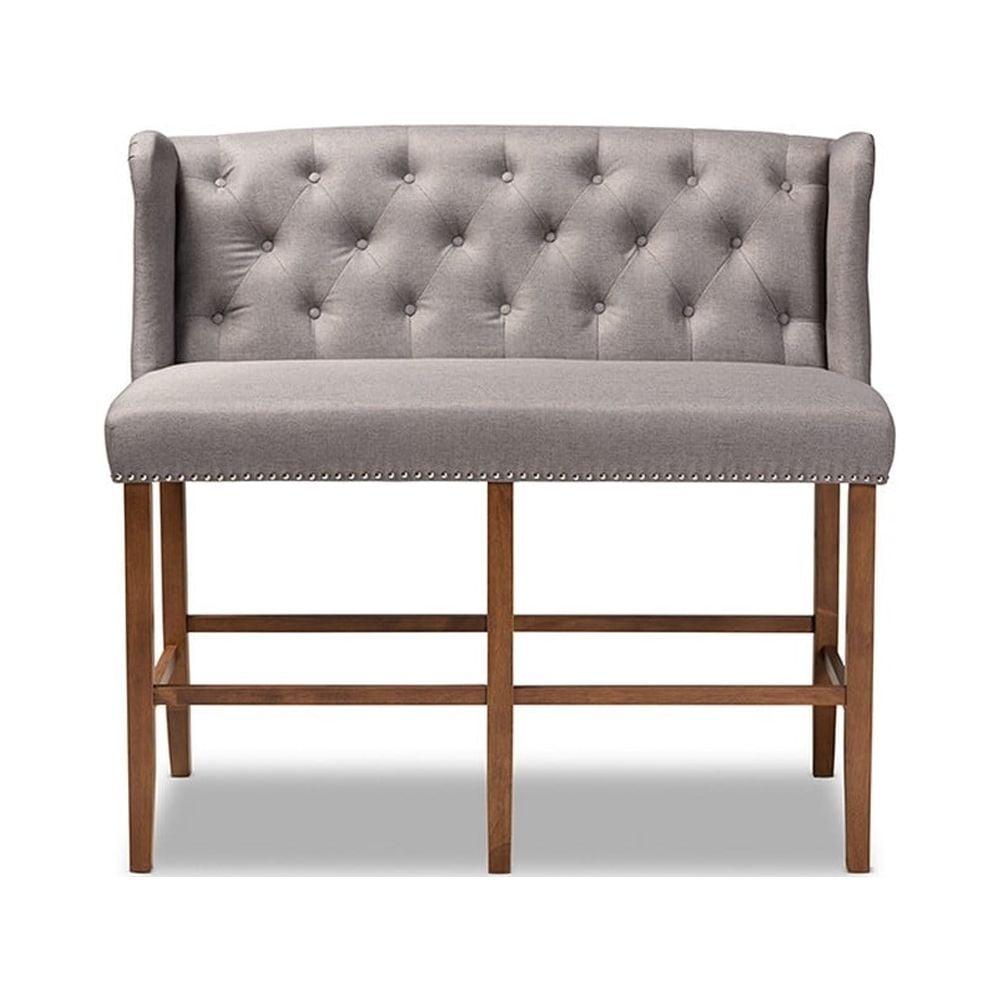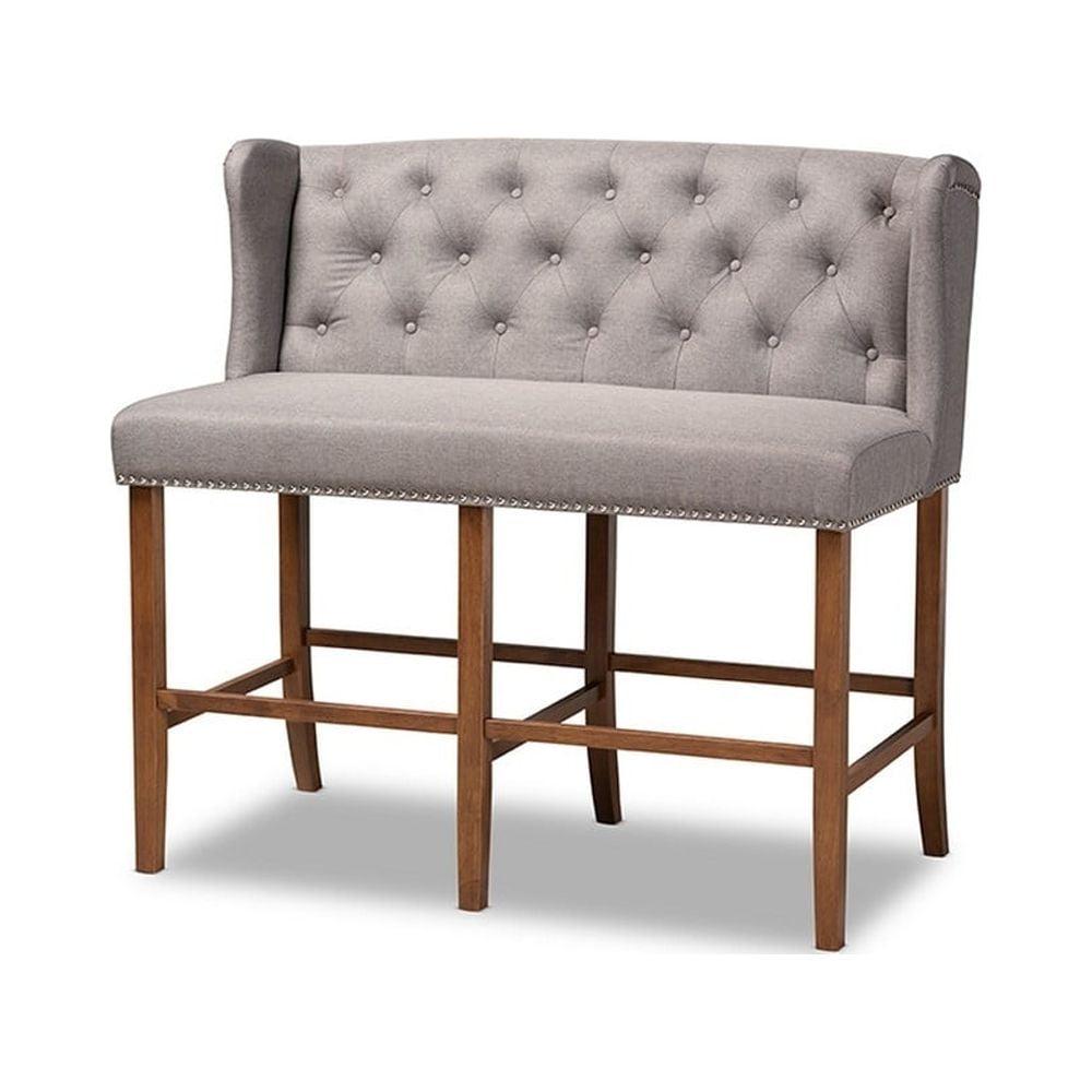 Contemporary Grey Fabric Upholstered Walnut Finished Wood Button Tufted Bar Stool Bench Host happy hour in your home with the Alira bar stool bench. Constructed from wood, this bench provides solid seating for two. The seat and back are upholstered in a soft neutral fabric and padded with foam for endless comfort. A built-in foot rest provides additional seating comfort. Elaborate button tufting on the back gives this bench a refined look, while silver nail heads highlight the elegant wingback silhouette. The Alira is well suited for both a kitchen or bar setting. The Alira bar stool bench is made in Malaysia and requires assembly.