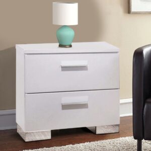 Contemporary Style Wooden Nightstand with Two Drawers and Metal Bracket Legs , White- Saltoro Sherpi Create a graceful bedroom environment with this traditional style night stand finished. Place your most cherished photos, vases on top and create a charming corner in your bedroom. Incorporating two drawers with ample storage space, this night stand is perfect to stash your favorite books and magazines and you most frequently used items. Its wooden construction makes for a sturdy structure and offers robustness. This stunning piece is finished in hues of white.