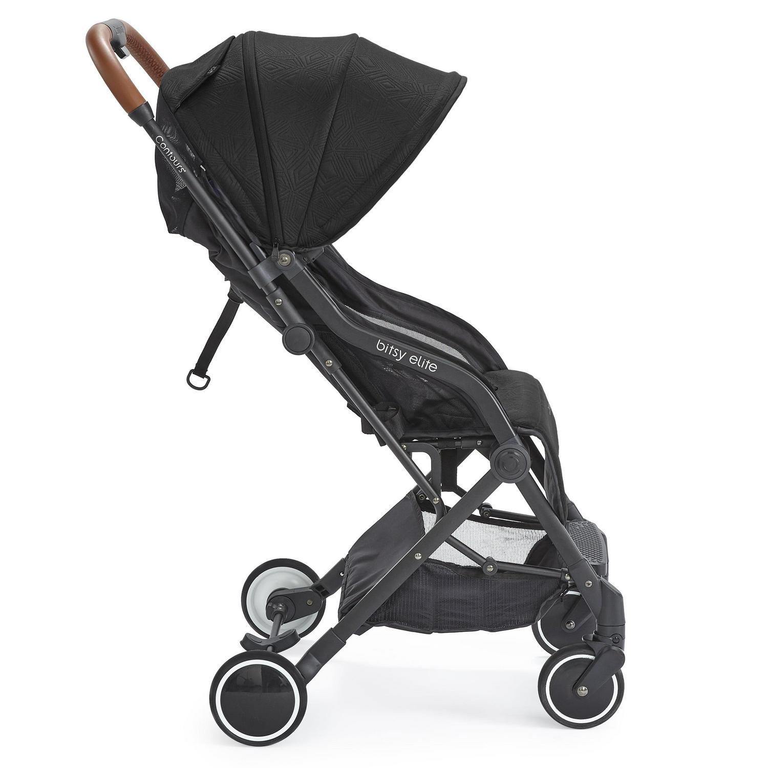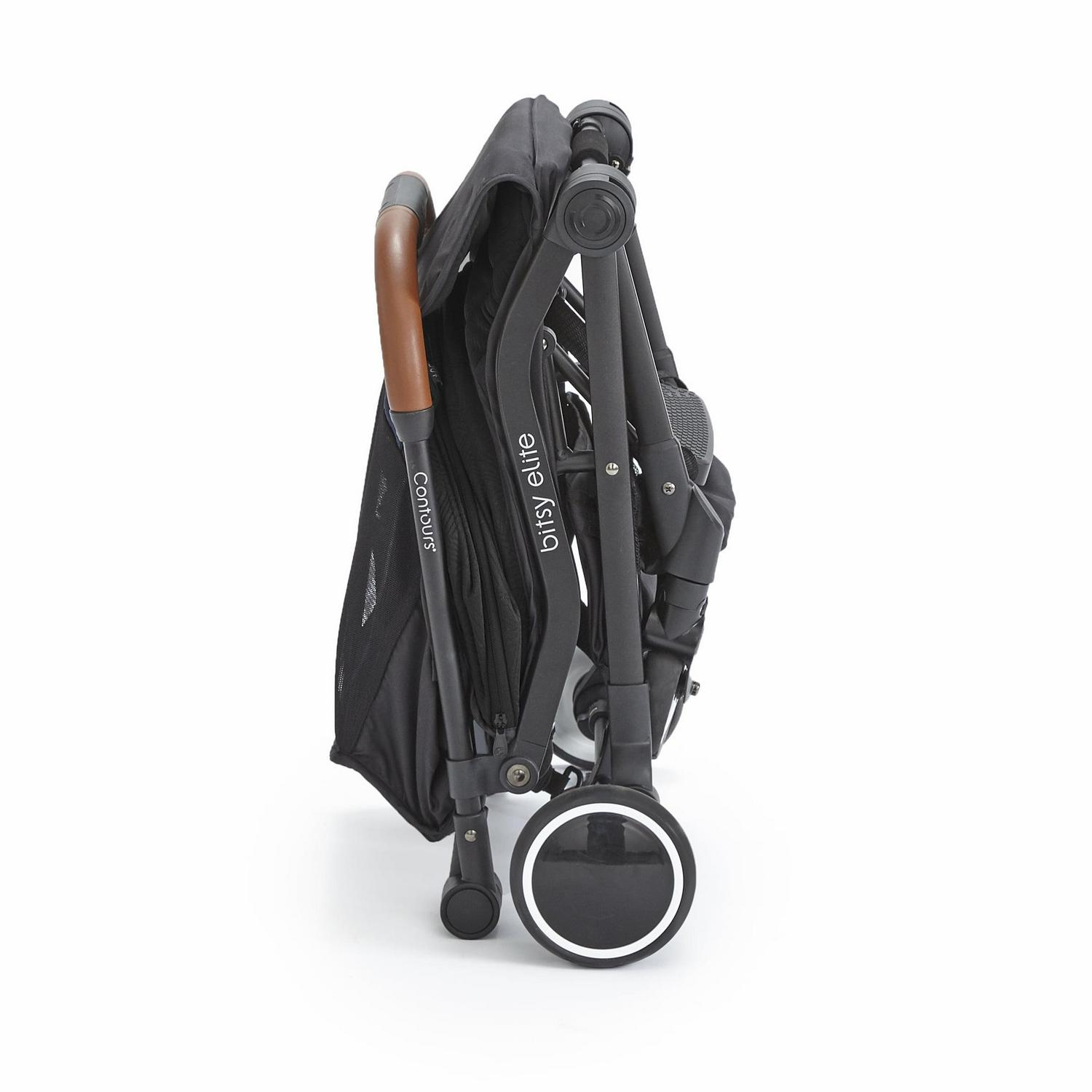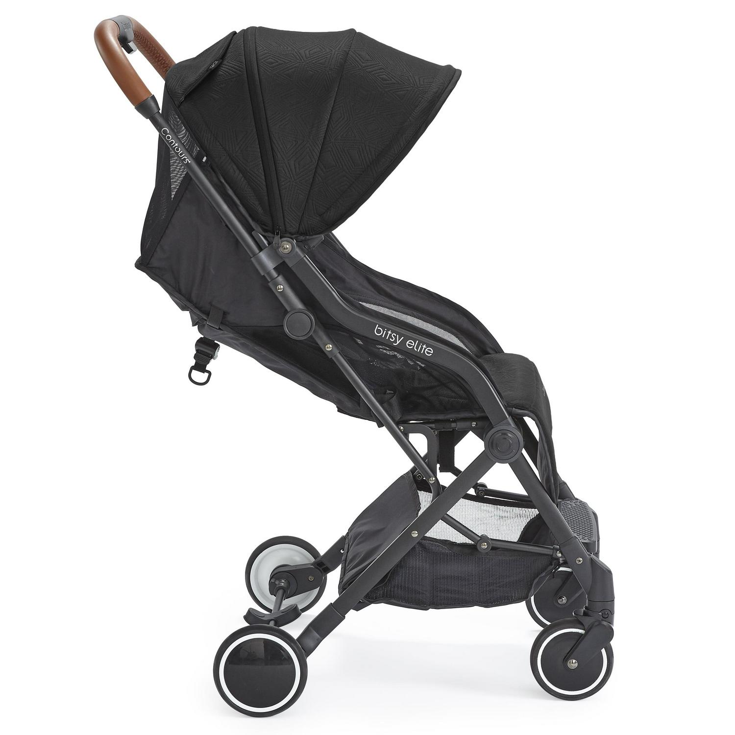 You and your little one can travel with ease in the stylish and sleek Contours Bitsy Elite lightweight travel stroller. The easy one-hand fold makes traveling with your kiddo a breeze and the compact size is small enough to fit in most airplane overhead compartments. Modern features include luxurious knit fabric, a leatherette handle, a 5-point harness, and mesh in the seat area for maximum breathability. For the ultimate on-the-go flexibility, the Bitsy Elite is compatible with 35+ infant car seats, no separate car seat adapter needed. A peek-a-boo window lets you easily check on your little one. And for extra coverage, unzip the sun canopy for an extra mesh extension. The under seat storage basket expands to hold extra gear while on the go. And the easy-step, sandal-friendly brake makes the compact, lightweight Bitsy Elite easy to take with on your travels. Fits a child up to 40 lb.
