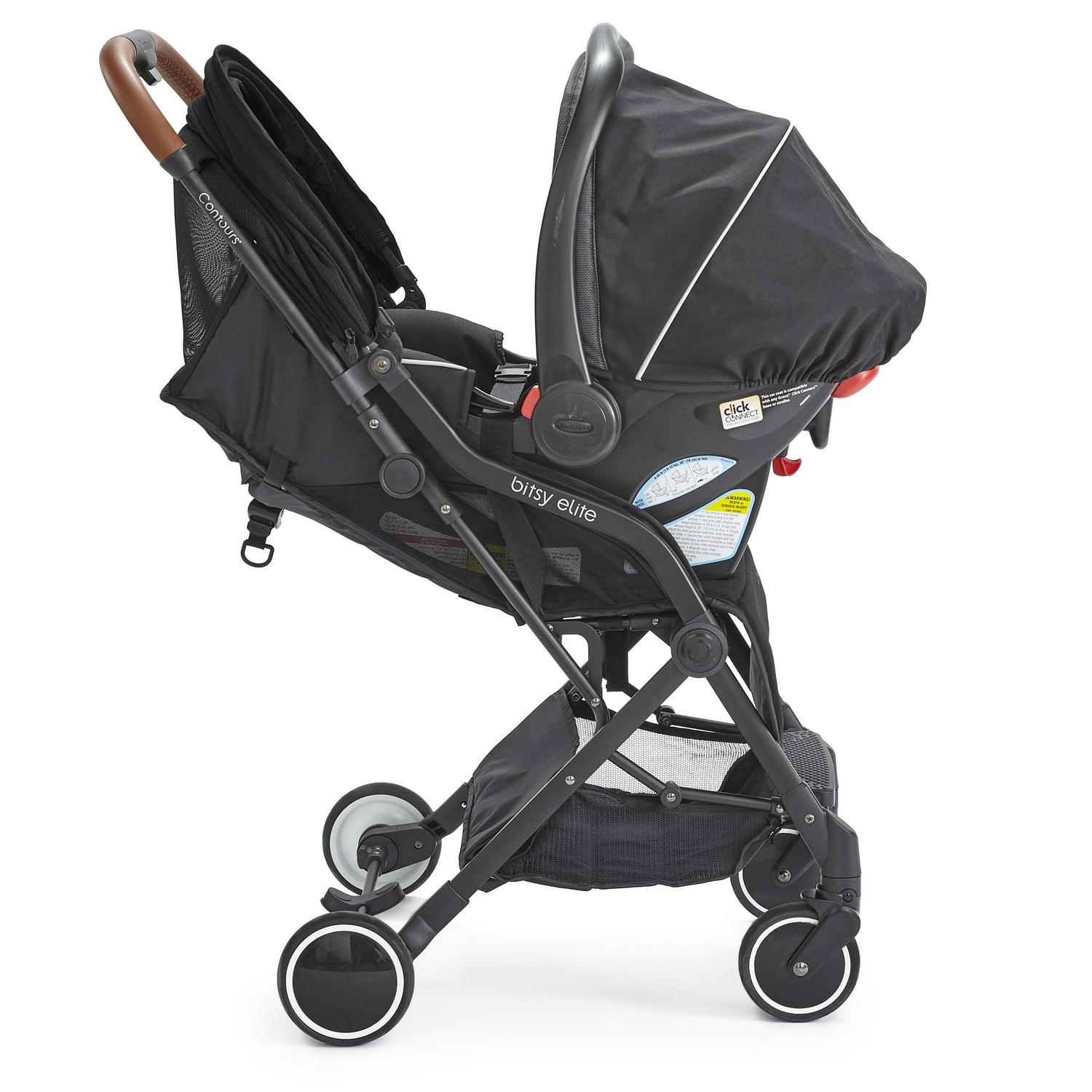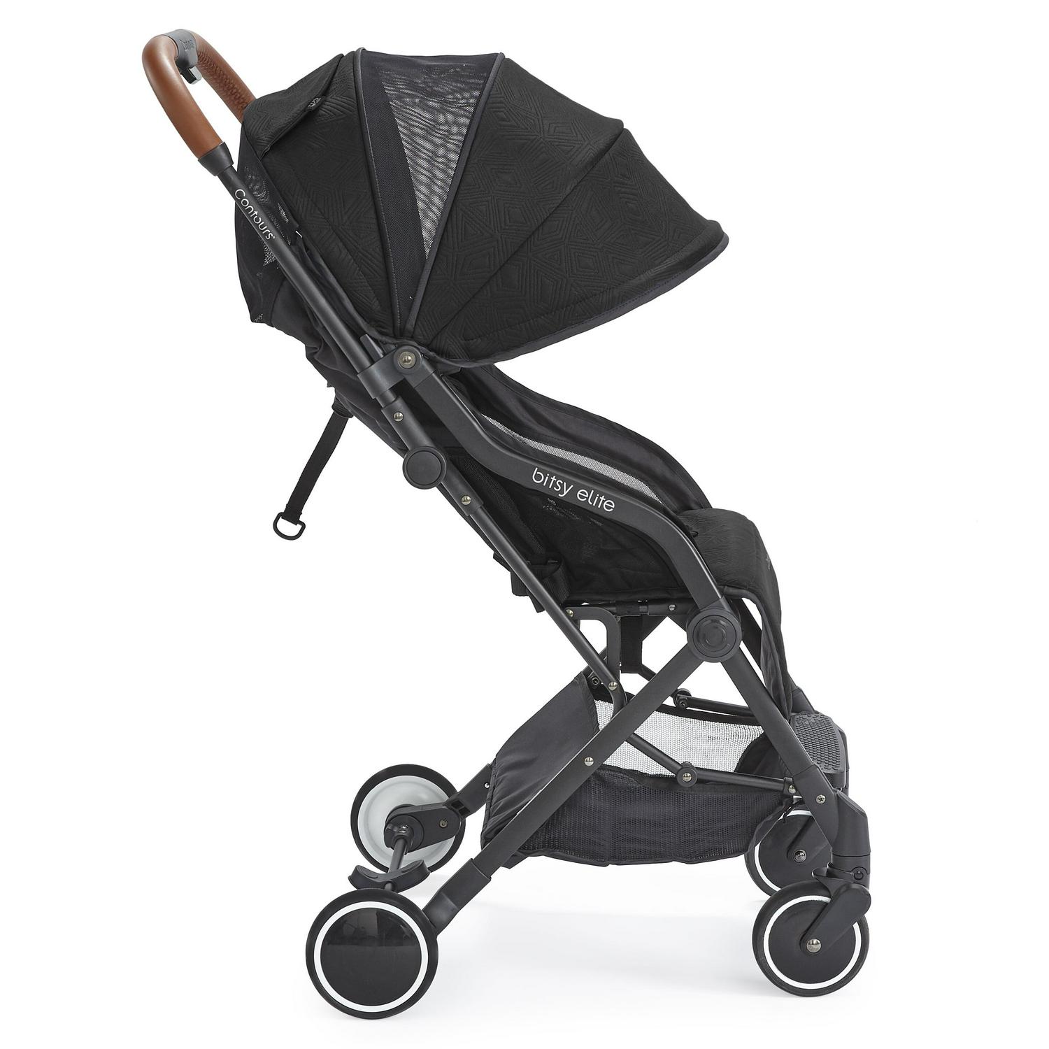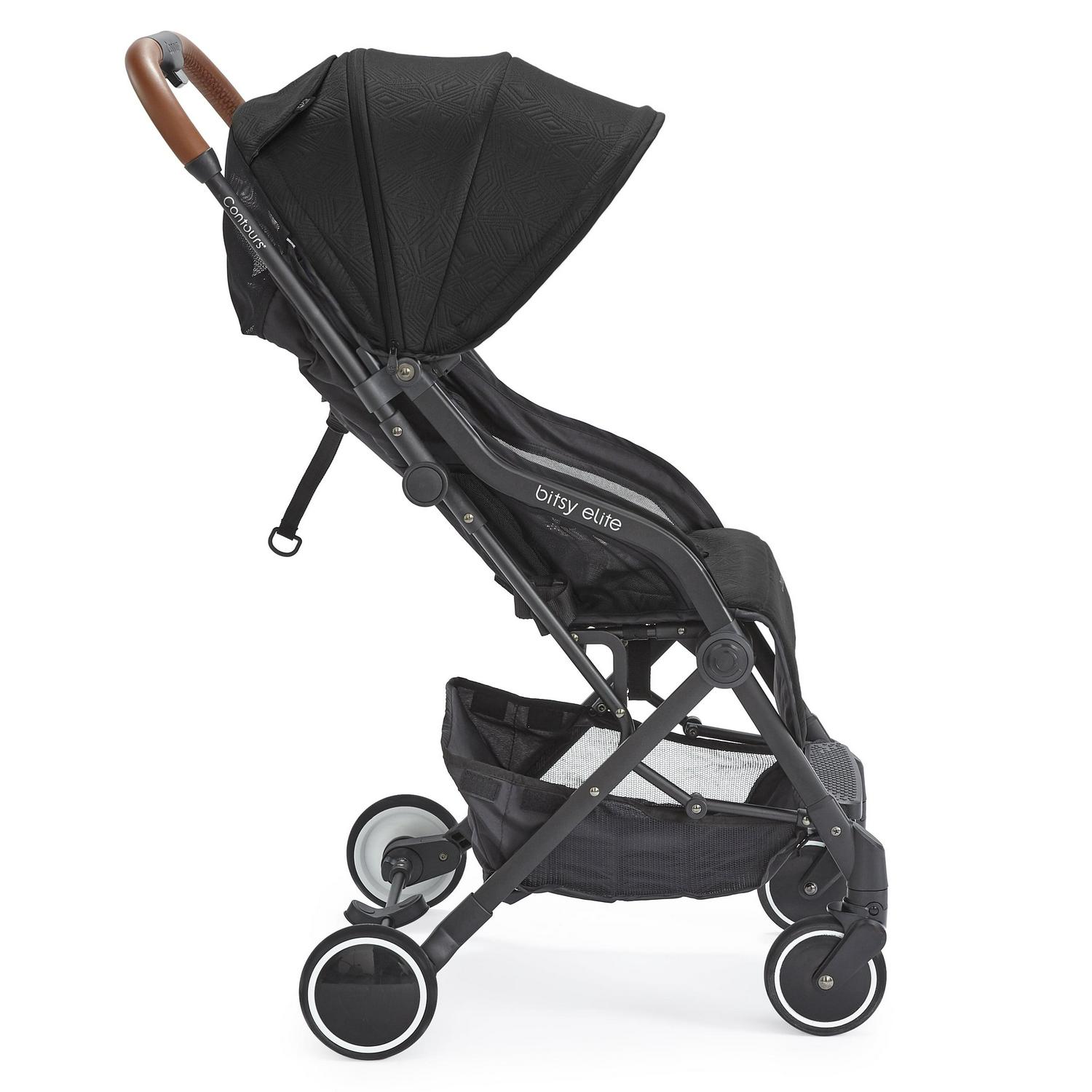 You and your little one can travel with ease in the stylish and sleek Contours Bitsy Elite lightweight travel stroller. The easy one-hand fold makes traveling with your kiddo a breeze and the compact size is small enough to fit in most airplane overhead compartments. Modern features include luxurious knit fabric, a leatherette handle, a 5-point harness, and mesh in the seat area for maximum breathability. For the ultimate on-the-go flexibility, the Bitsy Elite is compatible with 35+ infant car seats, no separate car seat adapter needed. A peek-a-boo window lets you easily check on your little one. And for extra coverage, unzip the sun canopy for an extra mesh extension. The under seat storage basket expands to hold extra gear while on the go. And the easy-step, sandal-friendly brake makes the compact, lightweight Bitsy Elite easy to take with on your travels. Fits a child up to 40 lb.