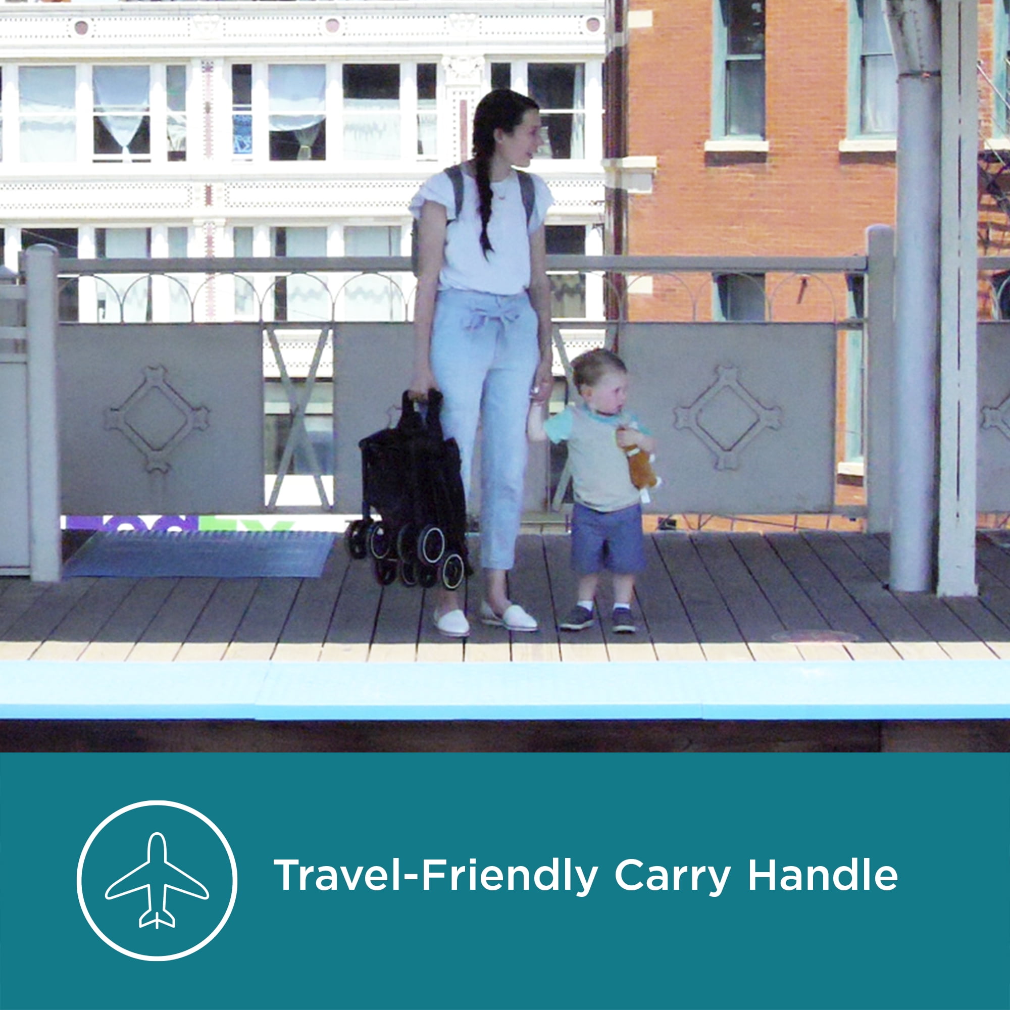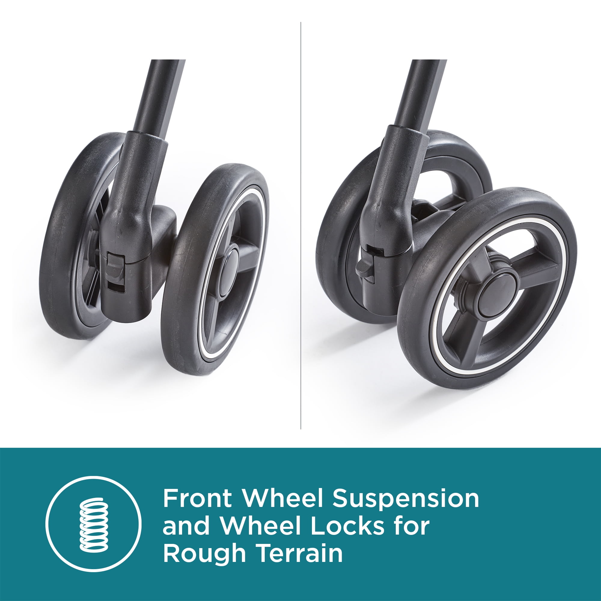 Ultra-sturdy design and front-wheel suspension allow the Contours Itsy® to deftly handle bumps, turns and on-the-go travels with ease. UPF 50+ sun canopy. Mesh panel in the canopy for more airflow and a peek-a-boo view of your child. Padded napper bar removes for easy access in and out of the seat.
