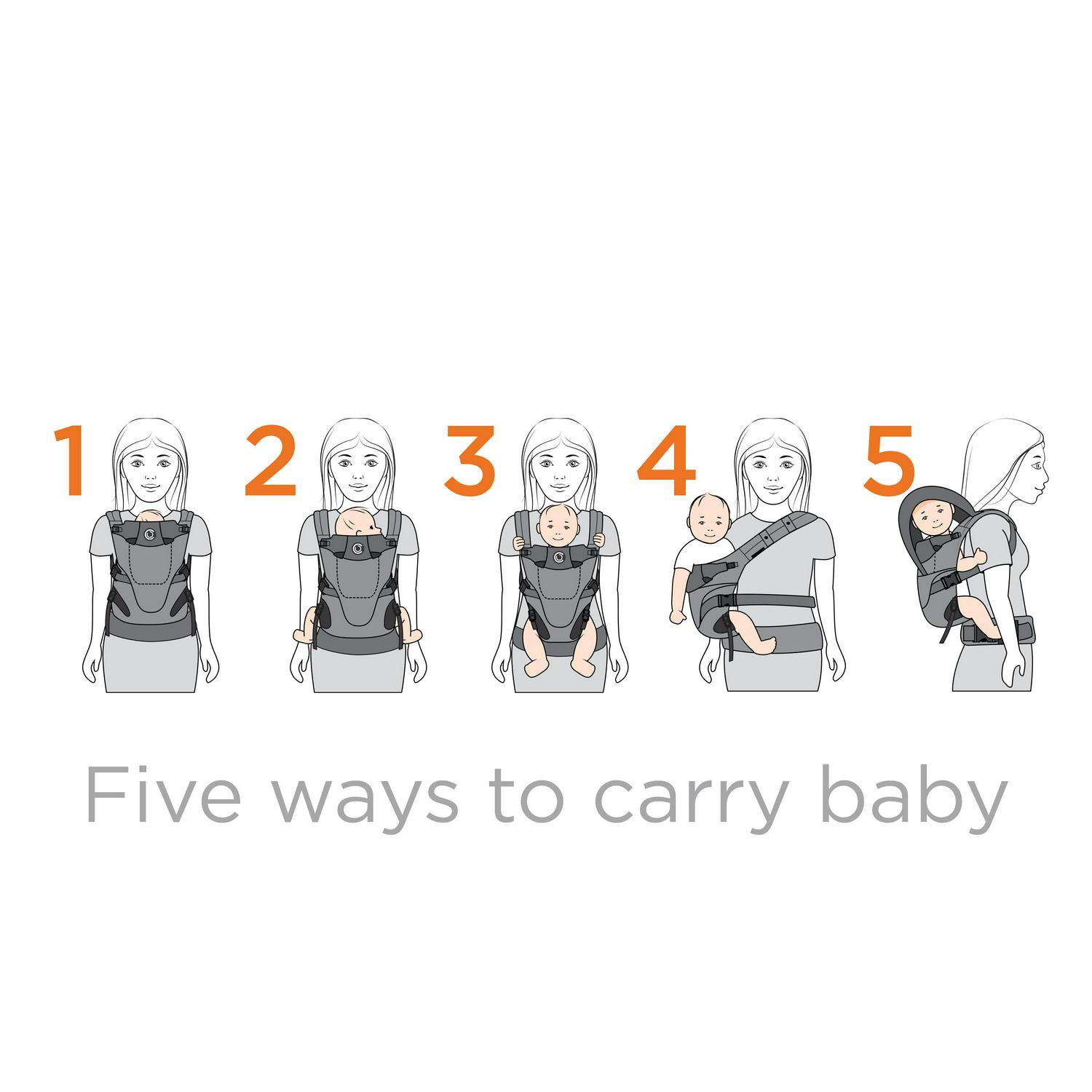– 5 EASY TO USE CARRYING POSITIONS: 5 carrying positions to grow with baby; Newborn; Facing In; Facing Out; Hip, and Back