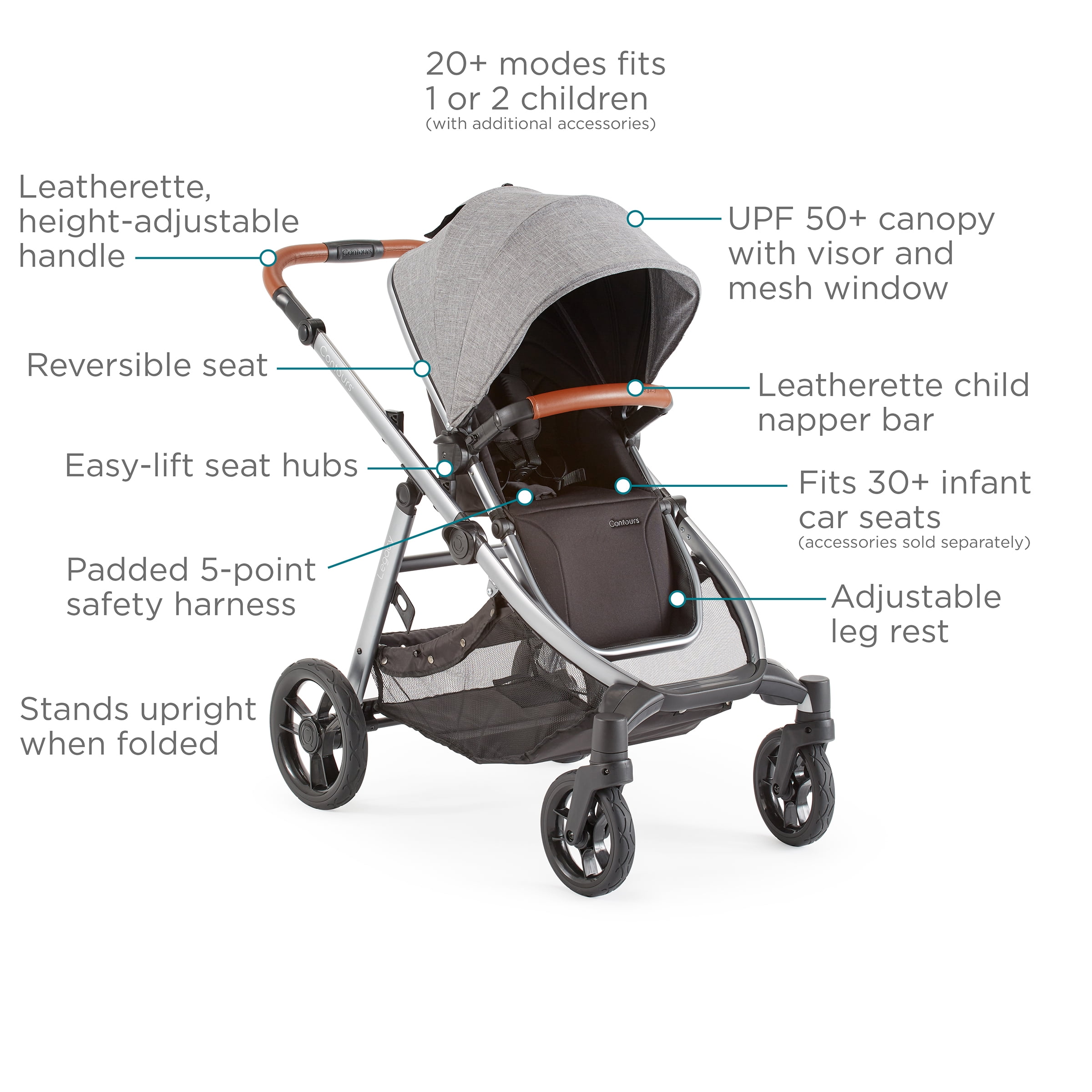 Convertible, grow with me standard stroller that can accommodate 1 or 2 children (with additional accessories) Stands upright when folded (with or without seat attached) In double mode, the stadium-style seats make it easy for the child in the back to see the sights 20+ seating modes Leatherette handle Sandal-friendly brake Expandable UPF 50+ sun canopy