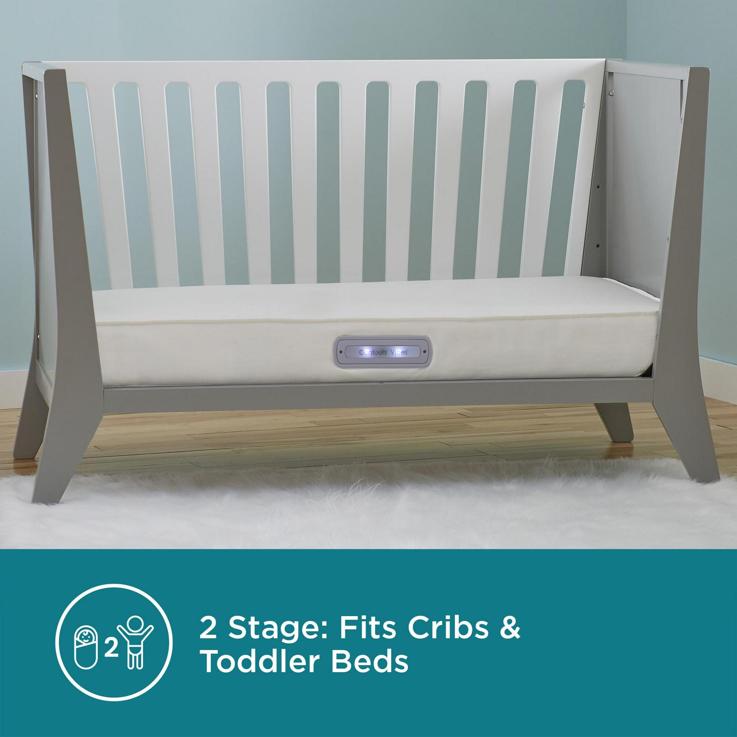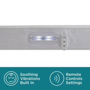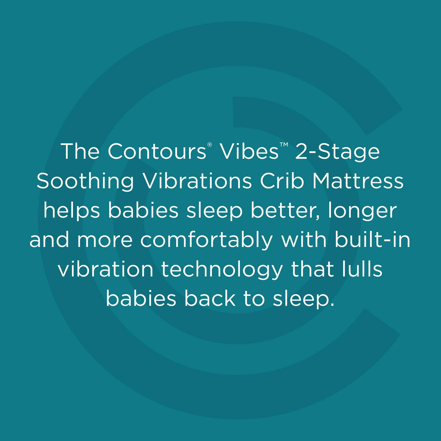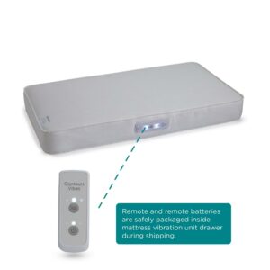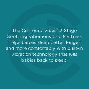 The Contours Vibes 2-Stage Soothing Vibrations Crib Mattress and Toddler Mattress helps infants and toddlers sleep better and longer. An independent infant sleep study showed improved quality and quantity of sleep when babies used this patented vibrating crib mattress. In fact, infant sleep quality improved by 91%, babies slept 78% longer at night, and woke up throughout the night 61% less often. It also helped reduce colic symptoms. Fussy sleepers were able to self-soothe. Soothing vibrations are built into the mattress with an easy-reach button through crib rails! Plus, a remote control and remote batteries are included to easily power up from other rooms in the house. 3 vibration modes and 3 timer settings. Your remote is safely shipped inside the main battery compartment. Superior support throughout. 201 sturdy posture support coils plus steel edges for support. Layered with sustainable, airy cushioning and cotton protective wrap. 2-stage grow-with-me dual firm design. Silky soft cotton fabric surface is breathable on baby’s skin. A waterproof barrier protects the mattress. GREENGUARD GOLD Air Quality Certified for a healthier indoor sleeping environment.