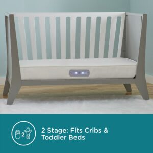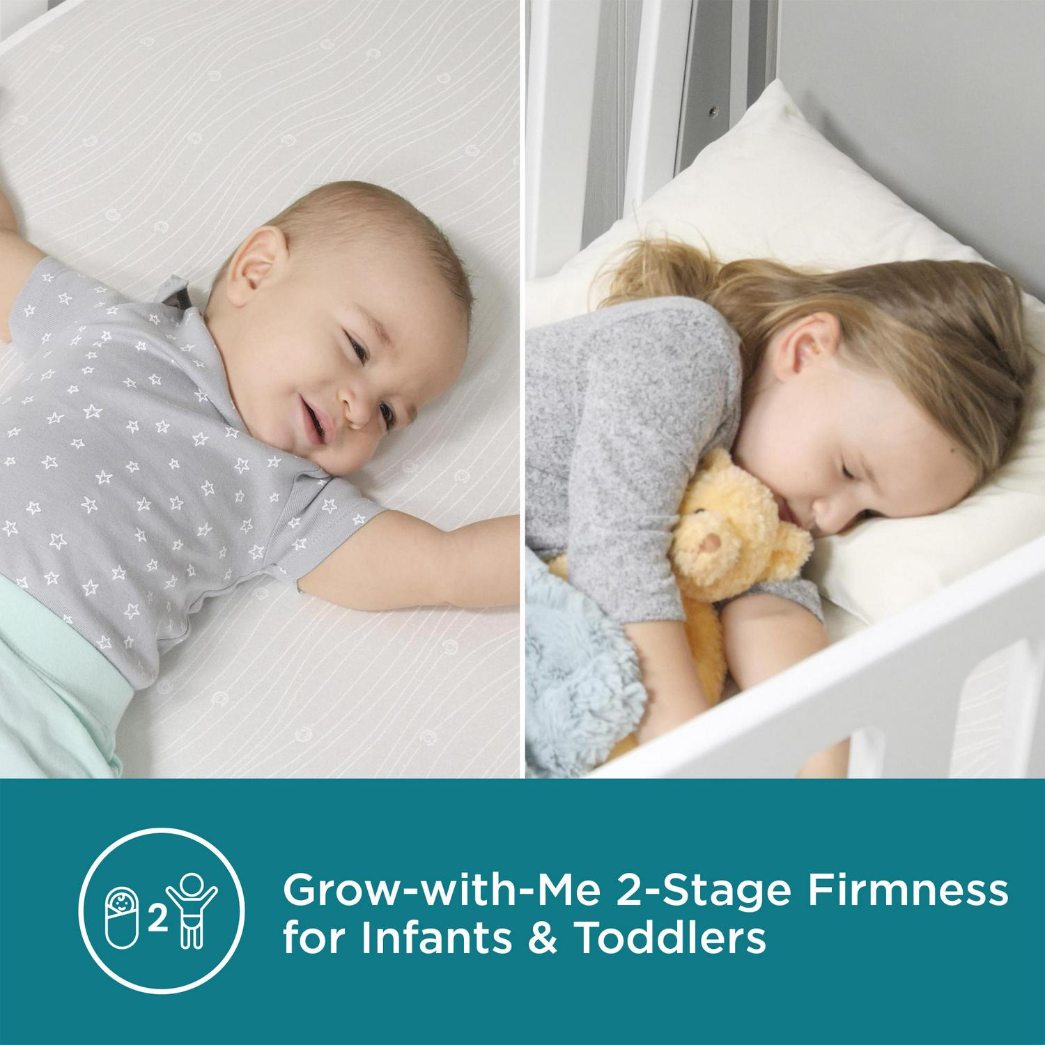 – Designed into a premium 2-stage crib and toddler mattress with a firmer infant side and a softer toddler side.