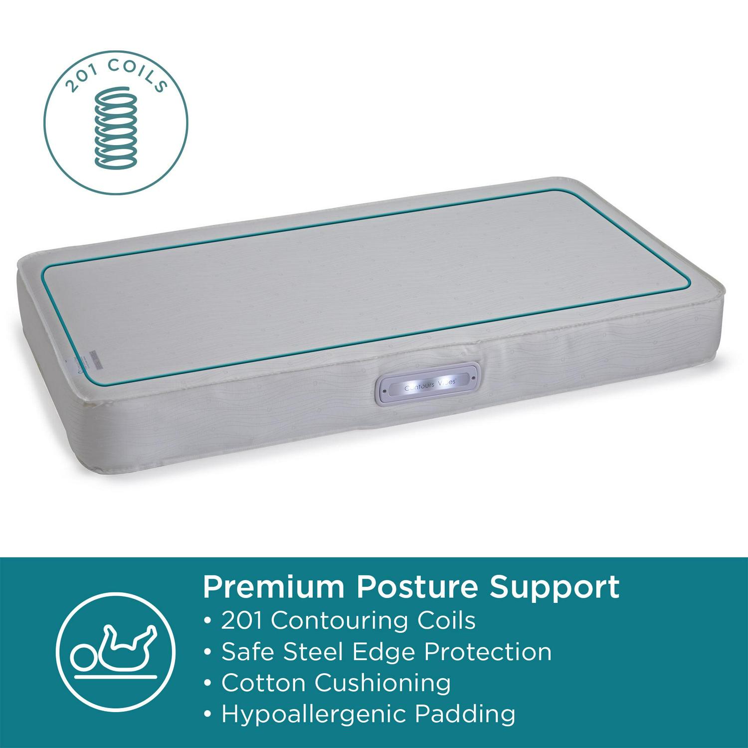 – Over 200 steel innerspring coils and steel frame create resilient contouring support for infants and toddlers for a posture supportive core.