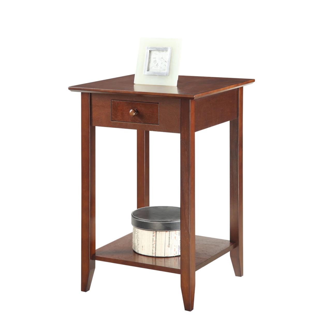American Heritage End Table with Drawer and Shelf, Espresso In a classic American style, that will fit any decor, the American Heritage End Table offers one drawer that provides enough space for small accessories such as keys and remotes. Also featuring an open lower shelf that gives you more room to use for display or storage. Now available in multiple finishes.