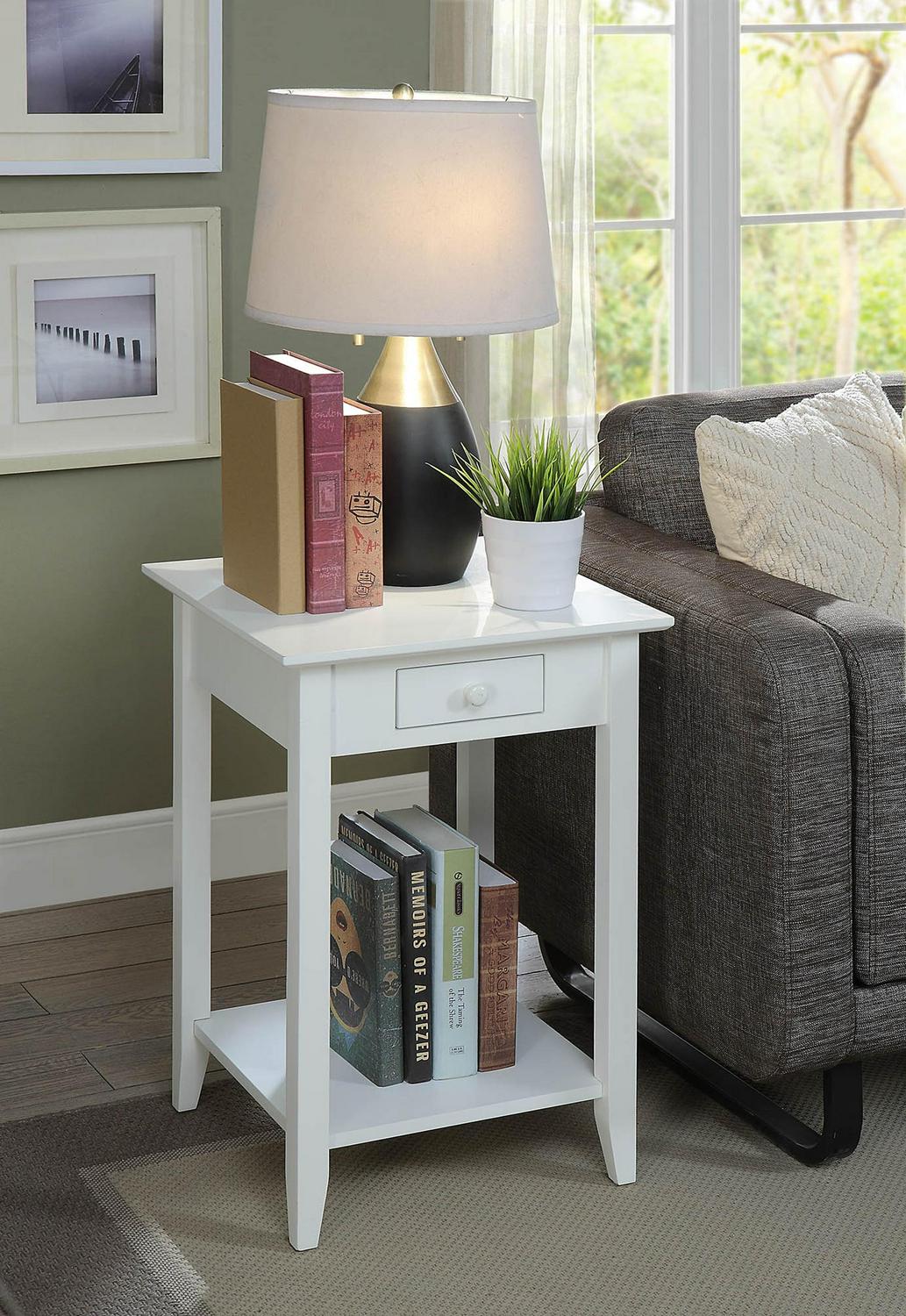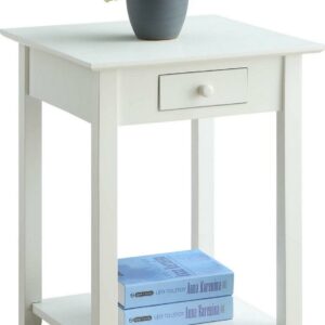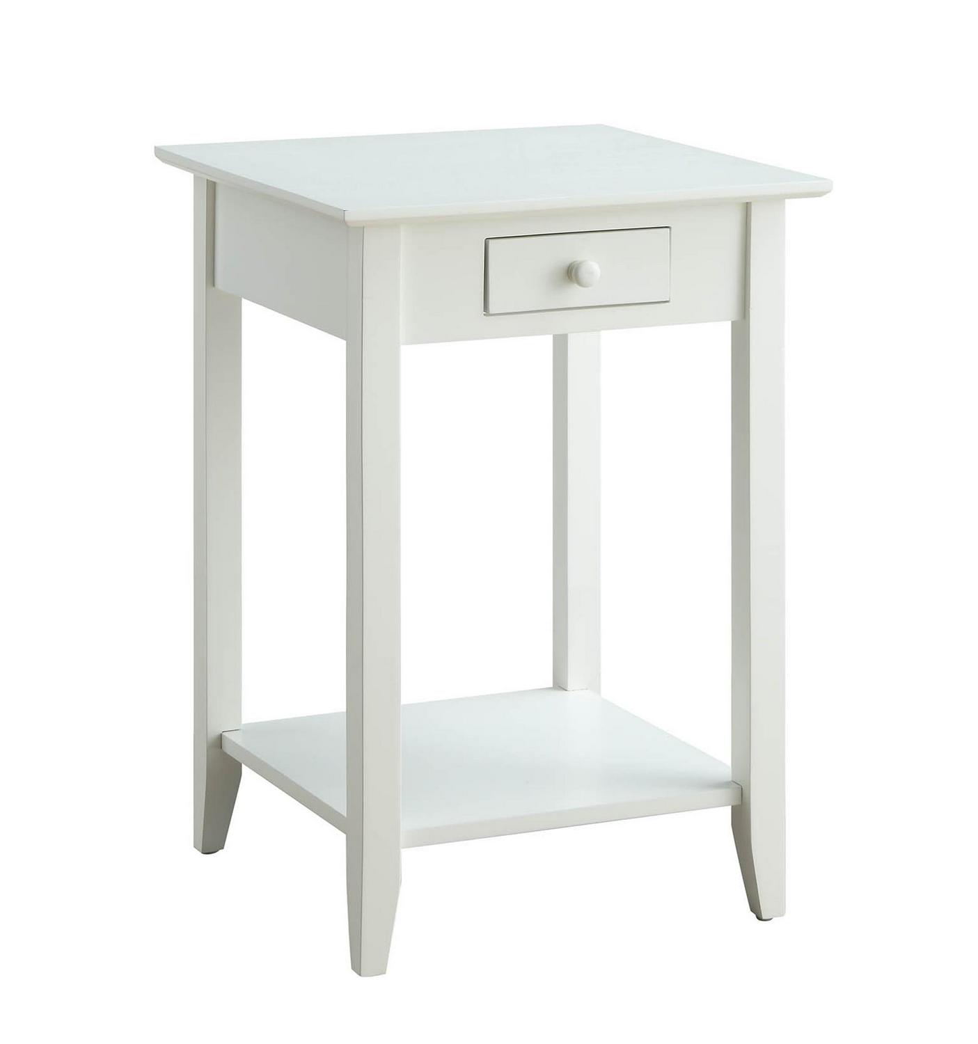 American Heritage End Table with Drawer and Shelf, White In a classic American style, that will fit any decor, the American Heritage End Table offers one drawer that provides enough space for small accessories such as keys and remotes. Also featuring an open lower shelf that gives you more room to use for display or storage. Now available in multiple finishes.