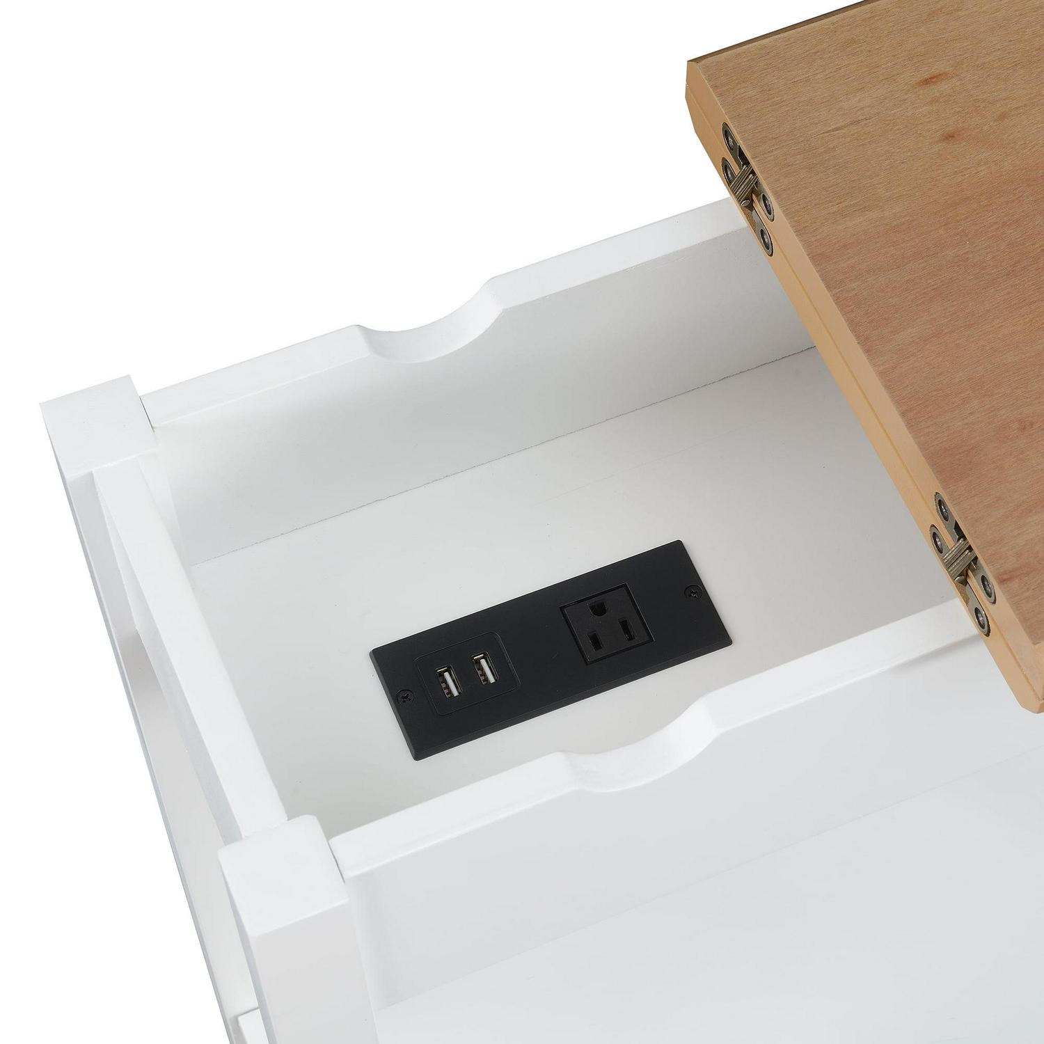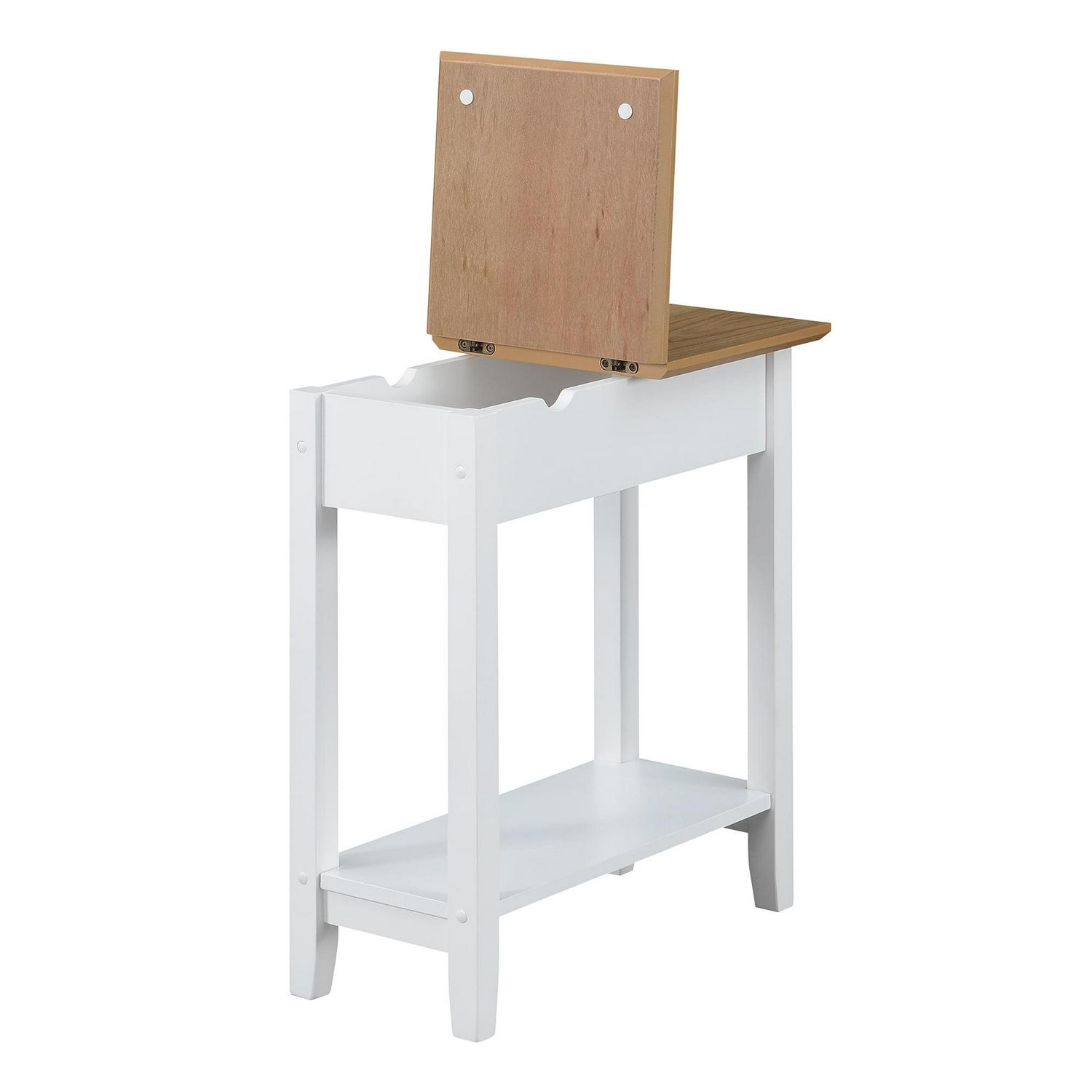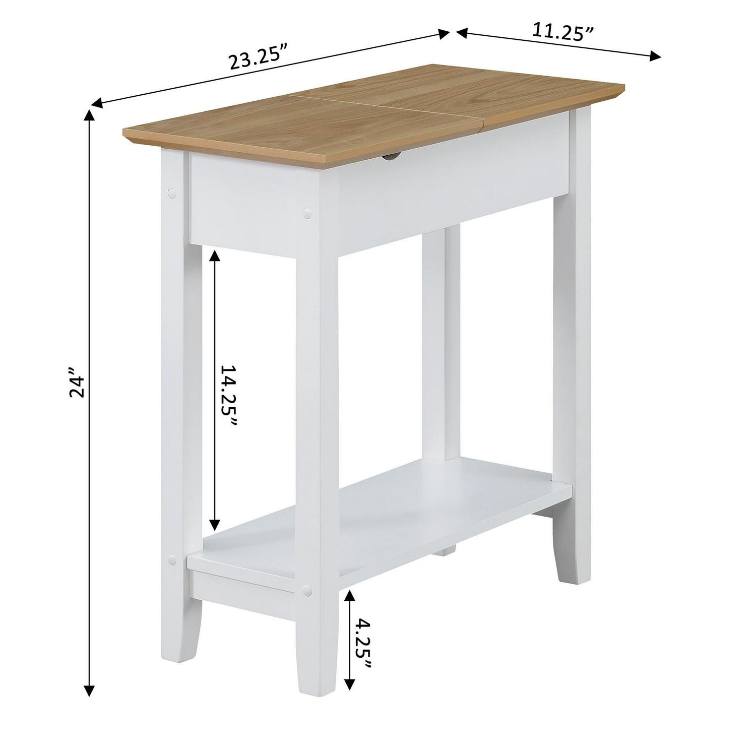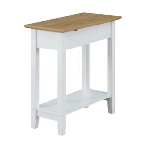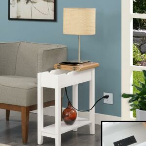 American Heritage Flip Top End Table with Charging Station, Driftwood and White Upgrade your space with the style and functionality of the American Heritage Flip Top End Table with Charging Station. This narrow silhouette features a flip top that reveals a convenient charging station and storage space for your remote controls or favorite book. The charging station includes two standard outlets and two USB ports which can charge your phone, tablet and even your laptop. Also included is a cable management hole, allowing you to store multiple devices without damaging the cords. The power supply cord is 6 feet in length giving you the flexibility needed to display your end table. Style your home with more from the American Heritage Collection by Convenience Concepts, each sold separately.