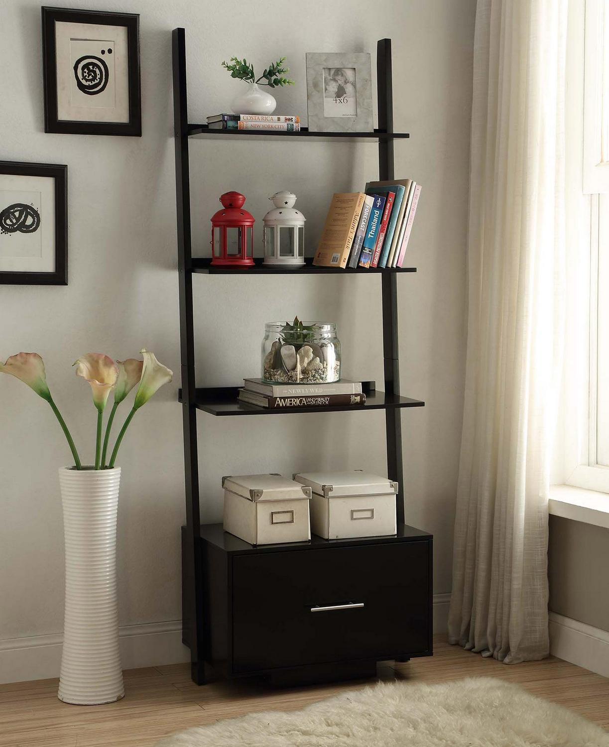 Expand your workspace with this Convenience Concepts American Heritage Ladder Bookcase. It makes an ideal addition to any home or office. It features 4 spacious tiers to store books or display collectibles. It also features a file drawer at the bottom to help keep your area clutter free for a neat and tidy look. The home office bookcase shelves feature a narrow silhouette that creates a visual waterfall effect. Showcase your favorite books, vases and flowers, picture frames, plants, and much more with this Convenience Concepts American Heritage Ladder Bookcase. It comes in a selection of colors, including Black, Dark Walnut, Driftwood, Espresso, Gray and White.