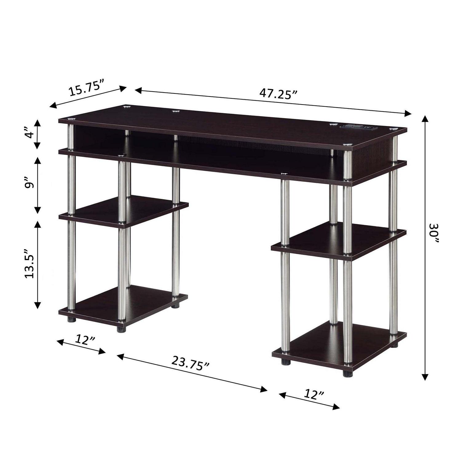 Looking for a place to work or study with a quick and easy set up The Designs2Go No Tools Student Desk with Charging Station by Convenience Concepts is perfect for you! This stylish desk features plenty of storage space with a unique assembly that requires no tools. The charging station conveniently located on the desktop includes two standard outlets and two USB ports which can charge a phone; tablet; laptop and more! Made to be sturdy with stainless-steel poles and a rich finish; this desk is built to last. Great for an office or dorm; this desk is not only for a student but anyone wanting to add simplicity to their workload.