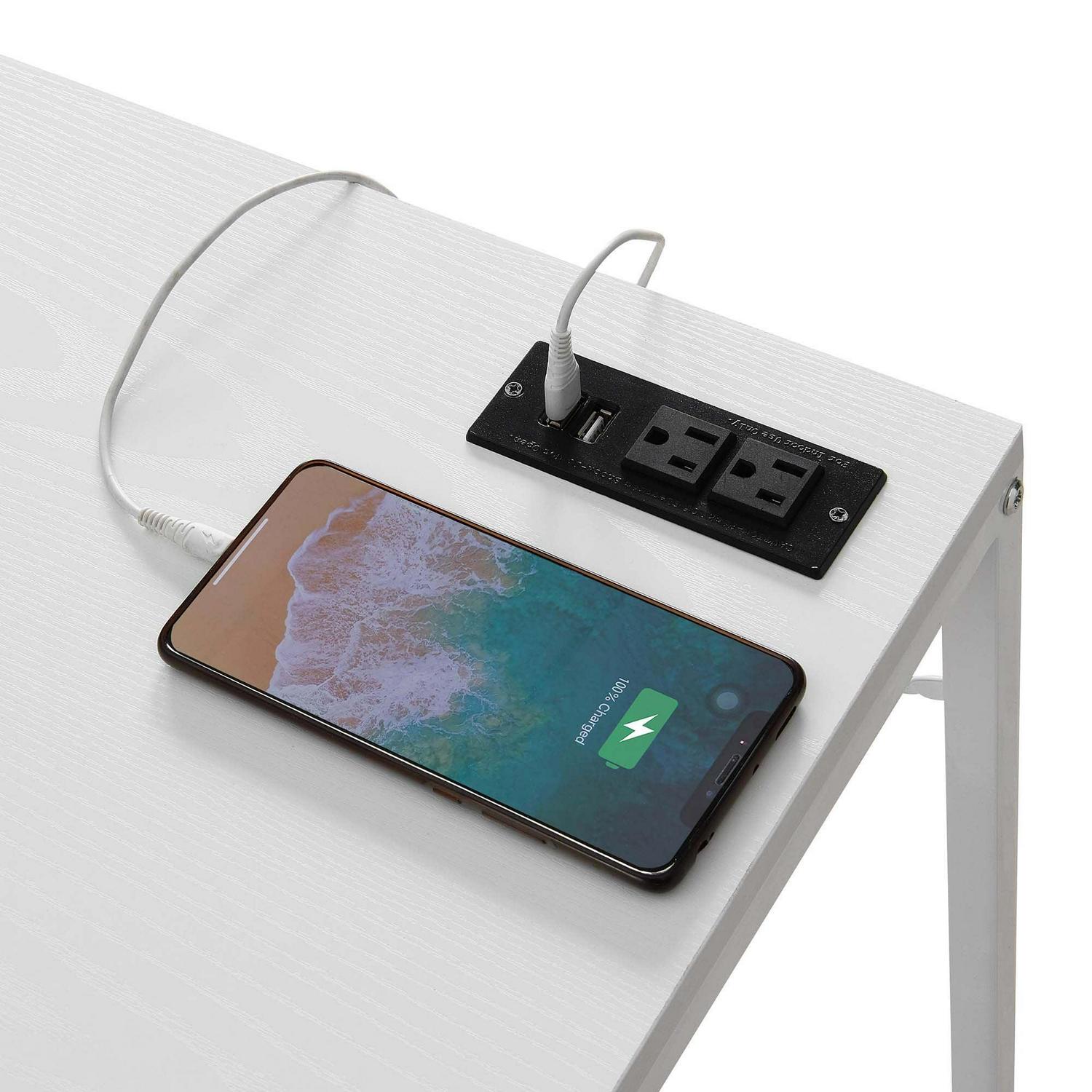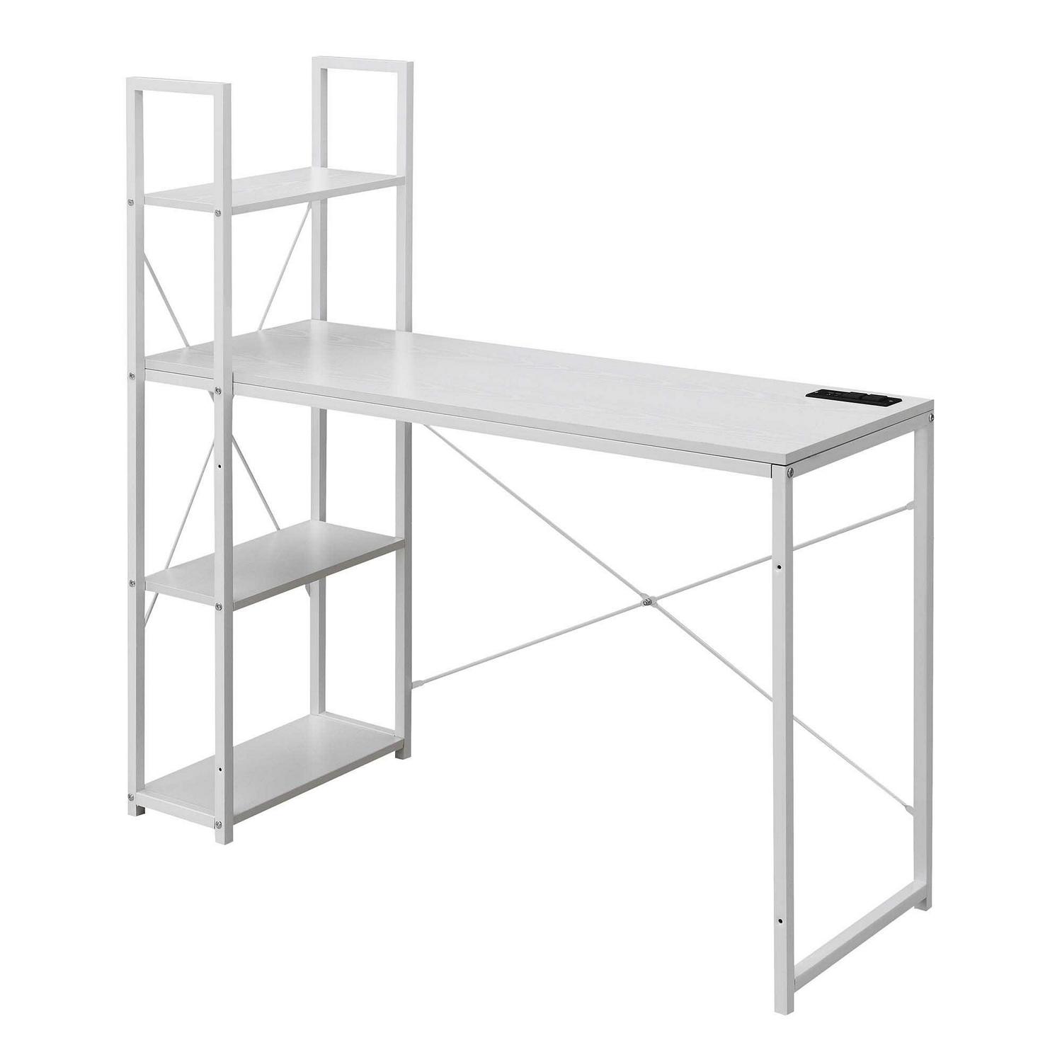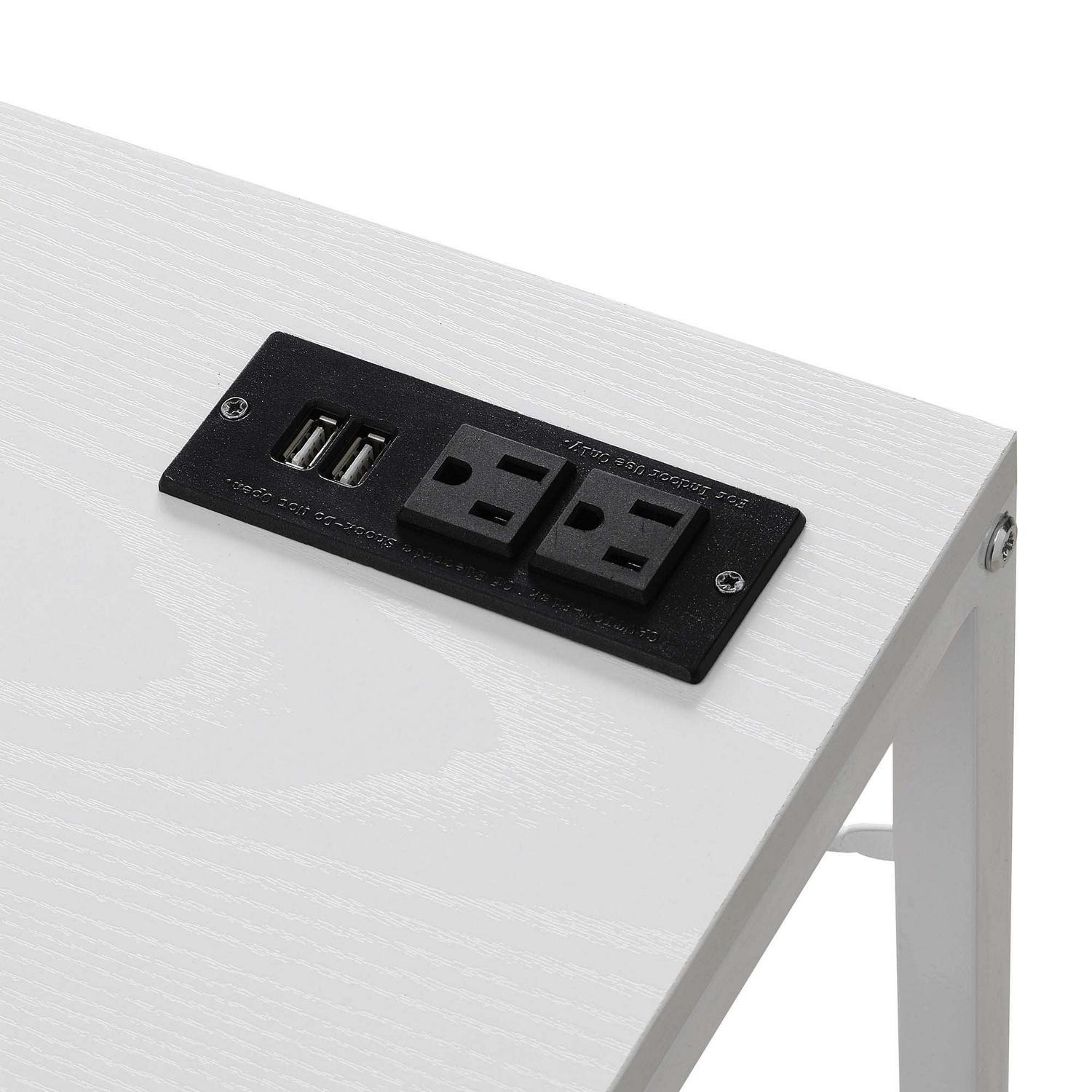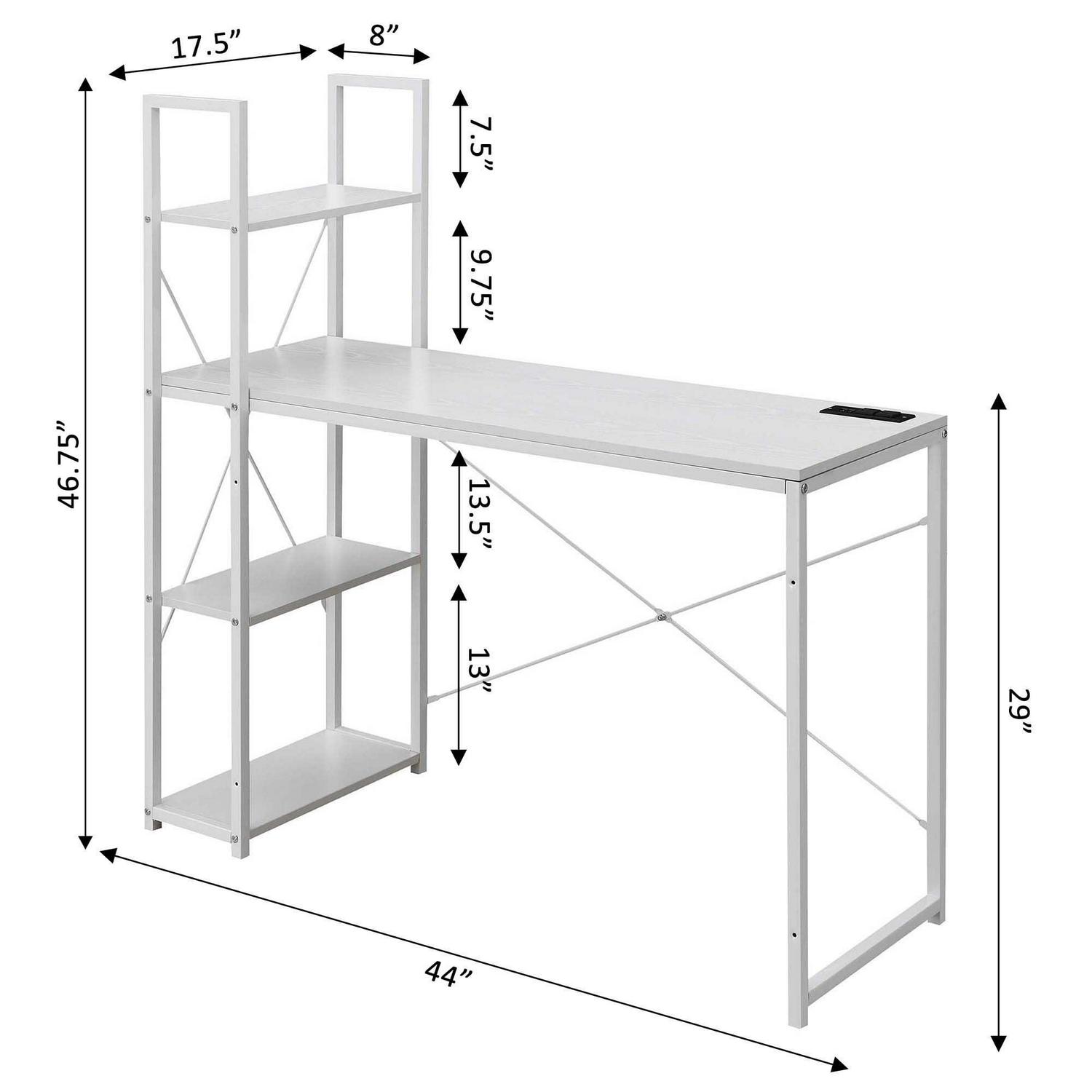 Designs2Go Office Workstation with Charging Station and Shelves, White Give your office the additional space needed with the Designs2Go Office Workstation with Charging Station and Shelves. This desk by Convenience Concepts offers enough room for all your office, work, or schooling essentials. Complete with a charging station including two standard outlets and two USB ports that can easily charge your phone, laptop, and more. The desk s power supply cord is 6 feet in length giving you the flexibility to place your desk where you choose. Thanks to the spacious desktop, room for a computer, lamp and much more will not be an issue. Use the four tiers of versatile shelving for storing books or dcor. Each shelf is engineered from particleboard and supported by a sturdy powder-coated metal frame. Check out the complete Designs2Go Collection by Convenience Concepts, each sold separately.