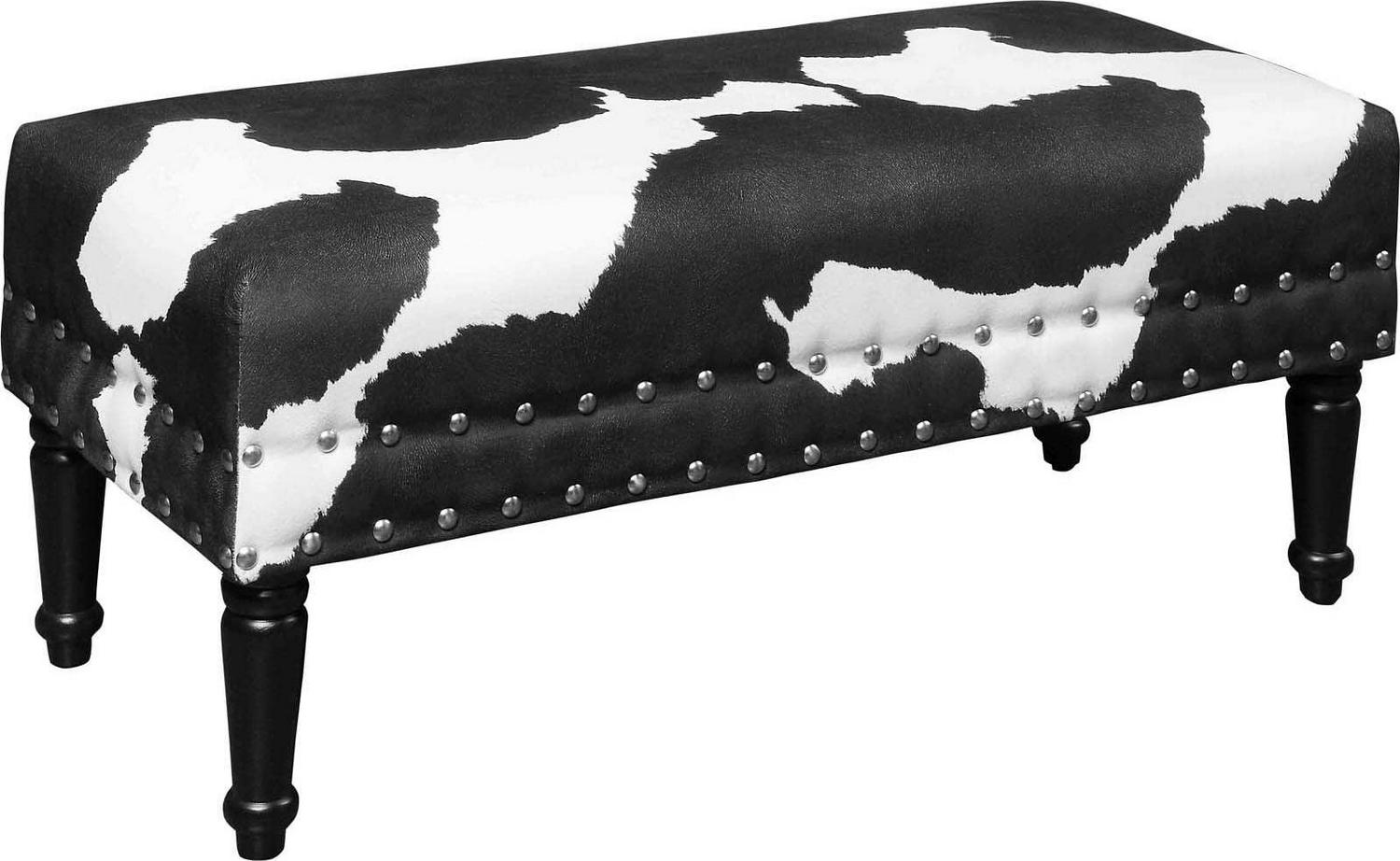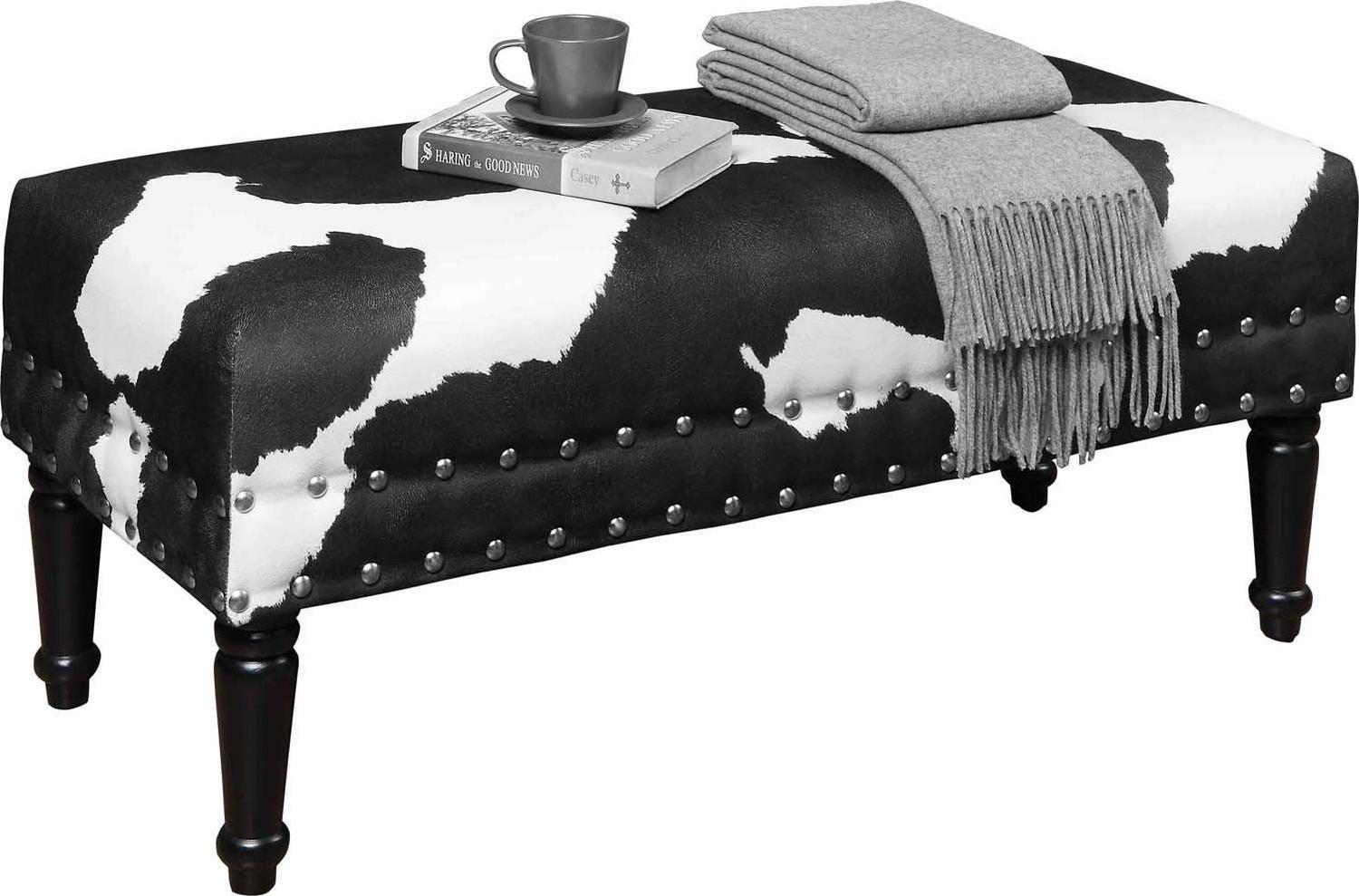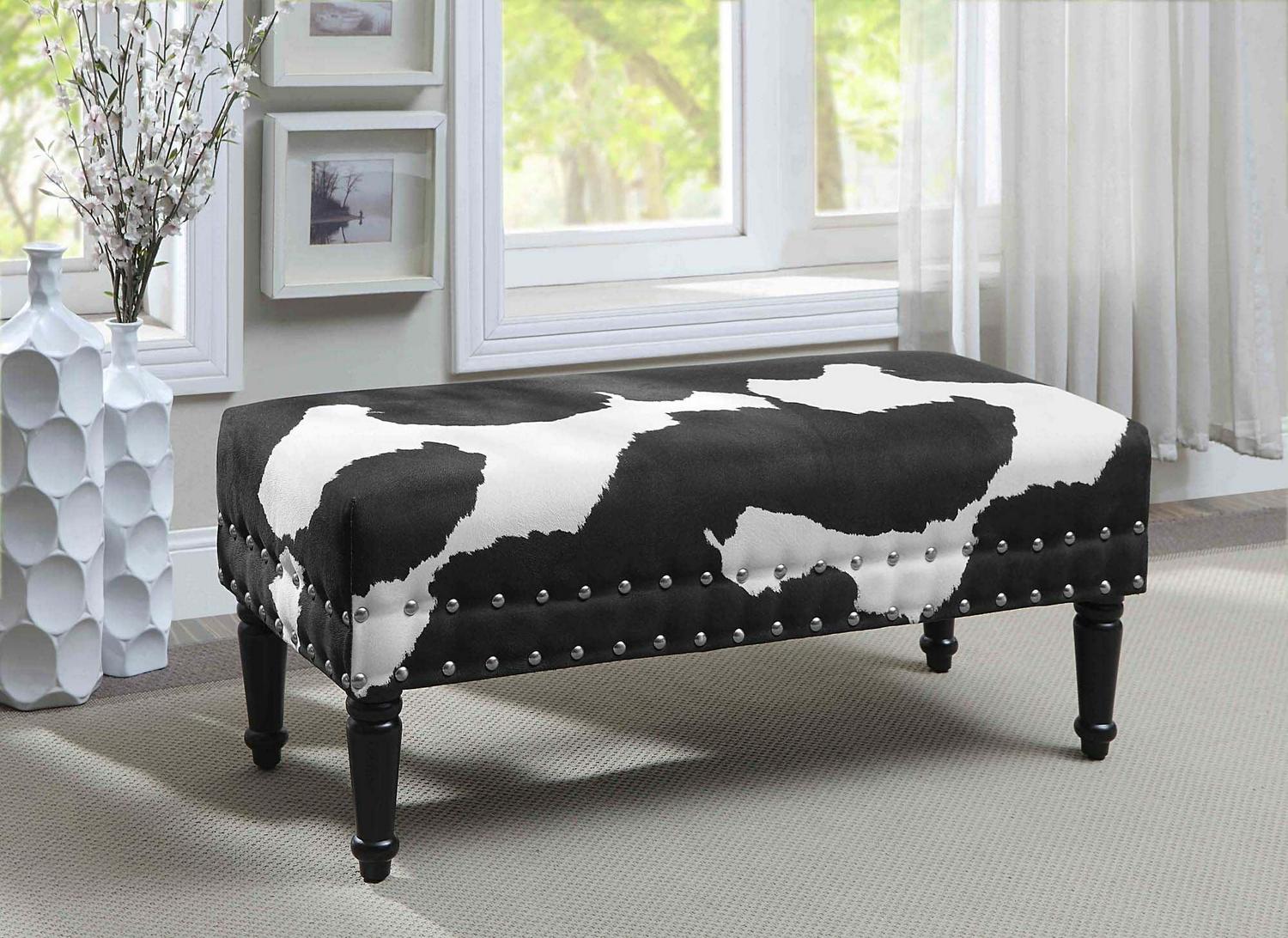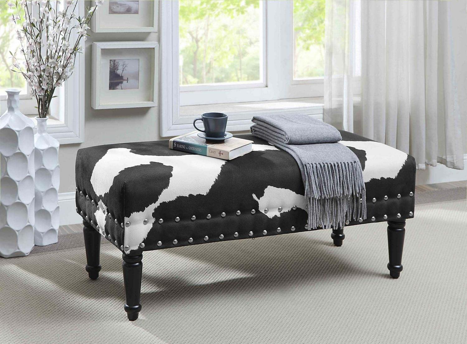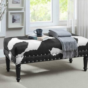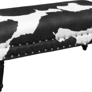 The Designs4Comfort Faux Cowhide Bench with Nailheads will make a bold statement in any modern home. Featuring two rows of nailhead trim that accentuate the cowhide pattern. Whether it is an accent piece or providing additional seating, this piece is a fun way to add a little extra spark to your existing decor.