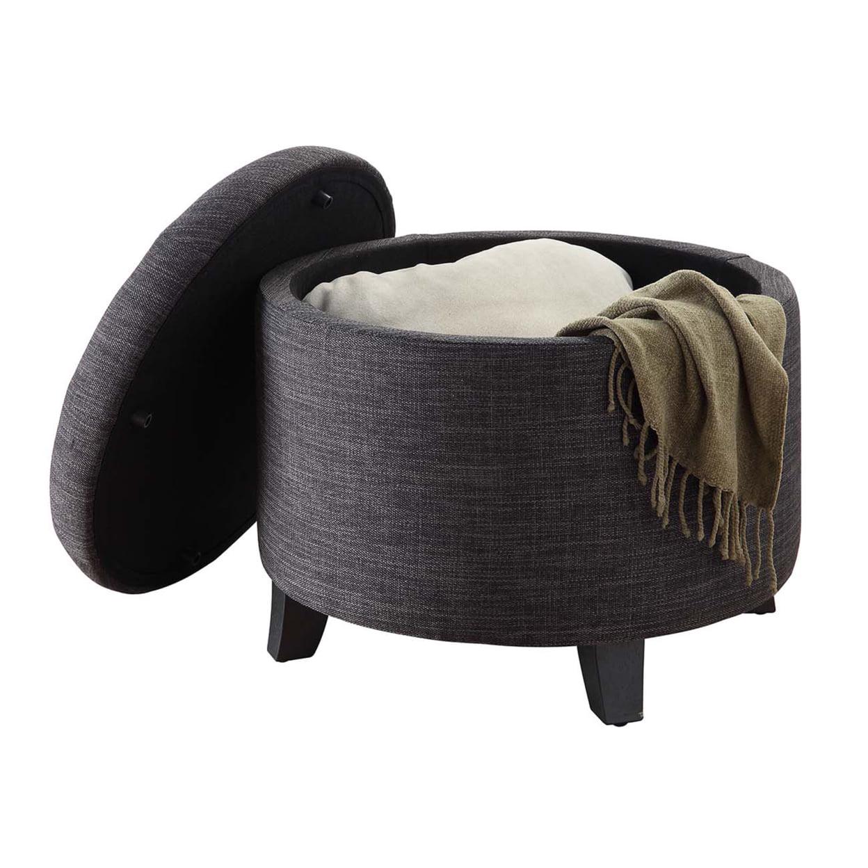 Make a bold statement with the Convenience Concepts Designs4Comfort Faux Linen Round Storage Ottoman in Dark Gray. This transitional ottoman adds stylish functionality to any room in your home. Perfect for small spaces, this ottoman can be paired with your favorite sofa, chair, or can be used as a beautiful decorative accent piece. The lid s dense foam cushion offers maximum comfort when being used as a footrest. Store blankets, pillows, and more in this multi-use piece that features a removable lid for concealed storage. The top of the ottoman lid showcases fine stitching and luxurious button tufting for a neat and firm finish. The frame of this chic footstool is built from plywood and manufactured wood and is upholstered in a variety of rich finishes to choose from. The sturdy legs are also crafted from solid rubberwood, so this piece is sure to last. Assembly after delivery is easy with only the feet needing attachment. Complete your modern home design today with the Designs4Comfort Faux Linen Round Storage Ottoman in Dark Gray from Convenience Concepts.