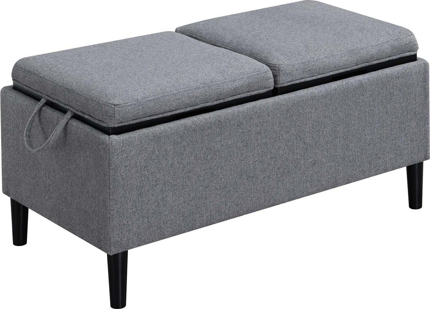 Bring home the unique and multifunctional design of the Designs4Comfort Magnolia Storage Ottoman with Reversible Trays by Convenience Concepts. This stylish modern piece offers two padded cushions making it the perfect ottoman or seat in any space. Remove each top to reveal storage space great for blankets, books, games, or anything you want within arms reach. What sets this piece apart from the rest is that each top cushion flips over as trays and can be used as a coffee table. Each tray is crafted from sturdy manufactured wood and finished with a sleek non-lead-based paint. Cut-out handles can be used to carry the trays while the soft handles are used to flip each cushion around with ease and can be concealed when not in use. Legs are built from solid wood, and the frame is engineered out of durable pine and manufactured wood. The body of this seat are upholstered in a wide variety of fabrics while the dense cushions ensure maximum comfort. Give your space the contemporary flair and functionality it needs with the Designs4Comfort Magnolia Storage Ottoman with Reversible Trays by Convenience Concepts.