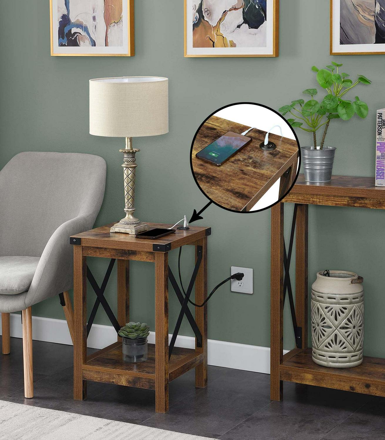 Convenience Concepts Durango End Table with Charging Station and Shelf, Barnwood/Black
